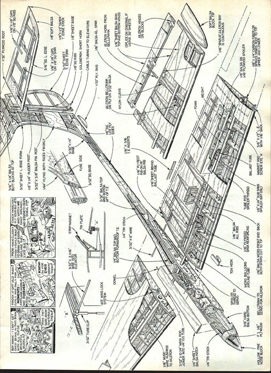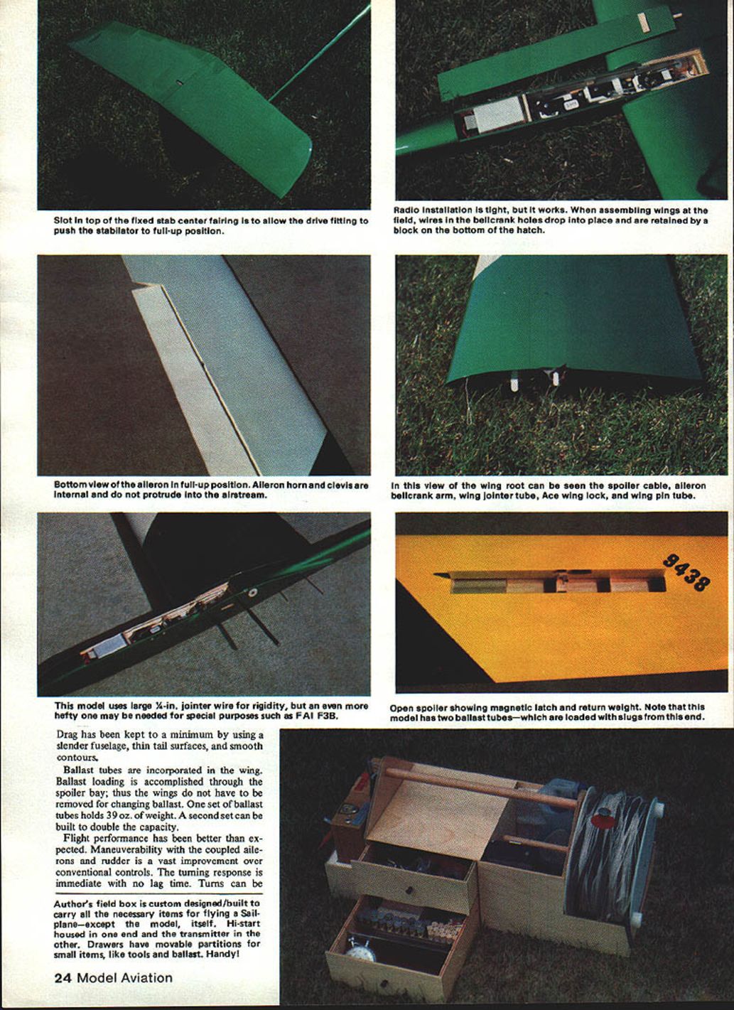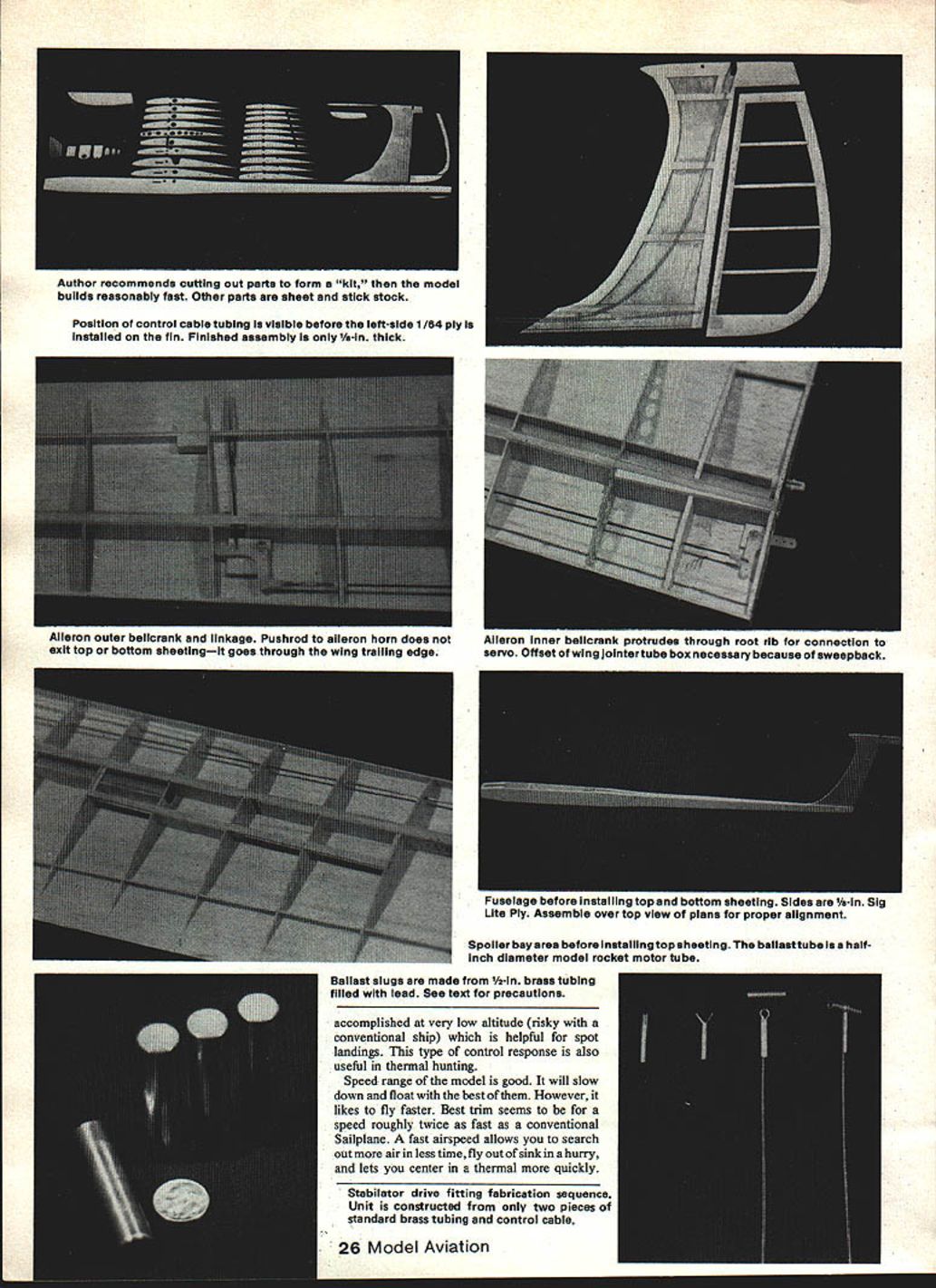 NO OCR TEXT NO OCR TEXT model uses large 4-in jointer wire rigidity hefty may needed special purposes such FAI F3B Drag has kept minimum using slender fuselage thin tail surfaces smooth contours Ballast tubes incorporated wing Ballast loading accomplished through spoiler bay thus wings have removed changing ballast set ballast tubes holds 39 ox weight second set can built double capacity Flight performance has better ex pected Maneuverability coupled aile rons rudder vast improvement over conventional controls turning response immediate no lag time Turns can Authors field box custom designed/built carry necessary items flying Sail planeexcept model itself Hi-start housed end transmitter other Drawers have movable partitions small items like tools ballast Handy 24 Model Aviation Slot top fixed stab center fairing allow drive fitting push stabilator full-up position Radio installation tight works assembling wings fieid wires belicrank holes drop place retained block bottom hatch Bottom view aileron full-up position Aileron horn cievis internal protrude airstream view wing root can seen spoiler cable aileron belicrank arm wing jointer tube Ace wing lock wing pin tube Open spolier showing magnetic latch return weight Note model has two ballast tubeswhich loaded siugs end /32 PLWJWD ROOT BOY RANK CANT GETKNOCK IT OFF OLD MANEPOOR HANK CLARK CHUCK OOXOU3/16 X /4 BALSAII/I6X /8 CAPS BUlT BLOCKS AT TOP OVER BEING IN THIS BOOKGIRLS ARE ONLY FORI WISH COULD JNT FLY YOUR RIZ-JE-IiON /8 50 RIBS ID DRAW UP EVERVAND WATCH MEr BEAUTIFULAIRPLA4E MODELSBIPLANE THEYRAINr BIPLANES-3/32 SHEET L EDGE FORM ARE FOIVEREVER BI1ILTYAJD STARVETO DEATH I/BX 1/4 RUDDER POST kYEAH THEYiiBj$3/32X3/8BALSAFIN POST /64 PLYVD BOTH FACES FIN ONLY 3/16SO LEDGE / HOVJTOBUILDDRAWN 1/16 11/4 CAPS I/B SOFT BALSA ON VB SQ SR I/BX I/2TAPER 3/32 SHEETT EDGE STK 3/32X 31116STRIP MAGNETT EDGE FORM ELEVATOR SHEET BASE GOLDBERGH SHORT HORN 3/32 TUBE CLIP3/3250 BASECABLE TUBING UPTO ELEVATORS / 1/32 PLY SKID1A6 BALSA AlL SPAR 3/32 BALSATOP VBSIGAILERON BELLCRANKAILERON HORN FROM UTE PLYON PLY ON 3/32 BALSABELLCRANK I/16SHEET BALSA SKIN TOPAND BOTTOM WINGS SPLICE ON DLGONALIF ALERON HINGES L16 MUSIC TO AILERON 7/32 X ID 1/4 MAIN ROD JOINER INTO 1/4 OD TUBE BALSA HAICH 1/16 SPARATAILERON BAY 1/8 BALSA ON- HOLLOW PINEF 1 I/BBELLCRANKTOI/16BALSA WEBS FRONTAND BACKI/BXL/4SUB SFRMAGNETAND3/B 1 V2 L ESPRUCESPARS RCOT1OTIP NOSE BLOCKPLYWOODSERVO FOR AILERONBOTH SPARS OUT TO TIPSPOILER BAY ONLYSCREW EYE AWITH 1/16 BACUPPER AND LOWER Position control cable tubing visible before left-side 1/64 ply installed fin Finished assembly 1/a-ln thick Spoiler baysres before installing topaheeting bailsattube isa haif inch diameter model rocket motor tube Ballast slugs made 1/t-in brass tubing filled lead See text precautions accomplished very low altitude risky conventional ship helpful spot landings type control response also useful thermal hunting Speed range model good will slow down float best However likes fly faster Best trim seems speed roughly twice fast conventional Sailplane fast airspeed allows search out air less time fly out sink hurry lets center thermal quickly Stabilator drive fitting fabrication sequence Unit constructed two pieces standard brass tubing control cable 26 Model Aviation Author recommends cutting out parts form kit model builds reasonably fast Other parts sheet stick stock Aileron Outer belicrank linkage Pushrod aileron horn does exit top bottom sheetingit goes through wing trailing edge Aileror Irunur DumucranK prosruacs snrougn root ri connection servo Offset wing jointertube box necessary because sweepback Fuselage before in, u uuuum 5flUUIIfl9 omaus V51fl 019 Lite Ply Assemble ova top view plans proper alignment TI-WEADESGOLDBERGCROSS SECTION OP COUPLERMINI-LINKWINS T PAT SPAR7 SAPPORT RIR2P3RHRNR6R7/R-BR9RIORilRIORID814RISRIBR17 F L IN VERTICAL SPACE BETWEN1/18 VERT ORAlS/ BUILSINS SPACER TLSE -TOP B BOTTOM WITH /4 BABALSA WEBBNG1/5 IS BALLAST TUBAS REARWINGSHEETS REAR BALLASTTUBE IS OPTIONAL CARDBOARD/4 OZ SPOILERI/4 /8 BALSA TUBE SUPPORTROCKET MOTOR TUBESRETLRN WTSOB-SPAR U/H BALSAF LLER BEVEL BOTTOM SHEETINS BEPORE APPLVNO TOP S HE PT IN S 1/18 I/B SPOILER SAPT ALERON HORNMAKE PROM BEILCRANK ARMB-B SPOILER BLASE I/B BALSA LAMINATES WITH 1/64 PLY ON BOTTOM PLY INSERT IN 18 BALSA RIB RI CAT OAT IN PLV OLE ROOT RIBCO_ I/B HOLE09 HOLE R3 GD0 I/B I/O STRIP MOONEY SLUED TO SPOILER BLASEU/3D RIBS TO LATCHING TO TIN PLATE MOUNTED ON BALBA BLOCKSUPPORT HORN I/BI/SU/S TE STOCK/35 PLY SCREW3/32 DEl3/H BRASS TAREU/IA SOROOT RIBS EYE JOINER WRE SI MASC WIRE RBUNINOUDI ER- 7/OS DIA 0 I/H/8 00 ______REAR WINS PIN- U/OS GA B STAB JOINER ISI-U/DSOIAU-II/IB STABILATOR I/H SOPT BALSA RIO I/B I/U TAPEREDFlEES STAB TRAILING EDGE STOCKPAIRINS UB H [HSPAR I/H DO [ 1/18 /4 AI/lB 1/4RIBS- I/B SO CAPPED WYR 1/16 I/B STRIP STAB SECTION A-A B-Il 1 LY SIDES __________ PILL IN VOIDS AROUND WINO TAREI/US PLY HERE REMAININGDRIVE FITTING DETAIL3/35 SHEET N-HOD- OIDS WITH MICRO8ALLOS MIXED WITH LOT 3/IB- -—DEEP V4 OSRRIMP SIDESI/B U/B SDTAREU/US AD TUBEf/ WING TUBE DETAILPREPARATION DE FRONT /3DB/H CABLEVIEW VIEWyR B/H BELLCRANK ARMI U/OS HORNI GD-SUPPORT RIBR-IH....JI/B SO RBRIBS 7—7US-I/H WING DIHEDRAL DETAIL 2-1/4 HORN MADE FROMCLEVIS BELLCRANK ARM 1/64 PLY BOTH SIDES U/US SECURE CABLE TUBINGSHEET /4 SHEET-HATCHAILERON LINKAGEBELLCRANKSLOTENTIRE LENGTH OP PUSELASERUDDER PINE NOSE BLOCK RETAINERBLOCKU/16 SHEETTOP B BOTTOMSHEETING HOLLOW OAT PAR 450MAHCELLS SPRACESERVO RAILSI/N DOWEL I/B SHEETINGCROSS GRAINU/US I/H NOSE WEIAHY5 _____ _____ S SHEETING/I/B SHEETNOTCH YE P-I-- P-N -Bpq~U/EON RIBS i---/ ACE RECEIVER I/H TRI STOCK ELEVSPOILERAILERONAG BELLY GLASSED WITH U/H 02 1/4 SHEET CLOTH B RESIN I/B EYELET~~\ 7 U/3D PLYU/lB TING K TOWHAOKI/B S BRASS TUBE I/BsHEETINS/FUSELAGE SIDE VIEW 1/16 PLY ROOT BIB U/US OHEETINGU/US SO I/US PLY SKID wIvN BATTERYRECEIVERI/H AD BRASS\CE WING ATTACH TABE EM VIR PLY ELENI CABLE 44 HOLEBAD CABLEI/B SHEETINSU/US SH