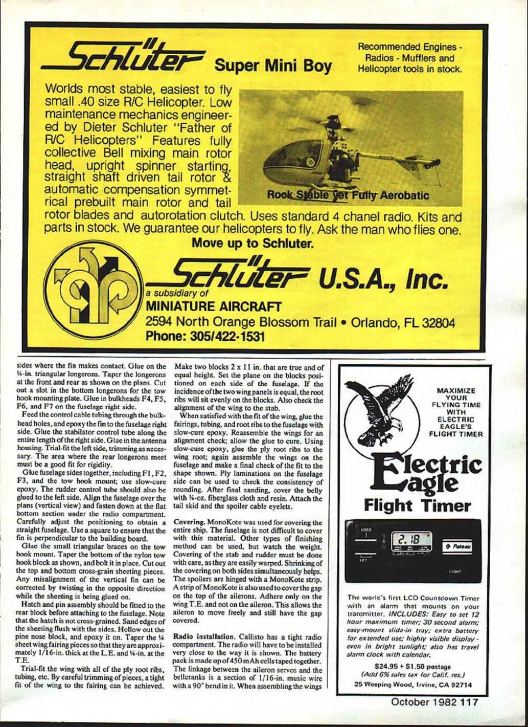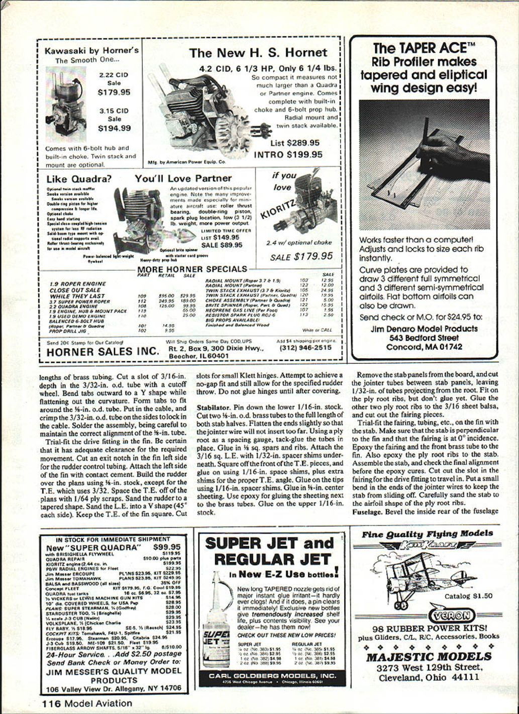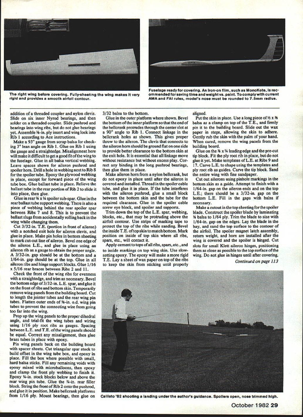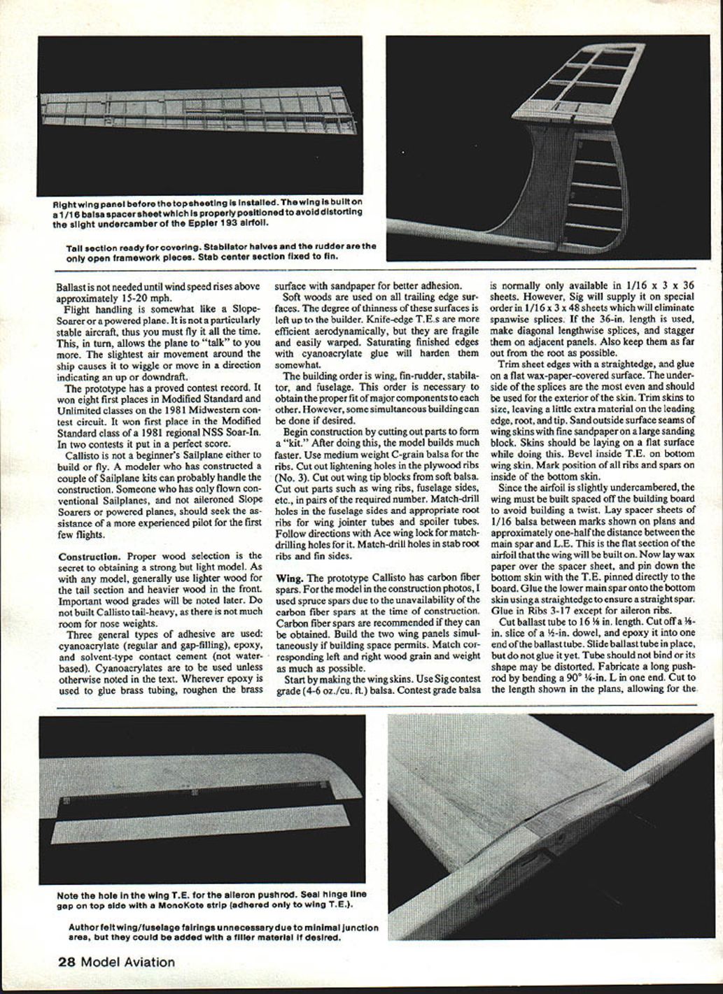NO OCR TEXT NO OCR TEXT model uses large 4-in jointer wire rigidity hefty may needed special purposes such FAI F3B Drag has kept minimum using slender fuselage thin tail surfaces smooth contours Ballast tubes incorporated wing Ballast loading accomplished through spoiler bay thus wings have removed changing ballast set ballast tubes holds 39 ox weight second set can built double capacity Flight performance has better ex pected Maneuverability coupled aile rons rudder vast improvement over conventional controls turning response immediate no lag time Turns can Authors field box custom designed/built carry necessary items flying Sail planeexcept model itself Hi-start housed end transmitter other Drawers have movable partitions small items like tools ballast Handy 24 Model Aviation Slot top fixed stab center fairing allow drive fitting push stabilator full-up position Radio installation tight works assembling wings fieid wires belicrank holes drop place retained block bottom hatch Bottom view aileron full-up position Aileron horn cievis internal protrude airstream view wing root can seen spoiler cable aileron belicrank arm wing jointer tube Ace wing lock wing pin tube Open spolier showing magnetic latch return weight Note model has two ballast tubeswhich loaded siugs end /32 PLWJWD ROOT BOY RANK CANT GETKNOCK IT OFF OLD MANEPOOR HANK CLARK CHUCK OOXOU3/16 X /4 BALSAII/I6X /8 CAPS BUlT BLOCKS AT TOP OVER BEING IN THIS BOOKGIRLS ARE ONLY FORI WISH COULD JNT FLY YOUR RIZ-JE-IiON /8 50 RIBS ID DRAW UP EVERVAND WATCH MEr BEAUTIFULAIRPLA4E MODELSBIPLANE THEYRAINr BIPLANES-3/32 SHEET L EDGE FORM ARE FOIVEREVER BI1ILTYAJD STARVETO DEATH I/BX 1/4 RUDDER POST kYEAH THEYiiBj$3/32X3/8BALSAFIN POST /64 PLYVD BOTH FACES FIN ONLY 3/16SO LEDGE / HOVJTOBUILDDRAWN 1/16 11/4 CAPS I/B SOFT BALSA ON VB SQ SR I/BX I/2TAPER 3/32 SHEETT EDGE STK 3/32X 31116STRIP MAGNETT EDGE FORM ELEVATOR SHEET BASE GOLDBERGH SHORT HORN 3/32 TUBE CLIP3/3250 BASECABLE TUBING UPTO ELEVATORS / 1/32 PLY SKID1A6 BALSA AlL SPAR 3/32 BALSATOP VBSIGAILERON BELLCRANKAILERON HORN FROM UTE PLYON PLY ON 3/32 BALSABELLCRANK I/16SHEET BALSA SKIN TOPAND BOTTOM WINGS SPLICE ON DLGONALIF ALERON HINGES L16 MUSIC TO AILERON 7/32 X ID 1/4 MAIN ROD JOINER INTO 1/4 OD TUBE BALSA HAICH 1/16 SPARATAILERON BAY 1/8 BALSA ON- HOLLOW PINEF 1 I/BBELLCRANKTOI/16BALSA WEBS FRONTAND BACKI/BXL/4SUB SFRMAGNETAND3/B 1 V2 L ESPRUCESPARS RCOT1OTIP NOSE BLOCKPLYWOODSERVO FOR AILERONBOTH SPARS OUT TO TIPSPOILER BAY ONLYSCREW EYE AWITH 1/16 BACUPPER AND LOWER Position control cable tubing visible before left-side 1/64 ply installed fin Finished assembly 1/a-ln thick Spoiler baysres before installing topaheeting bailsattube isa haif inch diameter model rocket motor tube Ballast slugs made 1/t-in brass tubing filled lead See text precautions accomplished very low altitude risky conventional ship helpful spot landings type control response also useful thermal hunting Speed range model good will slow down float best However likes fly faster Best trim seems speed roughly twice fast conventional Sailplane fast airspeed allows search out air less time fly out sink hurry lets center thermal quickly Stabilator drive fitting fabrication sequence Unit constructed two pieces standard brass tubing control cable 26 Model Aviation Author recommends cutting out parts form kit model builds reasonably fast Other parts sheet stick stock Aileron Outer belicrank linkage Pushrod aileron horn does exit top bottom sheetingit goes through wing trailing edge Aileror Irunur DumucranK prosruacs snrougn root ri connection servo Offset wing jointertube box necessary because sweepback Fuselage before in, u uuuum 5flUUIIfl9 omaus V51fl 019 Lite Ply Assemble ova top view plans proper alignment TI-WEADESGOLDBERGCROSS SECTION OP COUPLERMINI-LINKWINS T PAT SPAR7 SAPPORT RIR2P3RHRNR6R7/R-BR9RIORilRIORID814RISRIBR17 F L IN VERTICAL SPACE BETWEN1/18 VERT ORAlS/ BUILSINS SPACER TLSE -TOP B BOTTOM WITH /4 BABALSA WEBBNG1/5 IS BALLAST TUBAS REARWINGSHEETS REAR BALLASTTUBE IS OPTIONAL CARDBOARD/4 OZ SPOILERI/4 /8 BALSA TUBE SUPPORTROCKET MOTOR TUBESRETLRN WTSOB-SPAR U/H BALSAF LLER BEVEL BOTTOM SHEETINS BEPORE APPLVNO TOP S HE PT IN S 1/18 I/B SPOILER SAPT ALERON HORNMAKE PROM BEILCRANK ARMB-B SPOILER BLASE I/B BALSA LAMINATES WITH 1/64 PLY ON BOTTOM PLY INSERT IN 18 BALSA RIB RI CAT OAT IN PLV OLE ROOT RIBCO_ I/B HOLE09 HOLE R3 GD0 I/B I/O STRIP MOONEY SLUED TO SPOILER BLASEU/3D RIBS TO LATCHING TO TIN PLATE MOUNTED ON BALBA BLOCKSUPPORT HORN I/BI/SU/S TE STOCK/35 PLY SCREW3/32 DEl3/H BRASS TAREU/IA SOROOT RIBS EYE JOINER WRE SI MASC WIRE RBUNINOUDI ER- 7/OS DIA 0 I/H/8 00 ______REAR WINS PIN- U/OS GA B STAB JOINER ISI-U/DSOIAU-II/IB STABILATOR I/H SOPT BALSA RIO I/B I/U TAPEREDFlEES STAB TRAILING EDGE STOCKPAIRINS UB H [HSPAR I/H DO [ 1/18 /4 AI/lB 1/4RIBS- I/B SO CAPPED WYR 1/16 I/B STRIP STAB SECTION A-A B-Il 1 LY SIDES __________ PILL IN VOIDS AROUND WINO TAREI/US PLY HERE REMAININGDRIVE FITTING DETAIL3/35 SHEET N-HOD- OIDS WITH MICRO8ALLOS MIXED WITH LOT 3/IB- -—DEEP V4 OSRRIMP SIDESI/B U/B SDTAREU/US AD TUBEf/ WING TUBE DETAILPREPARATION DE FRONT /3DB/H CABLEVIEW VIEWyR B/H BELLCRANK ARMI U/OS HORNI GD-SUPPORT RIBR-IH....JI/B SO RBRIBS 7—7US-I/H WING DIHEDRAL DETAIL 2-1/4 HORN MADE FROMCLEVIS BELLCRANK ARM 1/64 PLY BOTH SIDES U/US SECURE CABLE TUBINGSHEET /4 SHEET-HATCHAILERON LINKAGEBELLCRANKSLOTENTIRE LENGTH OP PUSELASERUDDER PINE NOSE BLOCK RETAINERBLOCKU/16 SHEETTOP B BOTTOMSHEETING HOLLOW OAT PAR 450MAHCELLS SPRACESERVO RAILSI/N DOWEL I/B SHEETINGCROSS GRAINU/US I/H NOSE WEIAHY5 _____ _____ S SHEETING/I/B SHEETNOTCH YE P-I-- P-N -Bpq~U/EON RIBS i---/ ACE RECEIVER I/H TRI STOCK ELEVSPOILERAILERONAG BELLY GLASSED WITH U/H 02 1/4 SHEET CLOTH B RESIN I/B EYELET~~\ 7 U/3D PLYU/lB TING K TOWHAOKI/B S BRASS TUBE I/BsHEETINS/FUSELAGE SIDE VIEW 1/16 PLY ROOT BIB U/US OHEETINGU/US SO I/US PLY SKID wIvN BATTERYRECEIVERI/H AD BRASS\CE WING ATTACH TABE EM VIR PLY ELENI CABLE 44 HOLEBAD CABLEI/B SHEETINSU/US SH