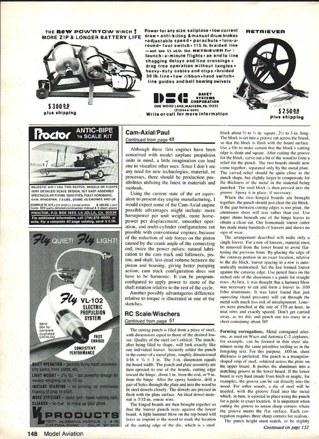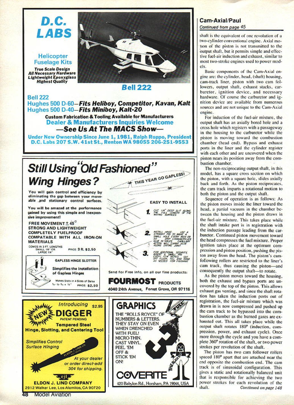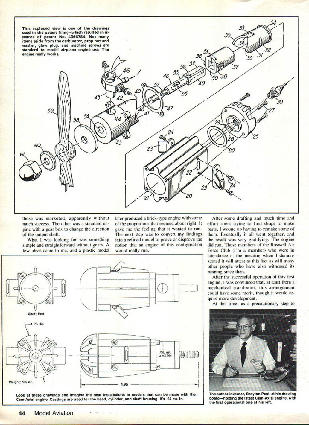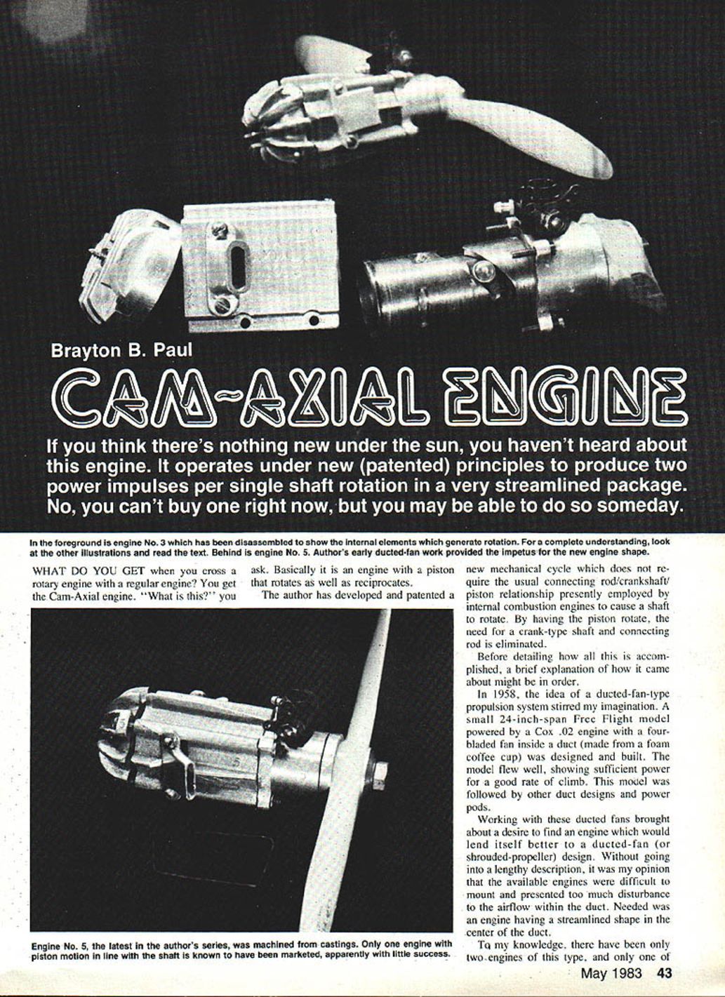In foreground engine No 3 has disassembled show internal elements wnicn generate rotation i-or compiete unoerstanaing lOOK other illustrations read text Behind engine No 5 Authors early ducted-fan work provided impetus new engine shape WHAT DO YOU GET cross rotary engine regular engine get Cam-Axial engine What ask Basically engine piston rotates well reciprocates author has developed patented new mechanical cycle does re quire usual connecting rodcrankshaft/ piston relationship presently employed internal combustion engines cause shaft rotate having piston rotate need crank-type shaft connecting rod eliminated Before detailing accom plished brief explanation came about might order 1958 idea ducted-fan-type propulsion system stirred imagination small 24-inch-span Free Flight model powered Cox 02 engine four bladed fan inside duct made foam coffee cup designed built model flew well showing sufficient power good rate climb mood followed other duct designs power pods Working ducted fans brought about desire find engine would lend itself better ducted-fan shrouded-propeller design Without going lengthy description opinion available engines difficult mount presented too much disturbance airflow within duct Needed engine having streamlined shape center duct TQ knowledge have twoengines type May1983 43 Engine No 5 latest authors series machined castings Only engine piston motion line shaft known have marketed apparently little success marketed apparently much success other standard en gine gear box change direction uf output shaft What looking something simple straightforward gears few ideas came plastic model later produced brick-type engine some proportions seemed about right gave feeling wanted run next step convert findings refined model prove disprove notion engine configuration would really run / N 0 Co V Cj Shaft End \ 1 75 dia N ) Weight 9% oz __ V 495 0 ElK Look drawings imagine neat installations models can made Cam-Axial engine Castings used head cylinder shaft housing Its 24 cu After some drafting much time effort spent trying find shops make parts wound up having remake some Eventually went together result very gratifying engine did run members Roswell Air Force Club Im member attendance meeting demon strated will attest fact will other people have also witnessed its running since After successful operation first engine convinced least mechanical standpoint arrangement could have some merit though would re quire development time precautionary step 44 Model Aviation exploded view drawings used patent filingwhich resulted suance patent No 4366784 items aside carburetor prop nut washer glow plug machine screws standard model airplane engine use engine really works ii N author/inventor Paul nis arawing boardholding latest Cam-Axial engine first operational left Cutaway basic Cam-Axial engine com ponents can wonder present what its future will though author notes number possibilities text drawings show important difference between Cam-Axial engine others Cam-Axial above note constant moment arm force M applied two places around shaft center cranktype belowl changing moment arm 0 stroke/2 produces wasteful side forces \ Side Force - On Piston t 7 C M prevent possible infringement some ones patent safeguard idea 1 decided good time try see patent would possible found patent attorney subsequently US Patent No 4366784 issued patent application being formulated being processed went ahead new ideas improving en gine made pattern cylinder head shaft housing help friend two sets aluminum castings made work out improvements machining procedures first made another plastic model experience able machine parts myself / Ill - / 7 / 7/ /U 1 /7/ Fortunately able obtain used Atlas lathe go along small Sears lathe old drill press Probably difficult part making engines figure out just go about machining parts necessary pre-plan operation ad vance assure success couldnt afford spoil castings other parts because difficulty time involved get re placements Various small tools fixtures setups used also made good advantage engine works may help refer photos drawings engine cam-induced piston rotation directly drives output shaft Two piston power strokes produce complete 3600 rotation shaft other words revolution Continued page 48 L;~ upper drawing position piston shaft fuel induction lower drawing burnt fuel exhausted fresh fuel mixture bypassed combustion chamber May 1983 45 M -J N Shaft M Happily purring away authors first opera tional engine piston rotates recipro cates Its new principle Still Using bid Fashioned L4/ing Hinges s SS well gain control efficiency eliminating gap between moveable nd stationary control surfaces will amazed performance gained using simple inexpen sive improvement FREE MOVEMENT 450 STRONG AND LIGHTWEIGHT COMPLETELY FUELPROOF COMPATABLE WITH ALL IRON-ON MATER IALS COMES IN 3 FT LENGTHS SMALL 1808PRICE 3 ft $250 LARGE 14 Introducing $295 T0DIGGER PATENT PENDING Tempered Steel HInge Slotting Centering Tool dealer order direct ~add 300 shipping w ELDON J LIND COMPANY 2912 Walker Lee Los Alamitos CA 90720 U MO0l Aviation Simplifies Control Svr face Hfnging EASYTO INSTALL INSTALL IIWGE OSE IGHT PIN TO MAKE -SM4LL ROLE EVERY il/CR OR SO OR/P CYAAOACRYLATE GLLE IN HOLES CAPILLARY ACOON WILL CARRY GLUE A/ORG FRY/PR JO/NT -3 FOR ADDITIONAL SEOJRITi P/SE/PT SMALL PIN EVERY FEW INCHESCUT OFF FLUSII FILL AND SAND AS NEEDED FOR FIPISRING Send Free Info fine products FOURMOST PRODUCTS 4040 24th Avenue Forest Grove OR 97116 t CUT 1/4 DEEP SLIT ALOND TAR F/ILL LENGTH LR THE MATING NJRFACES Cam-Axial/Paul Continued paqe 45 shaft equivalent revolution two-cylinder conventional engine Axial mo tion piston transmitted output shaft permits simple effec tive fuel-air induction exhaust similar two-stroke engines used power mod els Basic components Cam-Axial en gine cylinder head shaft housing cam-track liner piston two cam fol lowers output shaft exhaust stacks car buretor ignition device necessary hardwa