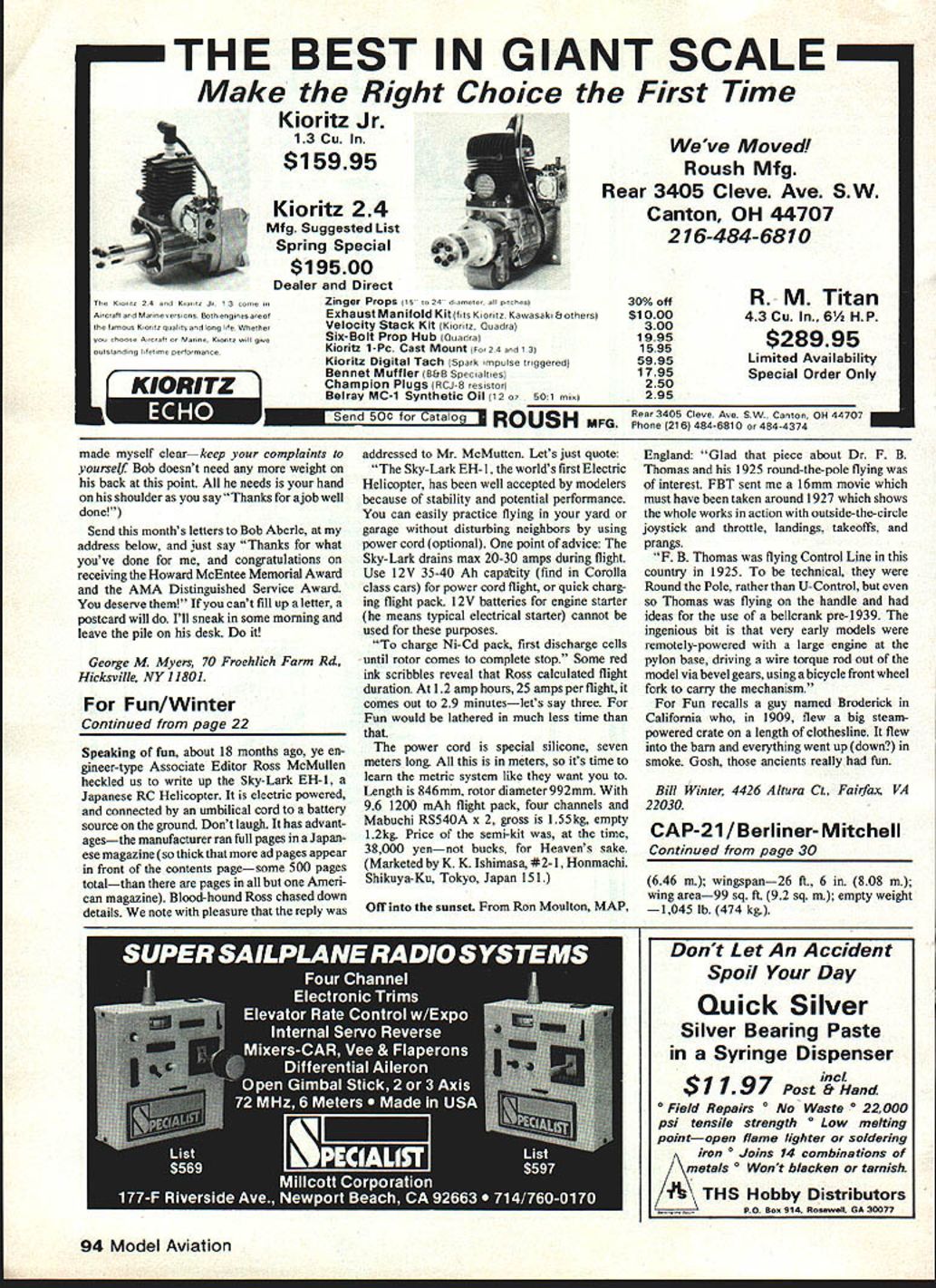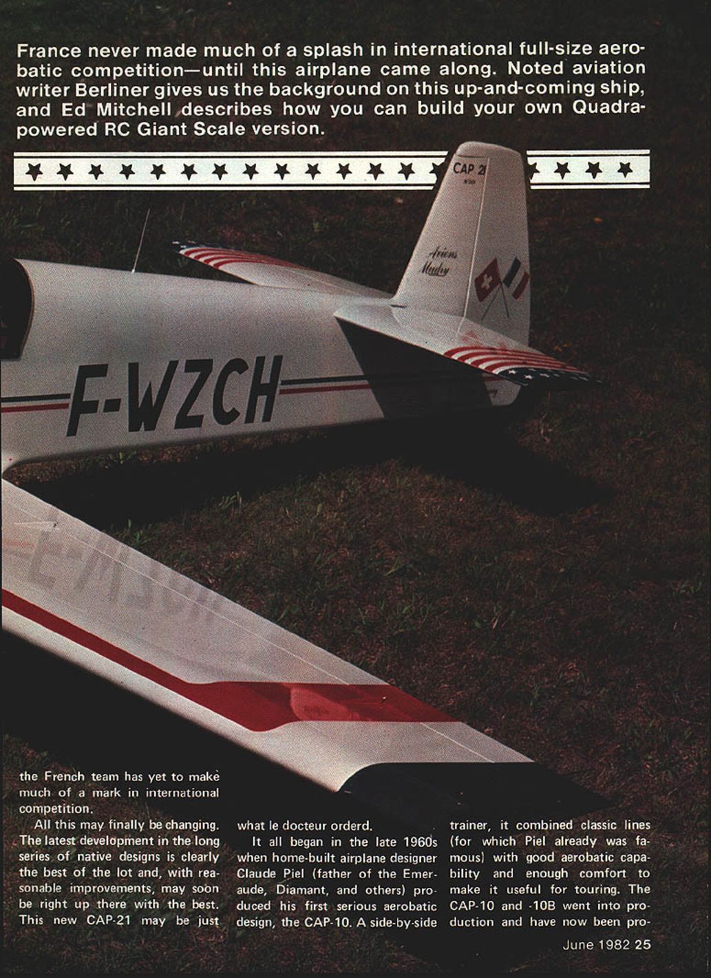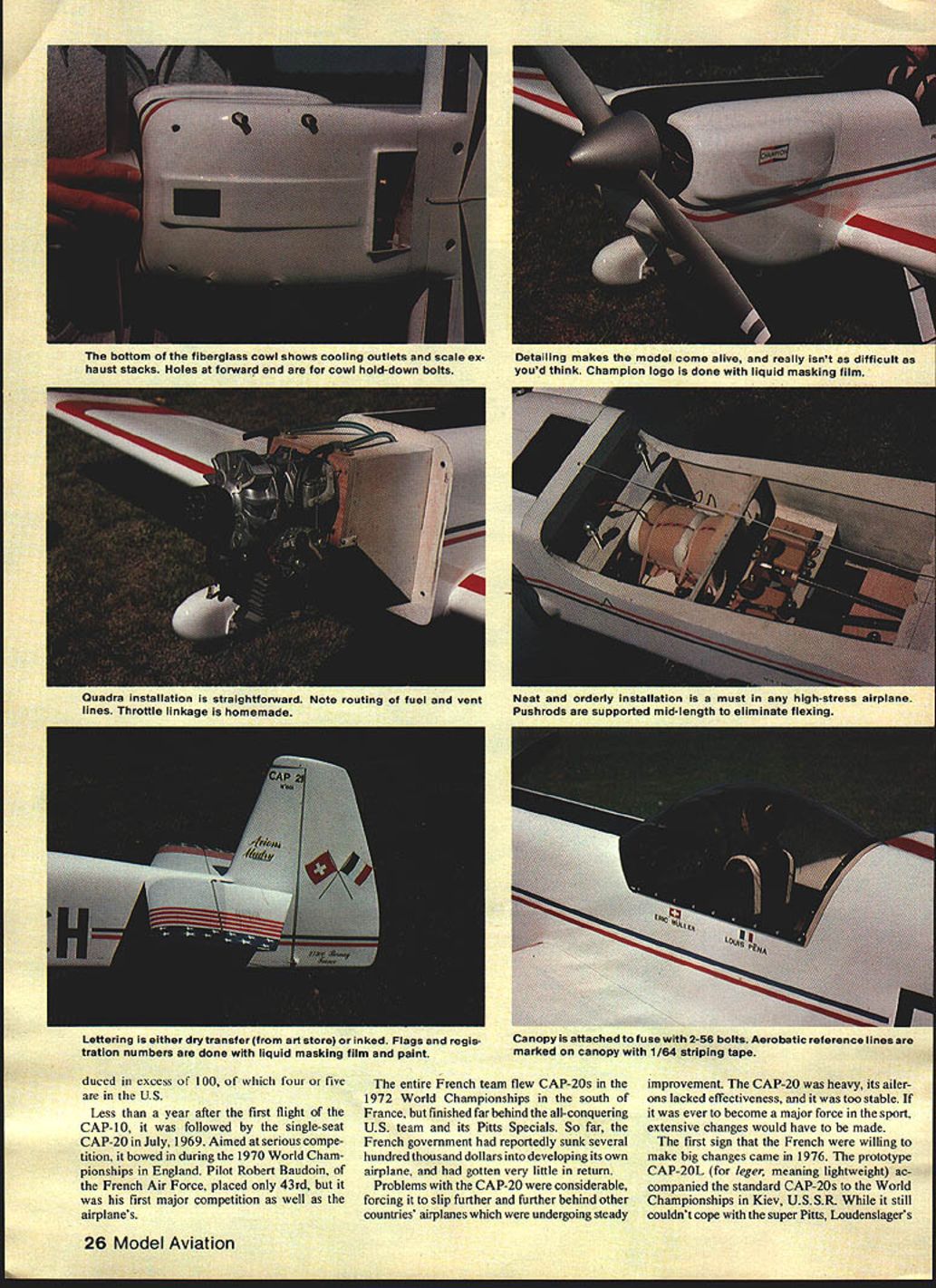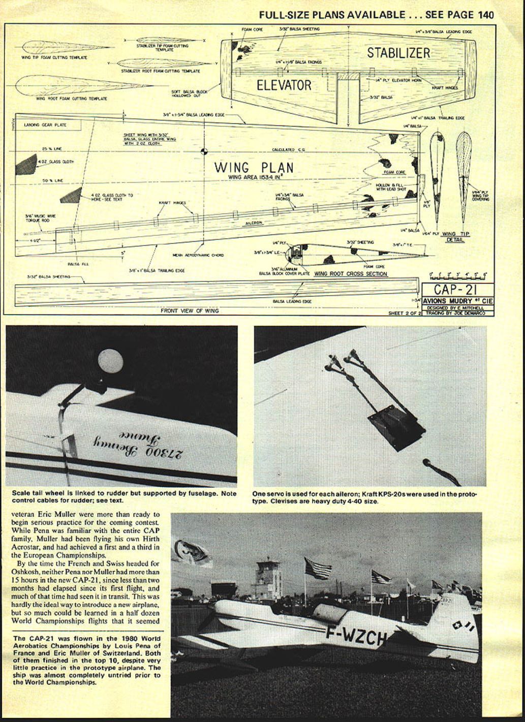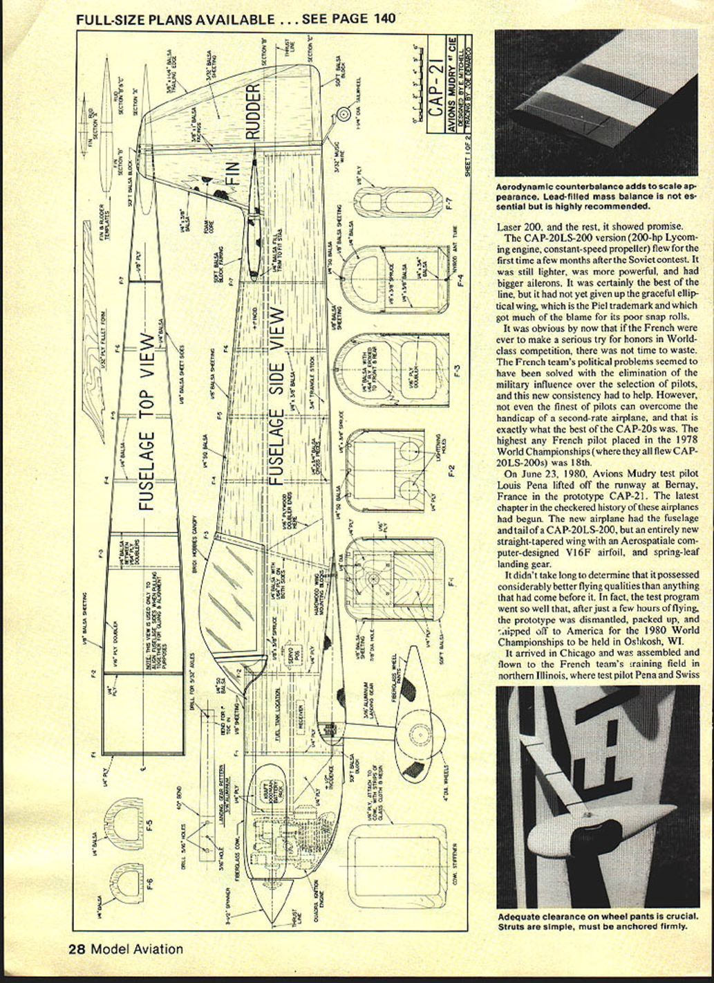 NO OCR TEXT NO OCR TEXT duced excess 100 four five US Less year after first flight CAP- 10 followed single-seat CAP-20 July 1969 Aimed serious compe tition bowed during 1970 World Cham pionships England Pilot Robert Baudoin French Air Force placed 43rd first major competition well airplanes entire French team flew CAP-20s 1972 World Championships south France finished far behind all-conquering US team its Pitts Specials So far French government reportedly sunk several hundred thousand dollars developing its own airplane gotten very little return Problems CAP-20 considerable forcing slip further further behind other countries airplanes undergoing steady improvement CAP-20 heavy its ailer ons lacked effectiveness too stable ever become major force sport extensive changes would have made first sign French willing make big changes came 1976 prototype CAP-20L leger meaning lightweight ac companied standard CAP-20s World Championships Kiev USSR still couldnt cope super Pitts Loudenslagers 26 Model Aviation bottom fiberglass cowl shows cooling outlets scale ex haust stacks Holes forward end cowl hold-down bolts Detailing makes model come alive really isnt difficult youd think Champion logo done liquid masking film Quadra installation straightforward Note routing fuel vent lines Throttle linkage homemade Neat orderly Installation must high-stress airplane Puahrods supported mid-length eliminate flexing Lettering either dry transfer art store inked Flags regis tration numbers done liquid masking film paint Canopy attached fuse 2-56 bolts Aerobatic reference lines marked canopy 1/64 stripIng tape BRIDI HOBBIES CANOPY WITH HORIZON REF LINES 4E4 - VOD TRAY 1/4 SQ STRINGERSF 1 & P2 1/4 PLYWOOD /7- F2 Fl FIBERGLASS COWLING WITH I/B PLYWOOD REAR FRAME CLEAR HEADS HARDWOOD BLOCK LOCKS L G LEG HALVES TO BOX BEAM WITh /4- 20 SCREWS 3/16 ALUMINUM LG LEG 2 HALVES MOUNTS TO F-i ON 4 BOLTS WITH NUTS ACCESS THRU FRONT 3/8X BALSA ROS-rSBALSA BLOCK3/8X 1/4 BALSA T E FOR FIN AND RUDDERFOAM COREALL BALSA BLOCK PAIRINGI/4X 3/B BALSA/TAIL SURFIES 3/32 BALSA 1/4 BALSA CORE WITH /64 PLY FACING FRONT AND BACK 1/4 X BALSATE 1/4 BALSAIBALSA BLOCK BALSA TIP BLOCK I/4X 3/8BALSAL E 4 TAILWHEEL ON 32 MUSIC WIRE INTO RUDDER BASE I/B X 3/B SPRUCE LONGERON UPPER ONLY 3/4 TRIANGULAR BALSA LOWER CORNERS ONLY xli I/4X 3/8 BALSA SIDE FRAMES AT F45-6 I/B BALSA SHEETING FUSELAGE SIDES TOP AND BOlTOM 1/16 PLYWflD DOUBLER FROM P3 PWD TO LAP P 1 3/16 MUSIC WIRE THRU 1OROUE TUBES TO AILERONS 2 OZ CLOTH ENTIRE WING-AILERORS 3/B X BALSA TRAILING EDGE 1/4 X 3/4 SPRttE REAR SPAR AND BALSA AILERON LEADtG EILE LOTS OF KRAPT HINGES 1/8 PLYIMOD VANE C SECTION ONLY 3/8X 13/4 BALSA L EDGE1/4 BALSA TIP 1/4 PLYWOOD BOX FOR LG HAS TNUTS FOR 1/4-20 80125 4 DIA WHEELS FIBERGLASS PANTS 3/32 BALSA SHEETING WING TOP AND BOlTOM OVER FOAM CORE QUADRA IGNITION ENGINE ON 1/4 PLYWOOD BOX MOUNTED THRU F INTO P2 UA*4k CL 7 F II FULL-SIZE PLANS AVAILABLESEE PAGE 140 2cL 2 -2 II 2~ IIV iyzzz& IILUVt 2 J/jrII~2 F-j4lUJ--- liI0 2III Ii/IlII 2CJ 1 4LLj1 III0 II 12 U 2 1022 2 2II Ifl II 2II liiiH L ii/~ 2 2 e _Kir Laser 200 rest showed promise CAP-2OLS-200 version 200-hp Lycom ing engine constant-speed propeller flew first time few months after Soviet contest still lighter powerful bigger ailerons certainly best line yet given up graceful ellip tical wing Piel trademark got much blame its poor snap rolls obvious now French ever make serious try honors Worldclass competition time waste French teams political problems seemed have solved elimination military influence over selection pilots new consistency help However finest pilots can overcome handicap second-rate airplane exactly what best CAP-20s highest French pilot placed 1978 World Championships flew CAP 2OLS-200s 18th June 23 1980 Avions Mudry test pilot Louis Pena lifted off runway Bernay France prototype CAP-2 1 latest chapter checkered history airplanes begun new airplane fuselage tail CAP-2OLS-200 entirely new straight-tapered wing Aerospatiale com puter-designed Vl6F airfoil spring-leaf landing gear didnt take long determine possessed considerably better flying qualities anything come before fact test program went well after just few hours flying prototype dismantled packed up Klipped oil America 1980 World Championships held Oslikosh WI arrived Chicago assembled flown French teams raining field northern Illinois test pilot Pena Swiss 28 Model Aviation Aerodynamic counterbalance adds scale ap pearance Lead-filled mass balance es sential highly recommended Adequate clearance wheel pants crucial Struts simple must anchored firmly FULL-SIZE PLANS AVAILABLE. SEE PAGE 140 WIRE TIP FOAM CATTiNG TEMPLATE WING ROOT FOAM CUTTING TEMPLATE STABLEER TiP FOAM CUTTiNG TEMPLATE STAMIZER ROOT FOAM CATTING TEMPLATE OGET RALOA WflCH HOLLOWED EAT FOAM ARE3/32 BAlSA SHEV4 3/B WADA tEAM/B EDGE STABILIZER 14 PLY ELEVATAR 40447 IARAFT iNGEG 3/3D WALDA 3/A 1-3/4 BALSA LEAARG EDGE BAlSA TBAAIWG EDGE LANOING GEAR PLATEI/C BALSA SHEET WING WTTR 3/30 BALSA GLASS ENTIRE WING WITH 2 AZ CLOTH 25% LRE_________CALCALATED C 0 H OZ OLAGS CLOTRWINGPL1NFOAM CARE 30% LINE_____WING AREA 11534 IN_______ FELLOW B FILL WITH LEAD SHOT I/RH PLY 4 02 ALASA CLOTH TOAMDW BALSA F-4*40TH COVERING HERE-GEE TEXTI/B RHOAT HINGES I - PLT 3/A MAGIC WIRE- TOHOGE RGE- --AILERON VA BAlSA I/NH PLTWING TIP DETAIL A-VDIII/B PLY 3/3D SHEETING 3/B 3/B ES/H _ WAN AEBARYNAM CHARD BAlSA FIX/"4"""""""""""OAM CORE 3/H BALSA TRAILING EDGE ALANWB*J BALSA ALOCA COVER PLAT WING ROOT CROSS SECTION 3/32 BALSA SHEETING -K CAP-21 ___BALSA LEADING EDGE3/Bii~IDRYclE __________ __________ ___________ _________ _______-------jfIj~ FRONT VIEW OF WINGSHEET 20F2BY0 ELEVATOR veteran Eric Muller ready begin serious practice coming contest Pena familiar entire CAP family Muller flying own Hirth Acrostar achieved first third European Championships time French Swiss headed Oshkosh neither Pena nor Muller 15 hours new CAP-2 1 since less two months elapsed since its first flight much time seen tr