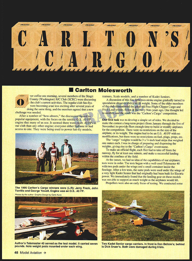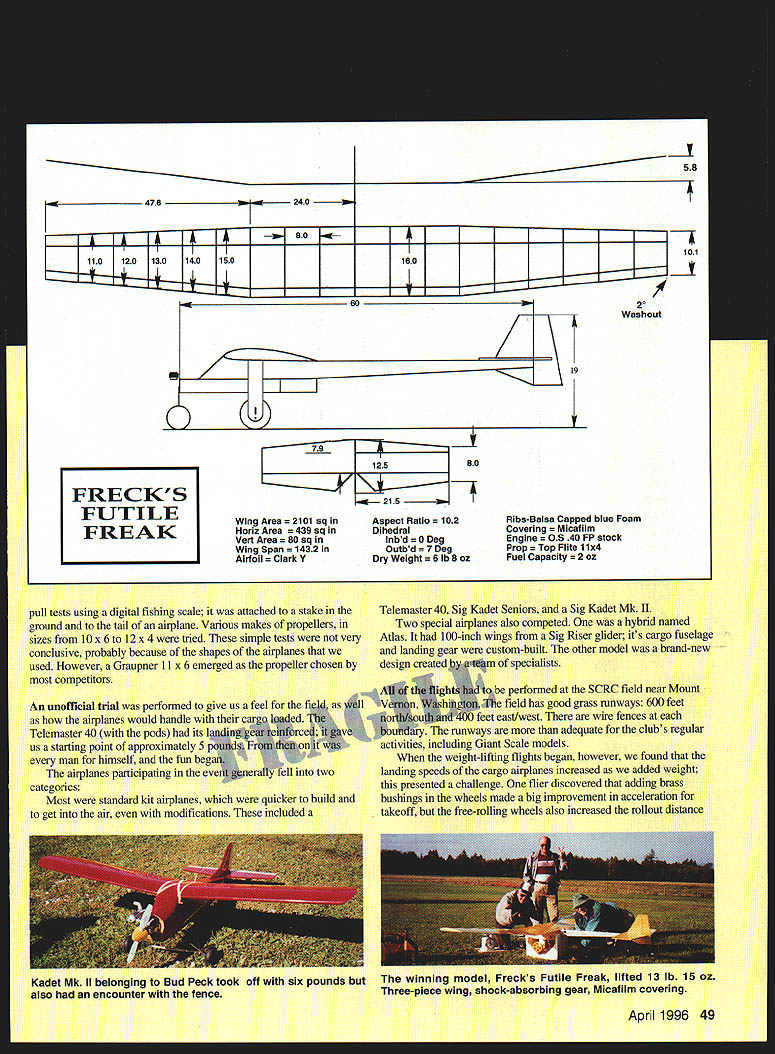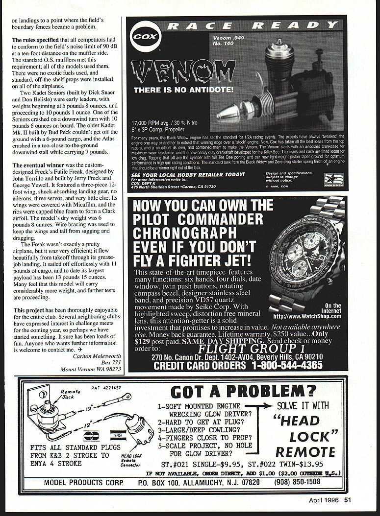 U Canton Molesworth ver coffee morning several members Skagit County Washington RIC Club SCRC discussing Vthe clubs current activities regular club fun-flys becoming tad less exciting after several years doing same thing members agreed new challenge needed After number how-abouts discusiqp4irnjtc popular equipment focus terrifi~ 40 Fl engine us use seemed wer&bor 4FPs club other engine everyone either hkne access being used power fun-fly models trainers Scale models number Kadet Seniors discussion fielttItwo-stroke engine gradually turned speculation abpt i4bilit 14t weight Some older members th elqJ rjmlfred Iaf old Free Flight Clipper Cargo PAoad enN y Nats years ago thought led anrattwas Carltons Cargo competition Oufr first task develop simple set rules decided make contest long-term project January through first November provide fliers enough time build modify airplanes competition no restrictions size airplane its weight engine 0S 40 FP no modifications no restrictions fuel plugs props etc cargo weights would 3 x -inch lead strips weighed ounce charge preparing dispensing weights giving rise Carltons Cargo event name make official flight flier take off runway fly least minute make successful landing within confines field outset no idea capabilities airplanes tests order tests began well-used Telemaster 40 two pods under wings small container inside fuselage After few tests same pods used under wings very light Kadet Senior originally built Electric power immediately found landing gear models able support much weight airplanes would lift Propellers also early focus testing conducted some 48 Model Aviation Carltons Cargo winners L-R Jerry Freck John Torrillo George Vewell Engine OS 40 FP Photos author GraDhic DesiorCarla Kunz Authors Telemaster 40 served test model carried seven pounds Note weight pods mounted under wing Two Kadet Senior cargo carriers front Don Belisles behind Dick Snaers Both damaged during trials - 80 IV *11 Washout U o - Wing Area sq Horiz Area sq Veil Area q Wing Span Airfoil k V Aspect Ratio Dihedral lnbd g Outbd g Dry Weight 8 oz Ribs-Balsa Capped blue Foam Covering llim Engine 0 FP stock Prop Flite 11x4 Fuel Capacity pull tests using digital fishing scale attached stake ground tail airplane Various makes propellers sizes 10 x 6 12 x 4 tried simple tests very conclusive probably because shapes airplanes used However Graupner 11 x 6 emerged propeller chosen competitors Telemaster 40 Sig Kadet Seniors Sig Kadet Mk II Two special airplanes also competed hybrid named Atlas 100-inch wings Sig Riser glider its cargo fuselage landing gear custom-built other model brand-new design created ialists ighbe performed SCRC field near Mount An unofficial trial performed give us feel forthe fas 1 field has good grass runways 600 feet airplanes would handle car ed o u feet east/west wire fences Telemaster 40 pods its 1 rce unways adequate clubs regular us staffing point approximately 5 pFnactivities including Giant Scale models man himself fun begWhen weight-lifting flights began however found airplanes participating eveerfell twolanding speeds cargo airplanes increased added weight categoriesthis presented challenge flier discovered adding brass Most standard kit airplanes quicker build andbushings wheels made big improvement acceleration get air modifications included atakeoff free-rolling wheels also increased rollout distance Kadet Mk II belonging Bud Peck took off six pounds butThe winning model Frecks Futile Freak lifted 13 lb 15 oz also encounter fenceThree-piece Wing shock-absorbing gear Micafilm covering April 1996 49 475 II IAIAIAIA 110120150 58 19 FRECKS FUTILE FREAK landings point fields boundary fences became problem rules specified competitors conform fields noise limit 90 dB ten-foot distance muffler side standard OS mufflers met requirement models used no exotic fuels used standard off-the-shelf props installed airplanes Two Kadet Seniors built Dick Snaer Don Belisle early leaders weights beginning 5 pounds 8 ounces proceeding 10 pounds 1 ounce Seniors crashed downwind turn 10 pounds 6 ounces board older Kadet Mk II built Bud Peck couldnt get off ground 6-pound cargo Atlas crashed too-close-to-the-ground downwind stall carrying 7 pounds eventual winner customdesigned Frecks Futile Freak designed John Torrillo built Jerry Freck George Yewell featured three-piece 12foot wing shock-absorbing landing gear no ailerons three servos very little else Its wings covered Micafilm ribs capped blue foam form Clark airfoil models dry weight 6 pounds 8 ounces Wire bracing used keep wings tail sagging dragging Freak wasnt exactly pretty airplane very efficient flew beautifully takeoff through its greasejob landing sailed off effortlessly 11 pounds cargo date its largest payload has 13 pounds 15 ounces feel model will carry considerably weight further tests proceeding project has thoroughly enjoyable entire club Several neighboring clubs have expressed interest challenge meets coming year perhaps have started something sure has loads fun Anyone wants further information welcome contact on Molesworth Box 771 Mount Vernon WA 98273 April 1996 51 PAt 4221452 GOT PROBLEM Rem eta EJaeA0 1-SOFT MOUNTED ENGINESLVE IT WIll-I 2HARD TO GET AT PLUG KING GLOW DRIVEREAD 3LARGE/DEEP COWLING 4FINGERS CLOSE TO PROPLOCK FITS ALL STANDARD PLUGS5SCALE PROJECT NO HOLEE Al OT E FROM K&B 2 STROKE TOHEAD LOaK FOR GLOW DRIVER ENYA 4 STROKE7AIST#021 SINGLE$995 ST#022 TWIN$1395 IF WY AVkUAEZ1W $100 $200s MODEL PRODUCTS CORPRD BOX 100 ALLAMUCHY NJ 07820908 850-1508