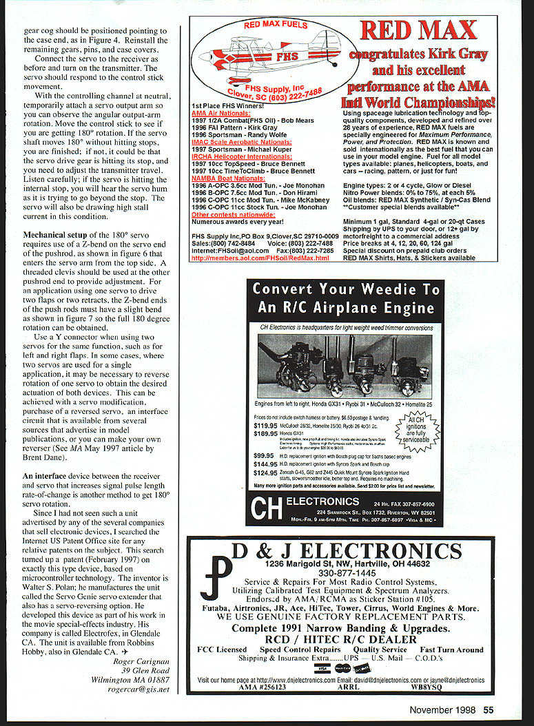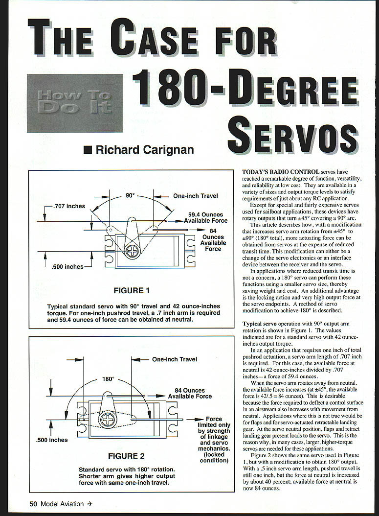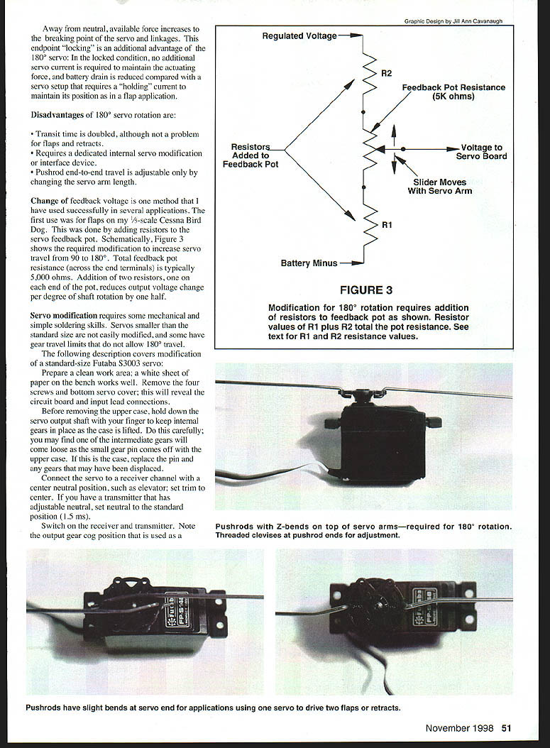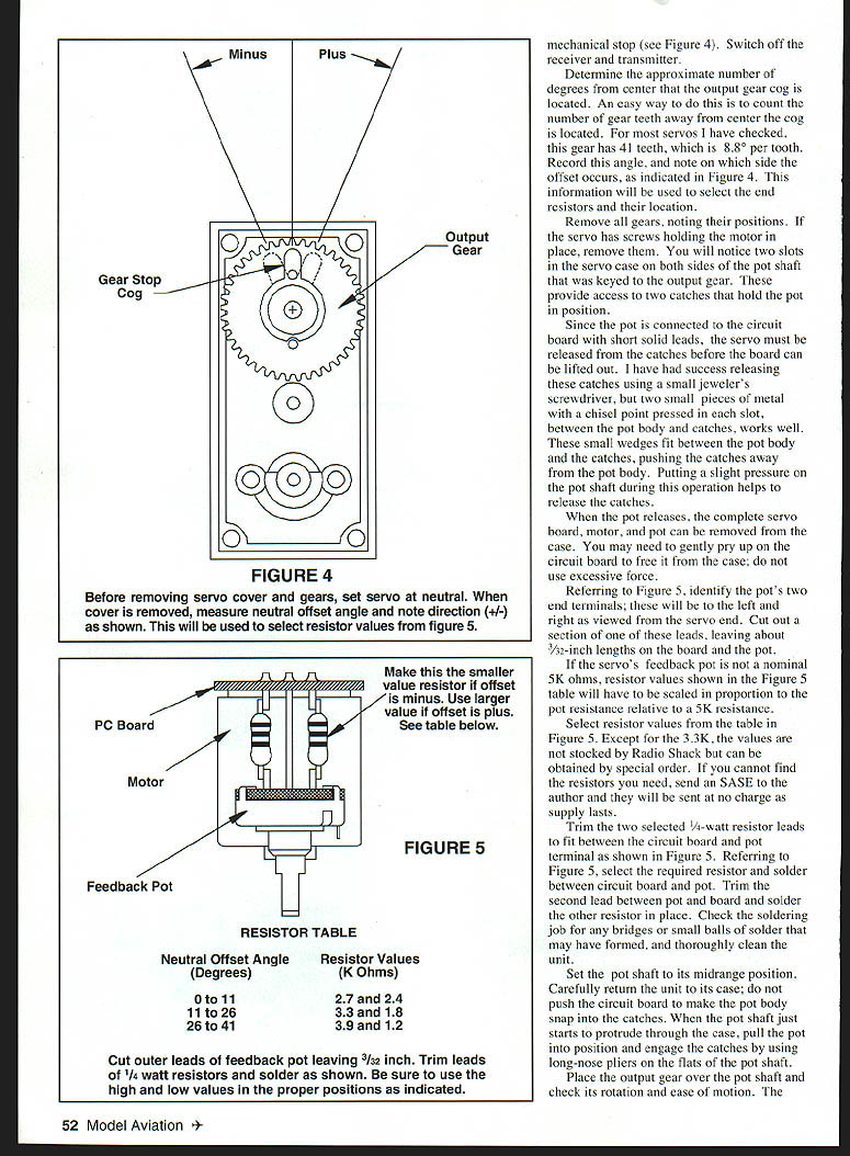 THE FOR SS4ESREE SERVO U Richard Carignan 900 -inch Travel {707 inches Ounces Available Force 500 inches-i FIGURE 1 Typical standard servo 900 travel 42 ounce-inches torque one-inch pushrod travel 7 inch arm required 594 ounces force can obtained neutral $ 1800 L7 500 inches 594 Ounces Force inch Travel 84 Ounces _- Available Force 7W FIGURE 2 . Force limited strength linkage servo mechanics locked condition Standard servo 1800 rotation Shorter arm gives higher output force same one-inch travel TODAYS RADIO CONTROL servos have reached remarkable degree function versatility reliability low cost available variety sizes output torque levels satisfy requirements just about RC application Except special fairly expensive servos used sailboat applications devices have rotaly outputs turn 450 covering 900 arc article describes modification increases servo arm rotation 450 900 1800 total actuating force can obtained servos expense reduced transit time modification can either change servo electronics interface device between receiver servo applications reduced transit time concern l80 servo can perform functions using smaller servo size thereby saving weight cost An additional advantage locking action very high output force servo endpoints method servo modification achieve 1800 described Typical servo operation 900 output arm rotation shown Figure 1 values indicated standard servo 42 ounceinches output torque application requires inch total pushrod actuation servo arm length 707 inch required case available force neutral 42 ounce-inches divided 707 inchesa force 594 ounces servo ann rotates away neutral available force increases 450 available force 42/5 unces desirable because force required deflect control surface airstream also increases movement neutral Applications true would flaps servo-actuated retractable landing gear servo neutral position flaps retract landing gear present loads servo reason cases larger higher-torque servos needed applications Figure 2 shows same servo used Figure 1 modification obtain 1800 output 5 inch servo arm length pushrod travel still inch force neutral increased about 40 percent available force neutral now 84 ounces 50 Model Aviation neutral available force increases breaking point servo linkages endpoint locking additional advantage 1800 servo locked condition no additional servo current required maintain actuating force battery drain reduced compared servo setup requires holding current maintain its position flap application Disadvantages 1800 servo rotation Transit time doubled although problem flaps retracts Requires dedicated internal servo modification interface device Pushrod end-to-end travel adjustable changing servo arm length Change feedback voltage method have used successfully several applications first use flaps 1/5-scale Cessna Bird Dog done adding resistors servo feedback pot Schematically Figure 3 shows required modification increase servo travel 90 1800 Total feedback pot resistance across end terminals typically 5000 ohms Addition two resistors end pot reduces output voltage change per degree shaft rotation half Servo modification requires some mechanical simple soldering skills Servos smaller standard size easily modified some have gear travel limits allow 1800 travel following description covers modification standard-size Futaba S3003 servo Prepare clean work area white sheet paper bench works well Remove four screws bottom servo cover will reveal circuit board input lead connections Before removing upper case hold down servo output shaft finger keep internal gears place case lifted carefully may find intermediate gears will come loose small gear pin comes off upper case case replace pin gears may have displaced Connect servo receiver channel center neutral position such elevator set trim center have transmitter has adjustable neutral set neutral standard position 15 ins Switch receiver transmitter Note output gear cog position used Graphic Design Jill Ann Gavanaugh Resistor Added Feedback Pot Regulated Voltage R2 Feedback Pot Resistance 5K ohms 4 Ri Battery Minus FIGURE 3 Modification 1800 rotation requires addition resistors feedback pot shown Resistor values Ri plus R2 total pot resistance See text Ri R2 resistance values Pushrods Z-bends top servo armsrequired 1800 rotation Threaded devises pushrod ends adjustment Voltage Servo Board Slider Moves Servo Arm Pushrods have slight bends servo end applications using servo drive two flaps retracts November 1998 51 Make smaller value resistor offset minus Use larger value offset plus See table below FIGURE 5 RESISTOR TABLE Neutral Offset Angle Degrees o toll 11 26 26 41 Resistor Values K Ohms 27 24 33 18 39 12 Cut outer leads feedback pot leaving /32 inch Trim leads 1/4 watt resistors solder shown sure use high low values proper positions indicated mechanical stop see Figure 4 Switch off receiver transmitter Determine approximate number degrees center output gear cog located An easy way to count number gear teeth away center cog located servos have checked gear has 41 teeth 880 per tooth Record angle note side offset occurs indicated Figure 4 information will used select end resistors location Remove gears noting positions servo has screws holding motor place remove will notice two slots servo case both sides pot shaft keyed output gear provide access two catches hold pot position Since pot connected circuit board short solid leads servo must released catches before board can lifted out have success releasing catches using small jewelers screwdriver two small pieces metal chisel point pressed slot between pot body catches works well small wedges fit between pot body catches pushing catches away pot body Putting slight pressure pot shaft during operation helps release catches pot releases complete servo board motor pot can removed case may need gently pry up circuit board free case use excessive force Referring Figure 5 identify pots two end terminals will left right viewed servo end Cut out sect