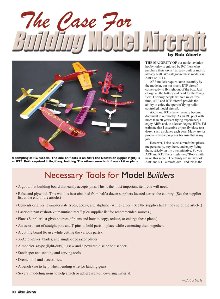 ARF RTF Building case hobby board pins balsa plywood glue cement laser-cut plans pins cutting knives blades jigsaw sandpaper sanding dremel tool vise iron kit scratch building scratch assembly price scratch-building competitive model ground up cut laser safety plans other construction tom hunt acrovolt playboy