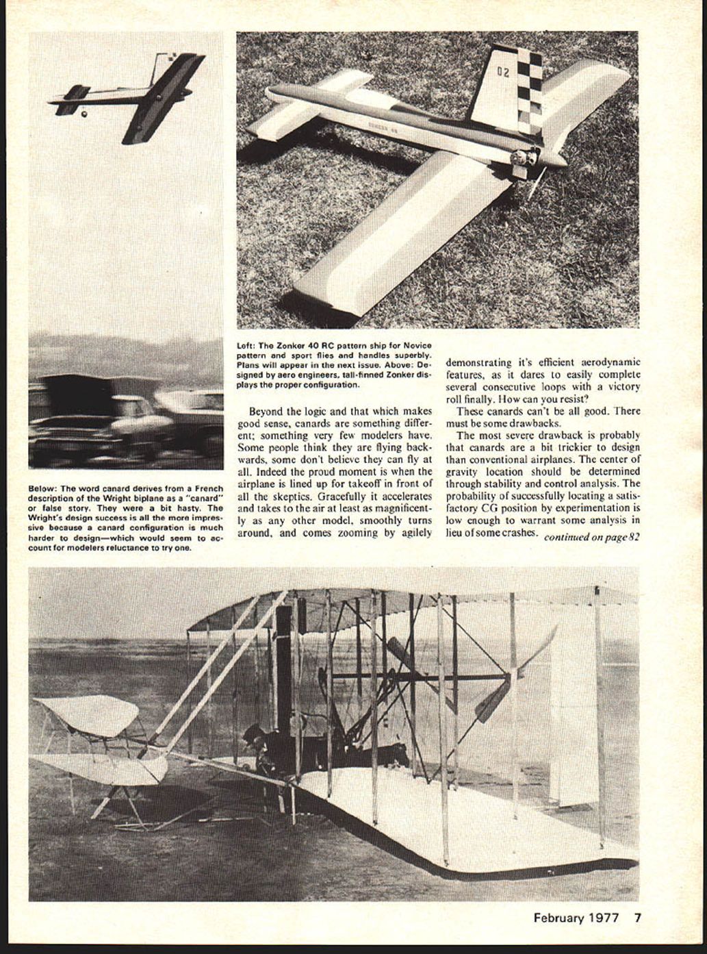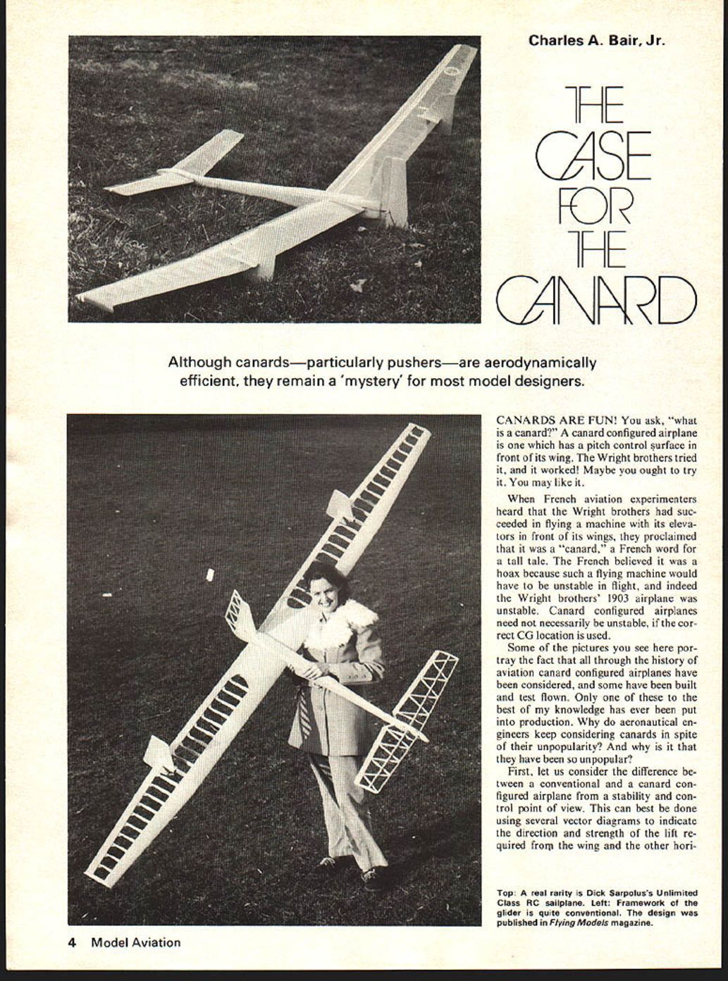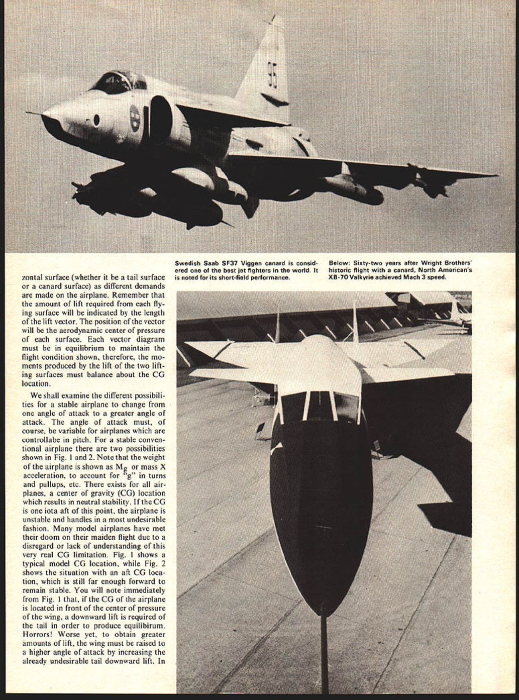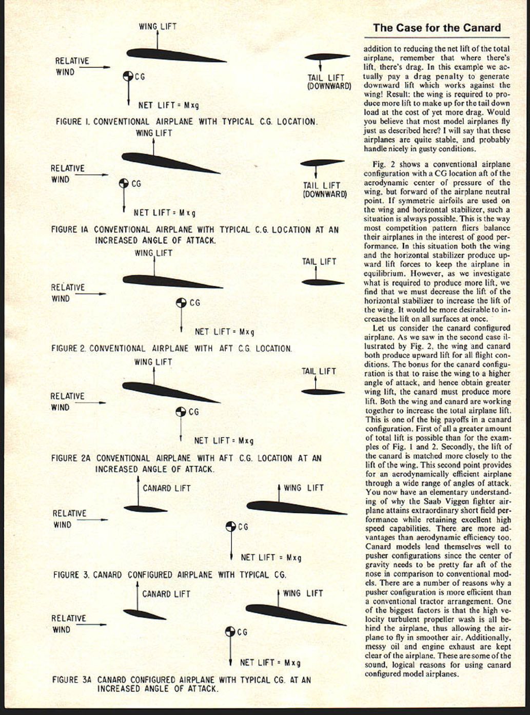 Charles Bair Jr FE FOR iHE G1NkRD Although canardsparticularly pushersare aerodynamically efficient remain mystery model designers CANARDS ARE FUN ask what canard canard configured airplane has pitch control surface front its wing Wright brothers tried it worked Maybe ought try it You may like French aviation experimenters heard Wright brothers suc ceeded flying machine its eleva tors front its wings proclaimed canard French word tall tale French believed hoax because such flying machine would have unstable flight indeed Wright brothers 1903 airplane unstable Canard configured airplanes need necessarily unstable cor rect CG location used Some pictures see por tray fact through history aviation canard configured airplanes have considered some have built test flown Only best knowledge has ever put production aeronautical en gineers keep considering canards spite unpopularity have unpopular First let us consider difference tween conventional canard con figured airplane stability con trol point view can best done using several vector diagrams indicate direction strength lift re quired froiv wing other hon Top A real rarity Dick Sarpoluss Unlimited Class RC sailplane Left Framework glider quite conventional design published Flying Models magazine 4 Model Aviation zontal surface whether tail surface canard surface different demands made airplane Remember amount lift required fly ing surface will indicated length lift vector position vector will aerodynamic center pressure surface vector diagram must equilibrium maintain flight condition shown therefore mo ments produced lift two lift ing surfaces must balance about CG location shall examine different possibili ties stable airplane change angle attack greater angle attack angle attack must course variable airplanes controllabe pitch stable conven tional airplane two possibilities shown Fig 1 2 Note weight airplane shown Mg mass X acceleration account g turns pullups etc exists air planes center gravity CG location results neutral stability CG iota aft point airplane unstable handles undesirable fashion model airplanes have met doom maiden flight due disregard lack understanding very real CG limitation Fig 1 shows typical model CG location Fig 2 shows situation aft CG loca tion still far enough forward remain stable will note immediately Fig CG airplane located front center pressure wing downward lift required tail order produce equilibirum Horrors Worse yet obtain greater amounts lift wing must raised higher angle attack increasing already undesirable tail downward lift Swedish Saab SF37 Viggen canard consid- Below Sixty-two years after Wright Brothers ered best jet fighters world historic flight canard North Americans noted its short-field performance XB-70 Valkyrie achieved Mach 3 speed Case Canard CG NET LIFT Mxg FIGURE CONVENTIONAL AIRPLANE WITH TYPICAL CG LOCATION WING LIFT CG NET LIFT Mxg FIGURE IA CONVENTIONAL AIRPLANE WITH TYPICAL CG LOCATION AT INCREASED ANGLE OF ATTACK WING LIFT T CG NET LIFT Mxg FIGURE 2 CONVENTIONAL AIRPLANE WITH AFT CG LOCATION WING LIFT RELATIVE WIND T CG NET LIFT Mxg FIGURE 2A CONVENTIONAL AIRPLANE WITH INCREASED ANGLE OF ATTACK CANARD LIFT RELATIVE WIND TAIL LIFT TAIL LIFT AFT CG LOCATION AT 2 LIFT T CG NET LIFT FIGURE 3 CANARD CONFIGURED AIRPLANE WITH TYPICAL CG t CANARD LIFT addition reducing net lift total airplane remember theres lift theres drag example ac TAIL LIFTtually pay drag penalty generate DOWNWARDdownward lift works against wing Result wing required pro duce lift make up tail down load cost yet drag Would believe model airplanes fly just described will say airplanes quite stable probably handle nicely gusty conditions Fig 2 shows conventional airplane configuration CU location aft TAIL LIFTaerodynamic center pressure DOWNWARDwing forward airplane neutral point symmetric airfoils used wing horizontal stabilizer such situation always possible way competition pattern fliers balance airplanes interest good per formance situation both wing horizontal stabilizer produce up ward lift forces keep airplane equilibrium However investigate what required produce lift find must decrease lift horizontal stabilizer increase lift wing would desirable crease lift surfaces once Let us consider canard configured airplane As saw second case il lustrated Fig 2 wing canard both produce upward lift flight con ditions bonus canard configu ration raise wing higher angle attack hence obtain greater wing lift canard must produce lift Both wing canard working together increase total airplane lift big payoffs canard configuration First greater amount total lift possible exam ples Fig 1 2 Secondly lift canard matched closely lift wing second point provides aerodynamically efficient airplane through wide range angles attack now have elementary understand ing Saab Viggen fighter air plane attains extraordinary short field per formance retaining excellent high speed capabilities ad vantages aerodynamic efficiency too Canard models lend themselves well pusher configurations since center gravity needs pretty far aft nose comparison conventional mod els number reasons pusher configuration efficient conventional tractor arrangement biggest factors high ve locity turbulent propeller wash hind airplane thus allowing air plane fly smoother air Additionally messy oil engine exhaust kept clear airplane some sound logical reasons using canard configured model airplanes jjjIF T CG NET LIFT Mxg FIGURE 3A CANARD CONFIGURED AIRPLANE WITH TYPICAL CG AT INCREASED ANGLE OF ATTACK WING LIFT RELATIVE WIND RELATIVE WIND RELATIVE WIND RELATIVE WIND Left The Zonker 40 RC pattern ship Novice pattern sport flies handles superbly Plans will appear next issue Above De signed aero engineers tall-firmed Zonker dis plays proper configuration Beyond logic makes good sense canards something differ ent something very few modelers have Some people think flying back wards some dont believe can fly Indeed proud moment airplane lined up takeoff front skeptics Gracef
