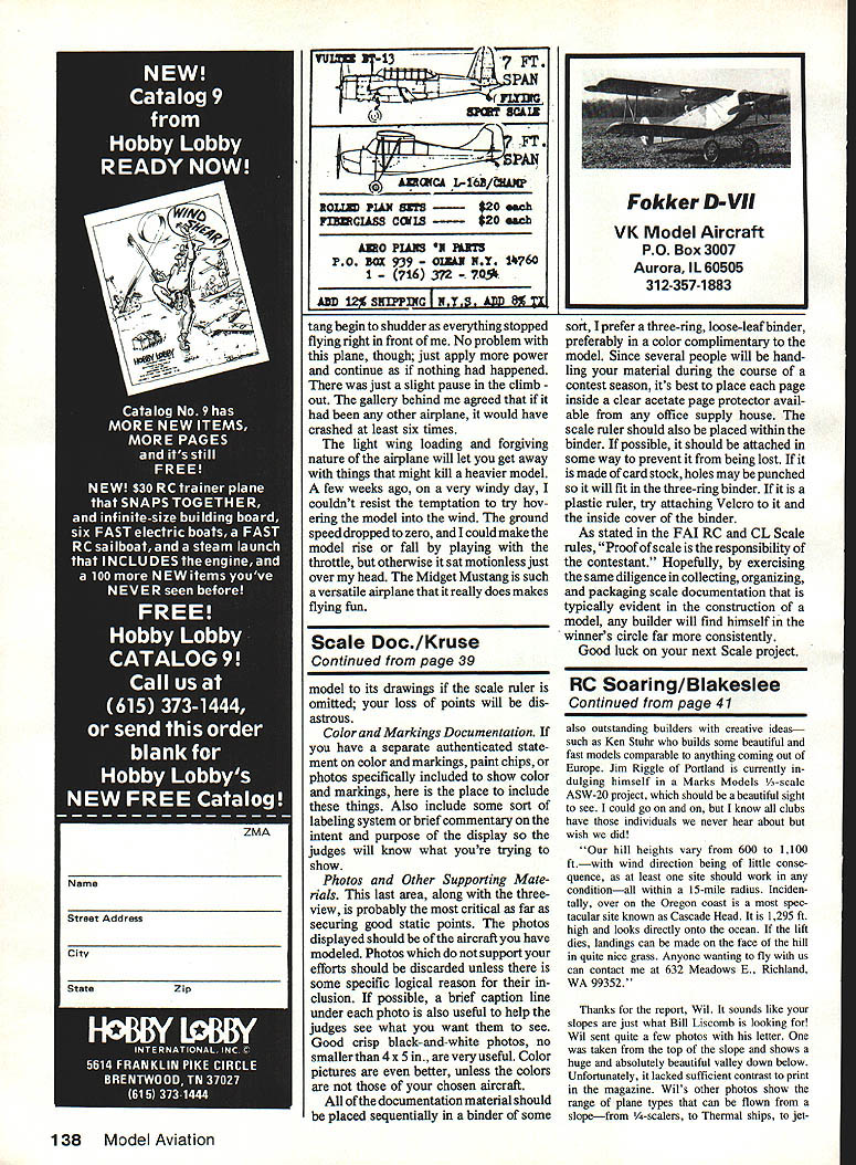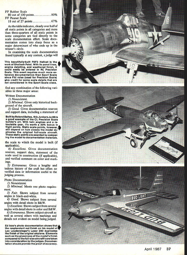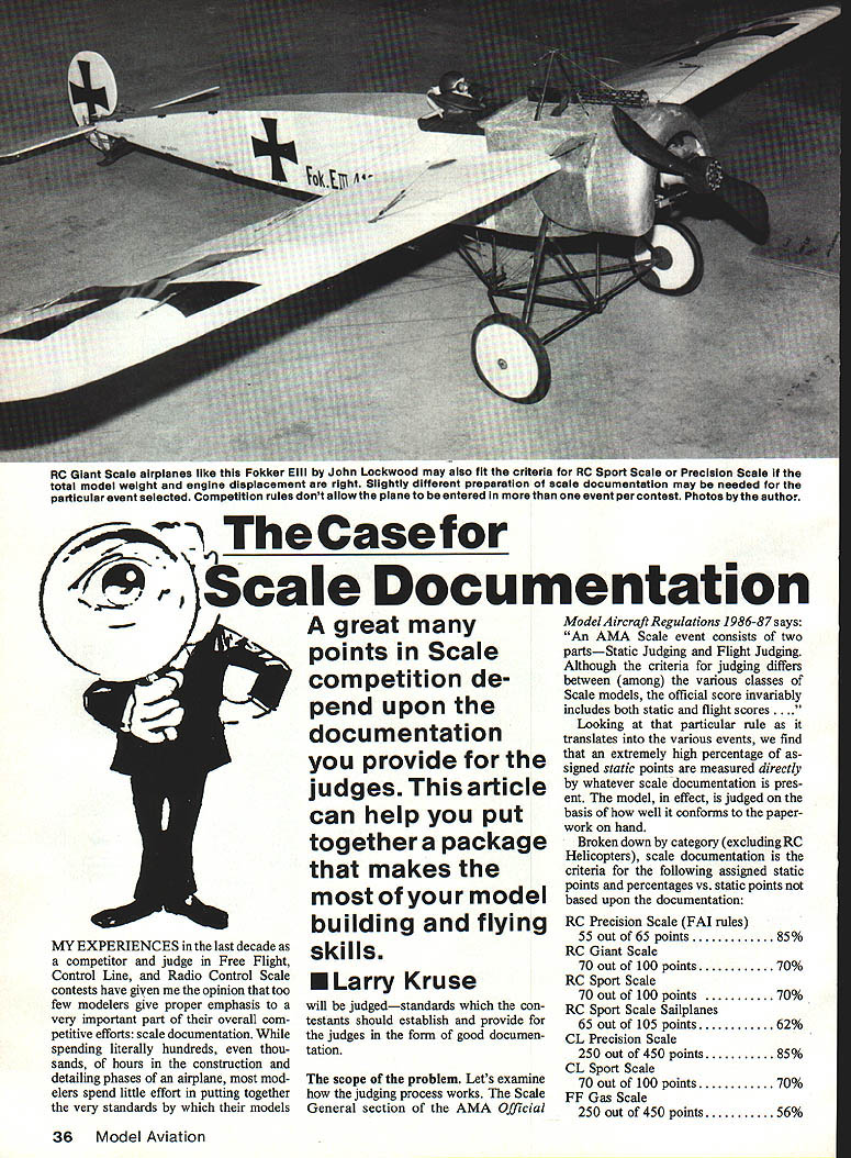 RC Giant Scale airplanes like Fokker CIII John LOCKWOOd may aiso fit criteria RC Sport Scale Precision Scale total model weight engine displacement right Slightly different preparation scale documentation may needed particular event selected Competition rules dont allow plane entered event per contest Photos bythe author Casefor / 4 ~Scale Documentation II MY EXPERIENCES last decade competitor judge Free Flight Control Line Radio Control Scale contests have given opinion too few modelers give proper emphasis very important part overall com petitive efforts scale documentation spending literally hundreds thou sands hours construction detailing phases airplane mod elers spend little effort putting together very standards models great points Scale competition de pend upon documentation provide judges article can help put together package makes model building flying skills U Larry Kruse will judgedstandards con testants should establish provide judges form good documen tation scope problem Lets examine judging process works Scale General section AMA Official ModelAircraft Regulations 1986-8 7 says An AMA Scale event consists two partsStatic Judging Flight Judging Although criteria judging differs between among various classes Scale models official score invariably includes both static flight scores . Looking particular rule translates various events find extremely high percentage signed static points measured directly whatever scale documentation pres ent model effect judged basis well conforms paper work hand Broken down category excluding RC Helicopters scale documentation criteria following assigned static points percentages vs static points based upon documentation RC Precision Scale FAI rules 55 out 65 points 85% RC Giant Scale 70 out 100 points 70% RC Sport Scale 70 out 100 points 70% RC Sport Scale Sailplanes 65 out 105 points 62% CL Precision Scale 250 out 450 points 85% CL Sport Scale 70 out 100 points 70% FF Gas Scale 250 out 450 points 56% 36 Model Aviation FE Rubber Scale 80 out 100 points 80% FE Peanut Scale 18 out 27 points 67% As table indicates clearly over half static points categories three-quarters static points some categories tied directly scale documentation effort Scale docu mentation comes sharp focus major determinant ends up winners circle examining scale documentation found typically contest judge will beautifully-built FBF3 Hellcat work Shailesh Patel its panel lines engine detailing weathered finish could easily entered RC Precision Scale event requires much ex tensive documentation Sport Scale since PAl rules used Precision Scale give credit some scale details considered Sport Scale class find combination following vari ables three major areas Written Documentation 1 Nonexistent 2 Minimal Gives historical back ground aircraft 3 Good Gives documentation sources support data including statement Built Roland BaitesthisJunkersJu-Bsis good example CL Precision Scale builders art twin engines re tractable gear its worth 20% bonus flight points Static scale points however still depend closely model du plicates original full-scale aircraft static points awarded compar ing model documentation materials scale model built applicable 4 Excellent Gives documentation sources support data statement scale used construction applicable verified comment color mark ings 5 Extraneous Gives lengthy tedious history craft offers no verified data information useful judging process Photo Documentation 1 Nonexistent 2 Minimal Meets photo require ment 3 Fair Shows subject several angles black-and-white 4 Good Shows subject several angles detail shots B&W 5 Excellent Shows subject several angles detail shots color B&W 6 Extraneous Shows subject aircraft well several others markings details evident model being judged Ed izzos photo documentation shows resplendent red finish model Leo Loudenslagers Laser 200 duplicates finish originai airplane Elements such glossiness models finish compared full-size aircrafts taken consideration bythe judges Documen tation should provide proof accuracy April 1987 37 port 28 Cl Pursuit Granger Williams excellent candidate high scores finish color markings documentation supports color scheme Three-View Drawing equivalent 1 Nonexistent 2 Minimal Poorly rendered non-de tailed copy Scale ruler required omit ted 3 Good Well-rendered line tone drawing pertinent details evident Scale ruler required included 4 Extraneous Two three-views different sources Model appears conform portions Scale ruler required included matches three-view too occasions presentations tend fit minimal nonexistent classifications rather good excel lent strange thing times actual models better average excellent quality plac ing contests usually isnt high because documentation doesnt match mod el terms quality static score suffers Notice also damage can done scores having extraneous confusing material presentation Photos DaveJohnsons DeHaviliand Tiger Moth 82A good example model copied ific full-size aircraftin case trainerforthe DeHavilland School Flying Good photographs three-view drawing will help Johnsons scores accuracy outline finish color markings dont match details model extra three-view drawing shows variant version written material doesnt address judging issues may actually cost model points should confuse quantity quality presentation no minimum weight limit documentation material Solutions packaging Documentation materials should hand prior starting construction model am constantly amazed mail requests receive go something like Dear Sir have constructed exact RC Scale model Spitfire RAF markings am seeking three-view photos match mod el Can help Invariably answer No Im sorry cant help Apparently what happens well-intentioned people begin con struction plane later decide enter competition thereby setting off frantic scavenger hunt material seems support what have done Such efforts doomed failure certainly relegated partial success low static scores Relatively simpie models like Dick 