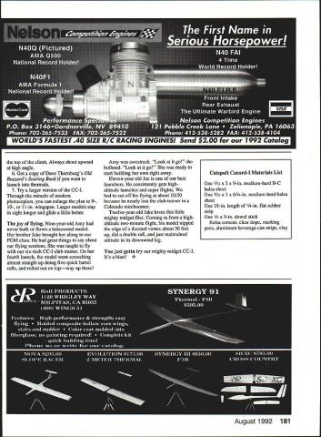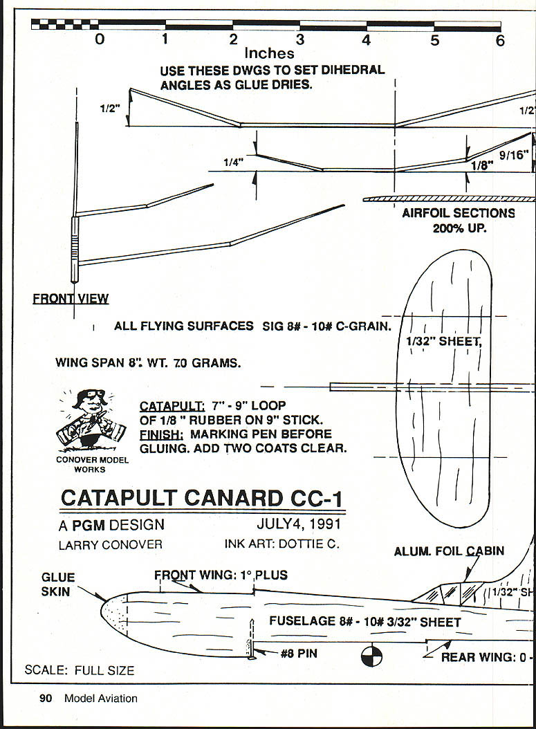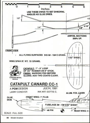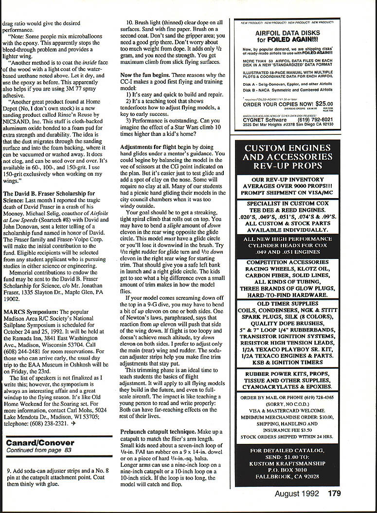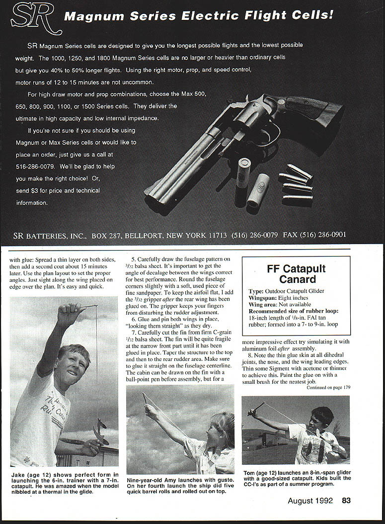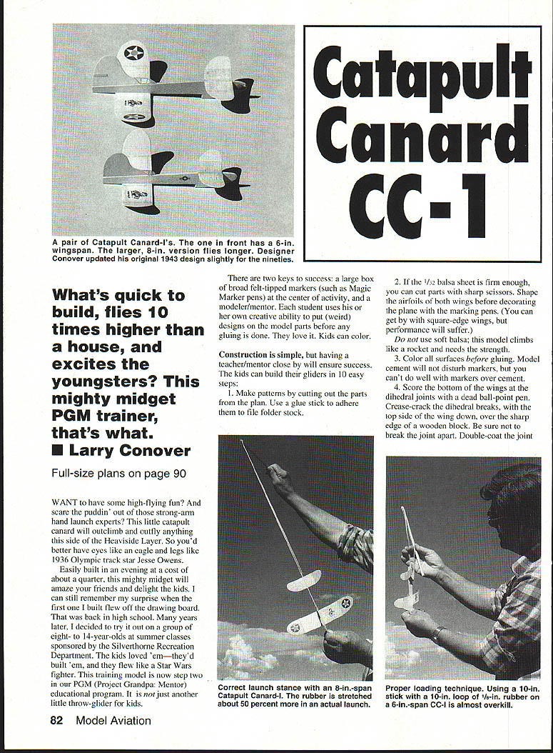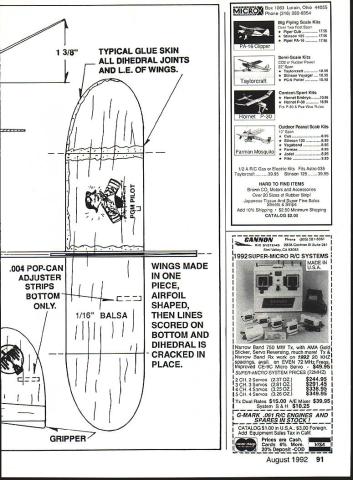 Whats quick build flies 10 times higher house excites youngsters mighty midget PGM trainer thats what Larry Conover Full-size plans page 90 WANT have some high-flying fun scare puddin out strong-arm hand launch experts little catapult canard will outclimb outfly anything side Heaviside Layer So youd better have eyes like eagle legs like 1936 Olympic track star Jesse Owens Easily built evening cost about quarter mighty midget will amaze friends delight kids can still remember surprise first built flew off drawing board back high school years later decided try out group eight- 14-year-olds summer classes sponsored Silverthorne Recreation Department kids loved emtheyd built em flew like Star Wars fighter training model now step two PGM Project Grandpa Mentor educational program just another little throw-glider kids two keys success large box broad felt-tipped markers such Magic Marker pens center activity modeler/mentor student uses own creative ability put weird designs model parts before gluing done love Kids can color Construction simple having teacher/mentor close will ensure success kids can build gliders 10 easy steps Make patterns cutting out parts plan Use glue stick adhere file folder stock 2 /32 balsa sheet firm enough can cut parts sharp scissors Shape airfoils both wings before decorating plane marking pens can get square-edge wings performance will suffer use soft balsa model climbs like rocket needs strength 3 Color surfaces before gluing Model cement will disturb markers cant well markers over cement 4 Score bottom wings dihedral joints dead ball-point pen Crease-crack dihedral breaks top side wing down over sharp edge wooden block sure break joint apart Double-coat joint 82 Model Aviation Catapult Canard cc pair Catapult Canard-Is runi ns 6-in wingspan larger 8-in version flies longer Designer Conover updated original 1943 design slightly nineties Correct launch stance 8-in-span Catapult Canard-I rubber stretched about 50 percent actual launch Proper loading technique Using 10-in stick 10-in loop Ia-in rubber 6-in-span CC-I almost overkill glue Spread thin layer both sides add second coat about 15 minutes later Use plan layout set proper angles Just sight along wing placed edge over plan Its easy quick 5 Carefully draw fuselage pattern 3/33 balsa sheet Its important get angle decalage between wings correct best performance Round fuselage corners slightly soft used piece fine sandpaper keep airfoil flat add 3/33 gripper after rear wing has glued gripper keeps fingers disturbing rudder adjustment 6 Glue pin both wings place looking straight dry 7 Carefully cut fin firm C-grain 132 balsa sheet fin will quite fragile narrow front part until has glued place Taper structure top rear rudder area Make sure glue straight fuselage centerline cabin can drawn fin ball-point pen before assembly impressive effect try simulating aluminum foil after assembly 8 Note thin glue skin dihedral joints nose wing leading edges Thin some Sigment acetone thinner achieve Paint glue small brush neatest job Continued page 179 August 1992 83 FF Catapult Canard Type Outdoor Catapult Glider Wingspan Eight inches Wing area available Recommended size rubber loop 18-inch length /s-in FAI tan rubber formed 7- 9-in loop Jake age 12 shows perfect form launching 6-in trainer 7-in catapult amazed model nibbled thermal glide Nine-year-old Amy launches gusto fourth launch ship did five quick barrel rolls rolled out top Tom age 12 launches 8-in-span glider good-sized catapult Kids built CC-Is part summer program 0123456 Inches USE THESE DWGS TO SET DIHEDRAL ANGLES AS GLUE DRIES 112 114 1 9/16 1/8 EBQHJ W ALL FLYING SURFACES SIG 8$ 10# C-GRAIN WING SPAN 8 WT ZO GRAMS 4 CONOVER MODEL WORKS AIAELJLL 7 -9 LOOP OF 1/8 RUBBER ON 9 STICK E1W1i MARKING PEN BEFORE GLUING ADD TWO COATS CLEAR AIRFOIL SECTIONS 200% UP 1 T SHEET i k CATAPULT CANARD CC-i PGM DESIGN LARRY CONOVER GLUE SKIN JULY4 1991 INK ART DOTTIE C 1/ {j ALUM FOIL BIN FR T WING 10PLUS __________________4# il/32S1 FUSELAGE 8$ 10$ 3/32 SHEET REAR WING 0 SCALE FULL SIZE 90 Model Aviation 1 3/8 1 004 POP-CAN ADJUSTER STRIPS BO1TOM ONLY 7ttit I0 -J I Li44 S MADE IN ONE PIECE AIRFOIL SHAPED THEN LINES SCORED ON BOTTOM AND DIHEDRAL IS CRACKED IN PLACE Box 1063 Lorain Ohio 44055 e 216 282-8354 16 Clipp rcraft Eti y9sqult9j Big Flying Scale Kits Over Two Foot Span *Piper Cub1795 *Stinson 1251795 *Piper PA-161795 Semi-Scale Kits C02 Rubber Power 22 Span *Taylorcraft1095 *Stinson Voyager 1095 *P0-6 Porter1095 Contest-Sport Kits * Hornet Embryo1095 * Hornet P-301695 Fits P-30 & Pee Wee Rules Outdoor Peanut Scale Kits 13 Span *Cub895 *Stinson 125895 *Vagabond895 *Farman895 *Jodel695 *Fike995 1/2 RIO Gas Electric Kits Fits Astro 035 Taylorcraft3995 Stinson 1253995 HARD TO FIND ITEMS Brown 002 Motors Accessories Over 20 Sizes Rubber Strip Japanese Tissue Super Fine Balsa Sheets & Strips Add 10% Shipping $250 Minimum Shipping CATALOG $200 Narrow uana 1St MW lx WItfl AMA UOld Sticker Servo Reversing much Tx & Narrow Band Rx work 1992 20 KHZ spacings avail EVEN 72 MHz Fregs Improved CE-9C Micro Servo $4995 SUPER-MICRO SYSTEM PRICES 72MHZ 2 OH 2 Servos237 OZ$24495 3 OH 3 Servos281 OZ$29145 4 OH 4 S3rvos325 OZ33895 5 OH 4 Servos326 OZ34995 Tx Dual Rates $1500 NE Mixer $3995 System S&H $1025 G-MARK 061 RIC ENGINES ANDI SPARES IN STOCK _I ICATALOG $100 USA $300 Foreign Add Equipment Sales Tax CalifI Prices Cash Cards 6% I//SAIl 20% DeposIt -COD August1992 91 TYPICAL GLUE SKIN ALL DIHEDRAL JOINTS AND LE OF WINGS CANNON Phone 1805t 581-5061 c SYSTEMS 262800chran5t5uIte28l Sgmg valley CA 93065I DA DIf QVSTEMS MADE IN 1/16 BAL II$ __I 177 GRIPPER drag ratio would give desired performance Note Some people mix microballoons epoxy apparently stops bleed-through problem provides lighter wing Another method coat inside face wood light coat waterbased urethane noted above Let dry use epoxy before apparently also helps using 3M 77 spray adhesive Another great product found Home Depot No dont own