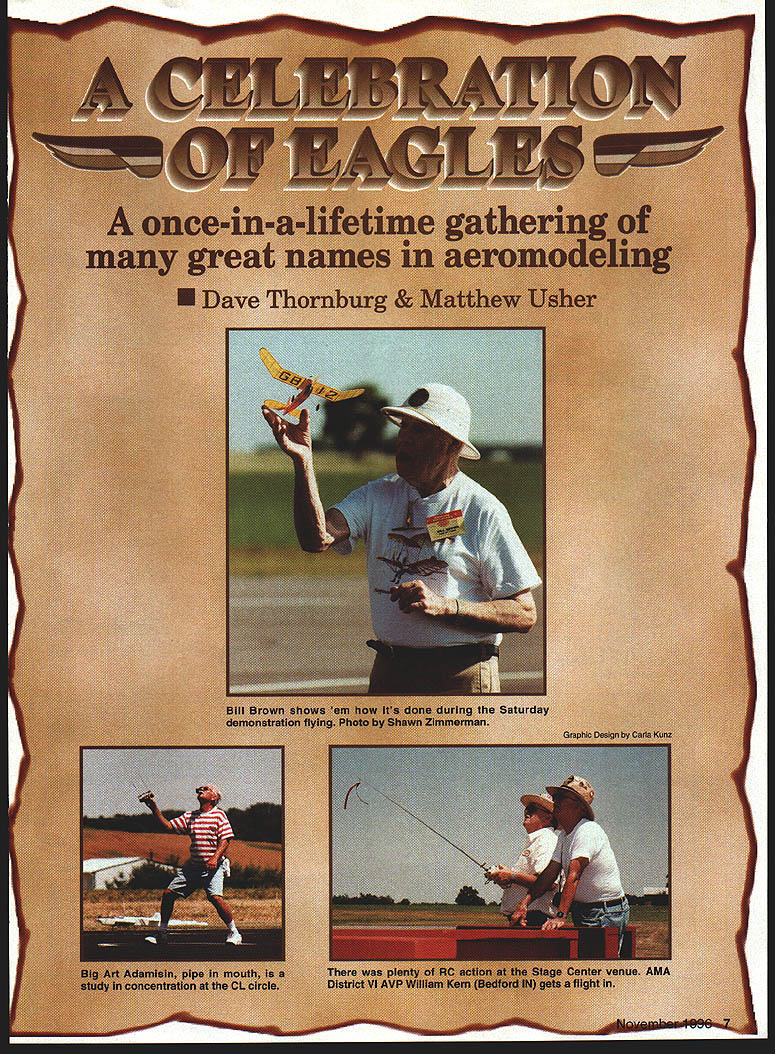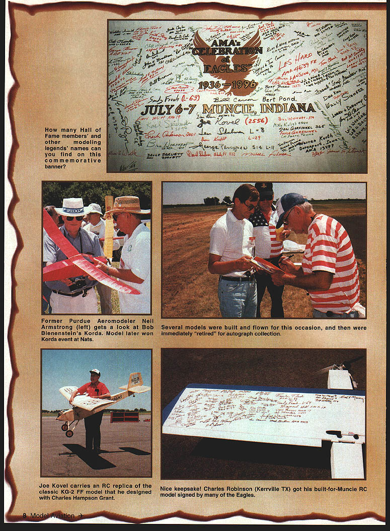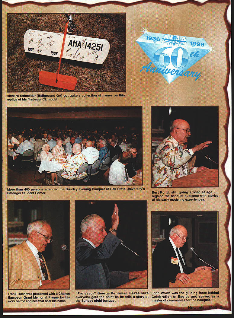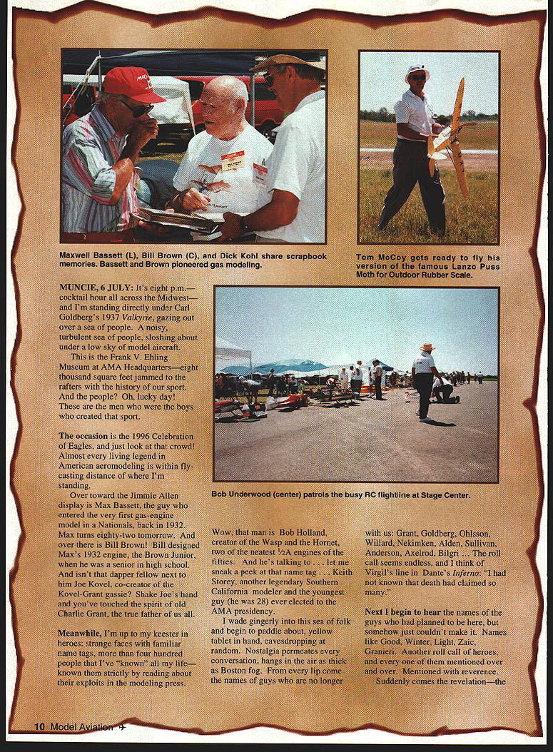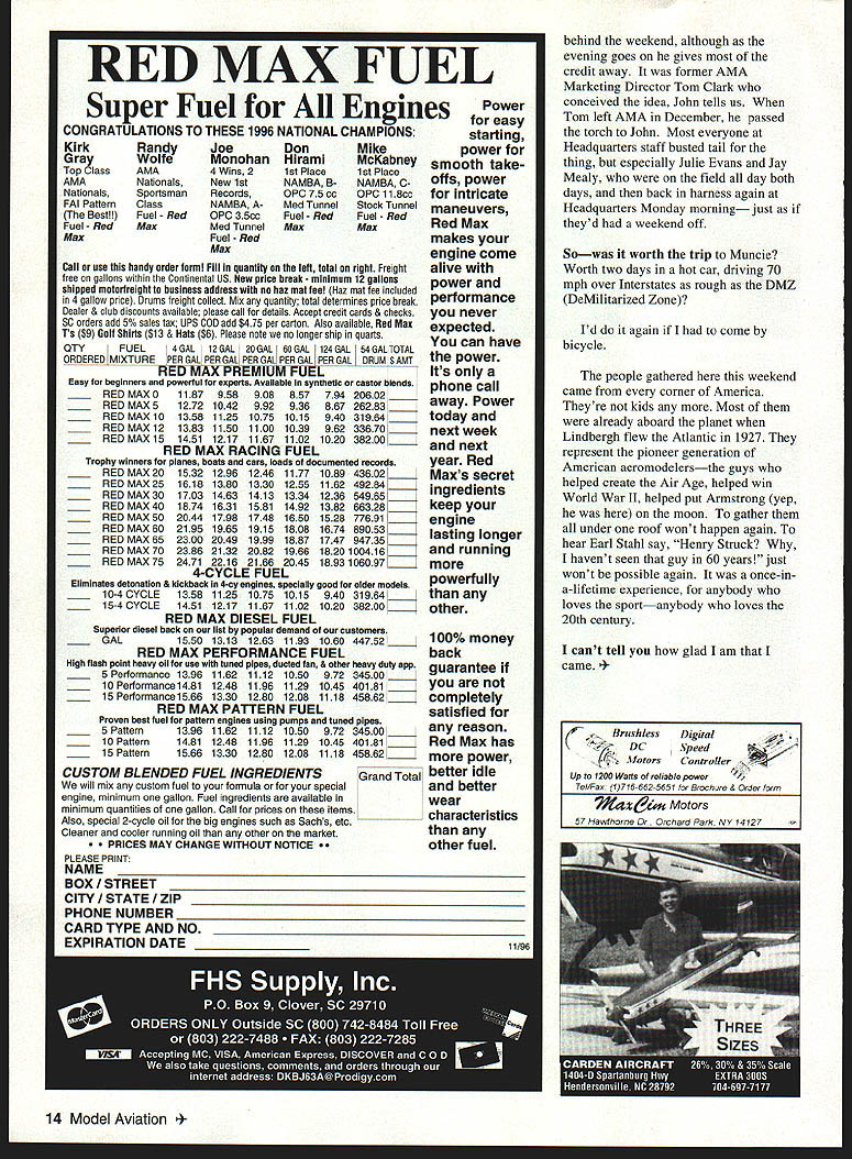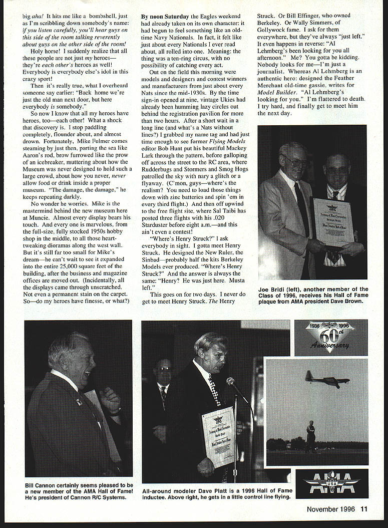 NO OCR TEXT NO OCR TEXT NO OCR TEXT t eated 1 lion aodju big aha hits like bombshell just Im scribbling down somebodys name listen carefully youll hear guys side room talking reverently about guys other side room Holy horse suddenly realize people just heroes theyre others heroes well Everybody everybody elses idol crazy sport its really true what overheard someone say earlier Back home just old man next door everybody somebody So now know heroes have heroes tooeach other What shock discovery stop paddling completely flounder about almost drown Fortunately Mike Fulmer comes steaming just parting sea like Aarons rod brow furrowed like prow icebreaker muttering about Museum never designed hold such large crowd about never never allow food drink inside proper museum damage damage keeps repeating darkly No wonder worries Mike mastermind behind new museum Muncie Almost display bears touch marvelous full-size fully stocked 1950s hobby shop middle hearttweaking dioramas along west wall its still far too small Mikes dreamhe cant wait see expanded entire 25000 square feet building after business magazine offices moved out Incidentally displays came through unscratched permanent stain carpet Sodo heroes have finesse what noon Saturday Eagles weekend already taken its own character begun feel something like oldtime Navy Nationals fact felt like just about Nationals ever read about rolled Meaning thing ten-ring circus no possibility catching act Out field morning models designers contest winners manufacturers just about Nats since mid-1930s time sign-in opened nine vintage Ukies already humming lazy circles out behind registration pavilion two hours After short wait long line whats Nats lines grabbed name tag just time enough see former Flying Models editor Bob Hunt put beautiful Mackey Lark through pattern before galloping off across Street RC area Rudderbugs Stormers Smog Hogs patrolled sky nary glitch flyaway Cmon guyswheres realism need load things down zinc batteries spin em third flight off upwind free flight site Sal Taibi has posted three flights 020 Starduster before eight nmand aint contest Wheres Henry Struck ask everybody sight gotta meet Henry Struck designed New Ruler Sinbadprobably half kits Berkeley Models ever produced Wheres Henry Struck answer always same Henry just Musta left goes two days never get meet Henry Struck Henry Struck Bill Effinger owned Berkeley Wally Simmers Gollywock fame ask everywhere theyve always lust left happens reverse Al Lehmberg s looking afternoon gotta kidding Nobody looks meIm just journalist Whereas Al Lehmberg authentic hero designed Feather Merchant old-time gassie writes Model Builder Al Lehmbergs looking Im flattered death try hard finally get meet him next day November1996 11 Joe Bridi left another member Class 1996 receives Hall Fame plaque AMA president Dave Brown Bill Cannon certainly seems pleased new member AMA Hall Fame Hes president Cannon RIC Systems All-around modeler Dave Platt 1996 Hall Fame inductee Above right gets little control line flying 12 Model Aviation 4Smiles order day Rae Underwood made AMA Fellow Bev Wisniewski also made AMA Eagles Art Laneau grins inducted recognition years volunteer Fellow officiated Control Line AMA Hall Fame work various AMA functions events AMA Nationals Saturday evening reception Frank V Ehling Museum drew capacity crowd Eagles friends families Back radio area out center field crowd has gathered Along comes Phil Greenberg wrote Getting Started RC columns early Flying Models goes Claude McCullough Iowa farmer according old American Modeler cover blurb once built himself Remote Controlled Model Plane before after AMA president Mac stagger down RC flightline under suspiciously blue sky wafted along suspiciously light breeze born just east dont trust Midwestern weather Wowie Look lovely little Strader Chicken Hawk built 1950sbut half well Ah no wonderthats Ted Strader himself sitting beside Glad see sport fliers represented ably Ted built South Wind Ten too Snoopy free flight bipe Theres simply no end famous names awards banquet Sunday night wind up between Joe Wagner Veco Dakota Sioux Brave Comanche Chief etc John Brodak Brodak Manufacturing man turns out speak lovely vintage stunt kits Across table Larry Ginger Scarinzi Larry designed Stunt Combat model got dizzy trying fly junior high gym So does look younger half people look younger know theyre blast Over Lew Mahieu Zeek came out still elementary school Lee Shulmanhe looks like kid brother theres Carl Schmadig Bill Northropboth less gray hair Its just fair what kept young banquet exactly like Nats banquet yore Huge Noisy Too long yet too short same time pinpoint dozen people out flotilla white tablespeople just gotta meet before things break up course doesnt happen Joe Dallaire slips through fingers Ditto Charles Mackey John Worth emcees program As should John moving force November1996 13 Earl Stahl L Henry Struck share some memories good old days rubber-powered twin pushers Bill Brown father Brown Jr engine two early customers Maxwell Bassett L Joe Kovel R Memories models displayed museum afforded opportunity ponder models friends time past Longtime AMA official Earl Wilt L talks things over Bill Cannon Both AMA Hall Fame members KirkRandyJoe GrayWolfeMonohan Top ClassAMA4 Wins 2 AMANationalsNew 1st NationalsSportsmanRecords FAi PatternClassNAMBA AThe BestllFuel RedOPC 35cc Fuel-RedMaxMed Tunnel MaxFuel Red Max Call use handy order torml Fill quantity left total right Freight free gallons within Continental US New price break minimum 12 gallons shipped motorireight business address no haz mat feet Haz mat fee included 4 gallow price Drums freight collect Mix quantity total determines price break Dealer & club discounts available please call details Accept credit cards & checks SC orders add 50/0 sales tax UPS COD add $475 per carton Also available Red Max Ts $9 Golf Shirts $13 & Hats $6 Please note no longer ship quarts QTY FUEL 4GAL 12GAL 2OGAL 6OGAL