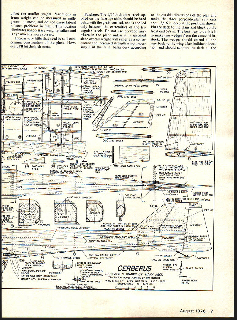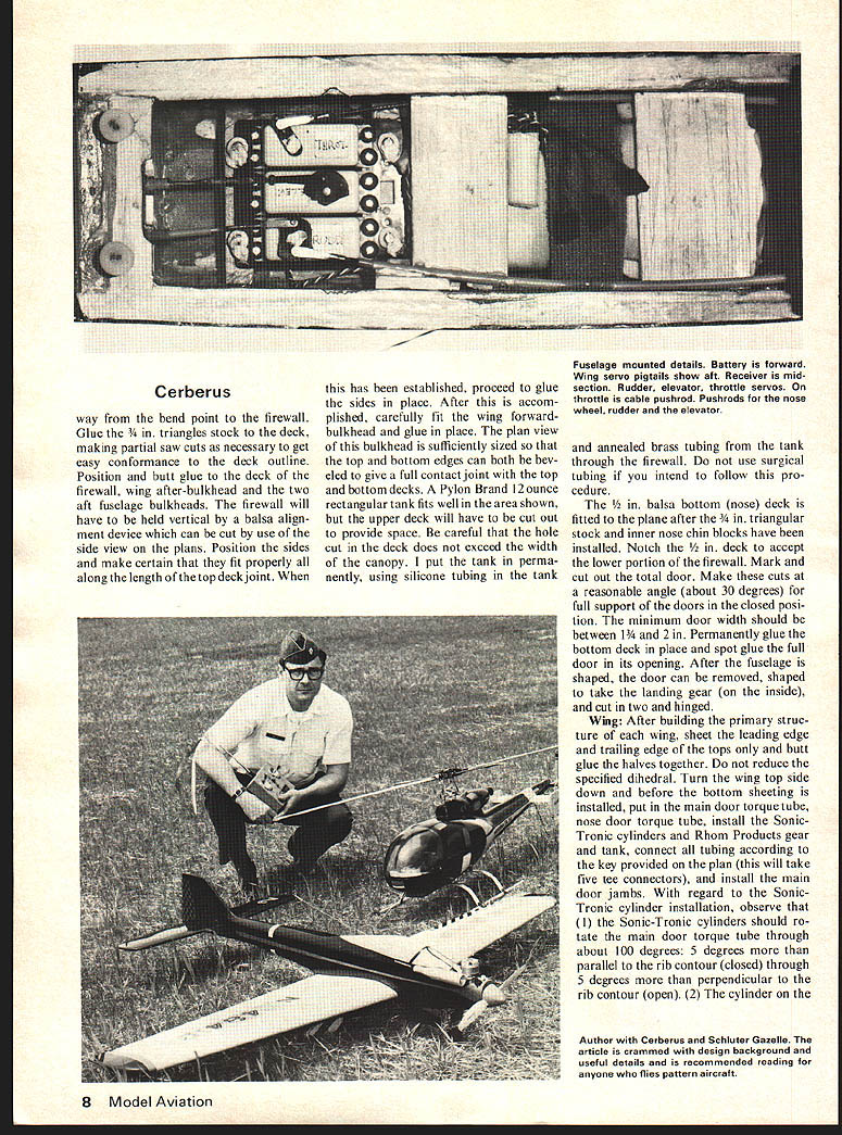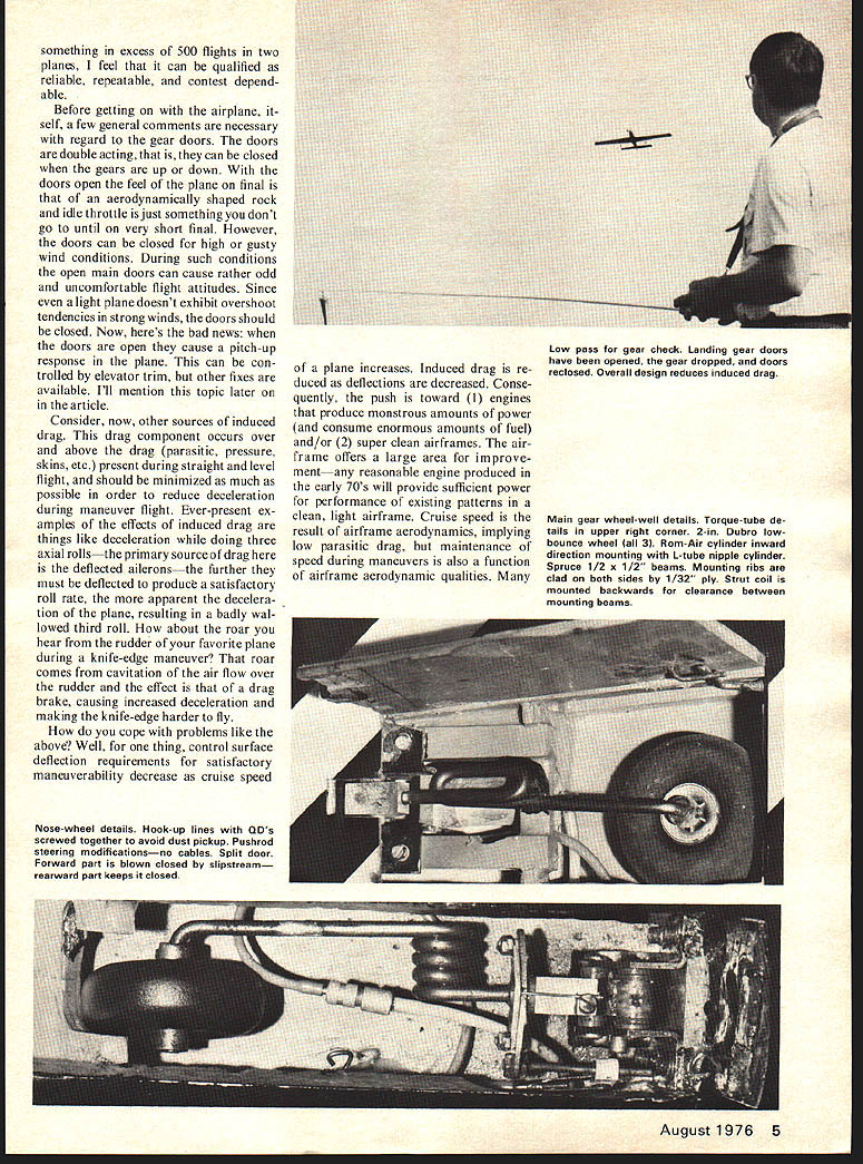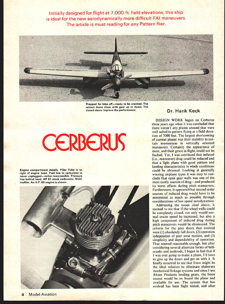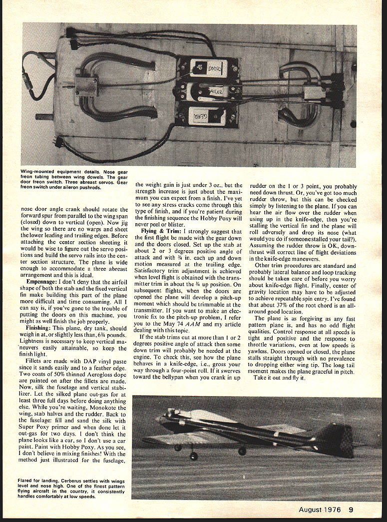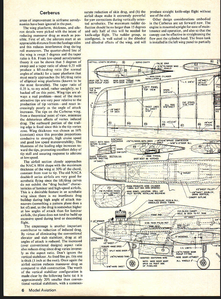 Initially designed flight 7000-ft field elevations ship ideal new aerodynamically difficult FAI maneuvers article must reading Pattern flier CCRBCRU DESIGN WORK began Cerberus three years ago concluded werent planes around well suited pattern flying field eleva tion 7000 feet largest shortcoming current planes inability sus tain momentum vertically oriented maneuvers Certainly appearance grace flight could faulted Yet convinced induced ie maneuver drag could reduced light plane good pattern landing characteristics windy conditions could obtained Looking generally winning airplane types easy con clude open gear wells costly sources dragand produced its worst effects during pitch maneuvers Furthermore appeared second order sources induced drag would have minimized much possible through considerations low speed aerodynamics Addressing issues cited above seemed wheel wells could completely closed would nor mal cruise speed increased also high component induced drag during pitch maneuvers would eliminated criteria gear doors evolved werel absolutely full doors 2 operation independent gear strut motion 3 simplicity dependability operation seemed reasonable enough after considering several alternate forms bellcranks pushrods began feel ever going make plane Id have give up doors get finally occurred freon might ideal solution eliminate elaborate mechanical linkage systems since use Rhom Products landing gears freon source would board plane available use system has evolved has flight tested after 4 Model Aviation Prepped take-offready cranked retract doors close gear up down closed doors improve performanceDr Hank Keck Engine compartment details Filler Tube right engine head Fuel line carburetor never unpluggedrather inaccessible Pressure line behind head HP 61 stock carburetor MAC muffler An HP 60 engine shown something excess 500 flights two planes feel can qualified reliable repeatable contest depend able Before getting airplane self few general comments necessary regard gear doors doors double acting can closed gears up down doors open feel plane final aerodynamically shaped rock idle throttle just something dont go until very short final However doors can closed high gusty wind conditions During such conditions open main doors can cause rather odd uncomfortable flight attitudes Since light plane doesnt exhibit overshoot tendencies strong winds doors should closed Now heres bad news doors open cause pitch-up response plane can con trolled elevator trim other fixes available Ill mention topic later article Consider now other sources induced drag drag component occurs over above drag parasitic pressure skins etc present during straight level flight should minimized much possible order reduce deceleration during maneuver flight Ever-present ex amples effects induced drag things like deceleration doing three axial rollsthe primary source drag deflected ailerons further must deflected produce satisfactory roll rate apparent decelera tion plane resulting badly wal lowed third roll about roar hear rudder favorite plane during knife-edge maneuver roar comes cavitation air flow over rudder effect drag brake causing increased deceleration making knife-edge harder fly cope problems like above Well thing control surface deflection requirements satisfactory maneuverability decrease cruise speed Nose-wheel details Hook-up lines QDs screwed together avoid dust pickup Pushrod steering modificationsno cables Split door Forward part blown closed slipstream rearward part keeps closed plane increases Induced drag re duced deflections decreased Conse quently push toward 1 engines produce monstrous amounts power consume enormous amounts fuel and/or 2 super clean airframes air frame offers large area improve ment reasonable engine produced early 70s will provide sufficient power performance existing patterns clean light airframe Cruise speed result airframe aerodynamics implying low parasitic drag maintenance speed during maneuvers also function airframe aerodynamic qualities Main gear wheel-well details Torque-tube de tails upper right corner 2-in Dubro lowbounce wheel 3 Rom-Air cylinder inward direction mounting 1-tube nipple cylinder Spruce 1/2 x 1/2 beams Mounting ribs clad both sides 1/32 ply Strut coil mounted backwards clearance between mounting beams August1976 5 Low pass gear check Landing gear doors have opened gear dropped doors reclosed Overall design reduces induced drag Cerberus areas improvement airframe aerody namics have ignored past wing planform thickness aile ron details picked intent reducing maneuver drag much pos sible First ailerons start appreciable distance fuselage sides reduces interference drag during roll maneuvers quarter-chord line wing swept 5 degrees taper ratio 06 low-speed aerodynamic theory can shown 5 degrees sweep taper ratio about 035 will produce lift-to-drag ratio normal angles attack taper planform nearly approaches lift/drag ratio elliptical wing planforms known favorable taper ratio 035 mind rather unsightly backed off point Wing tips al ways real problemmost attractive tips very poor relative production tip vortices react creasingly poorly angle attack increases tips Cerberus wing theoretical point view minimize deleterious effects vortex induced drag outboard portion trail ing edge fixed since tip vortex zone Wing thickness chosen 16% constant since provides proportions conducive strength high cruise speed good low speed maneuverability bluntness leading edge increases ward tips promoting excellent delay tip stall assuring response ailerons low speed airfoil section closely approaches NACA 0016 shape maximum thickness wing 30% chord constant root tip old NACA double-0 series airfoils very good acrobatic flying since lift/drag curves exhibit drag bucket charac teristics laminar high-speed airfoils desirable feature acrobatic wing since no inordinate drag buildup during high angle attack ma neuvers something pattern plane does lot drag somewhat higher low angles attack 