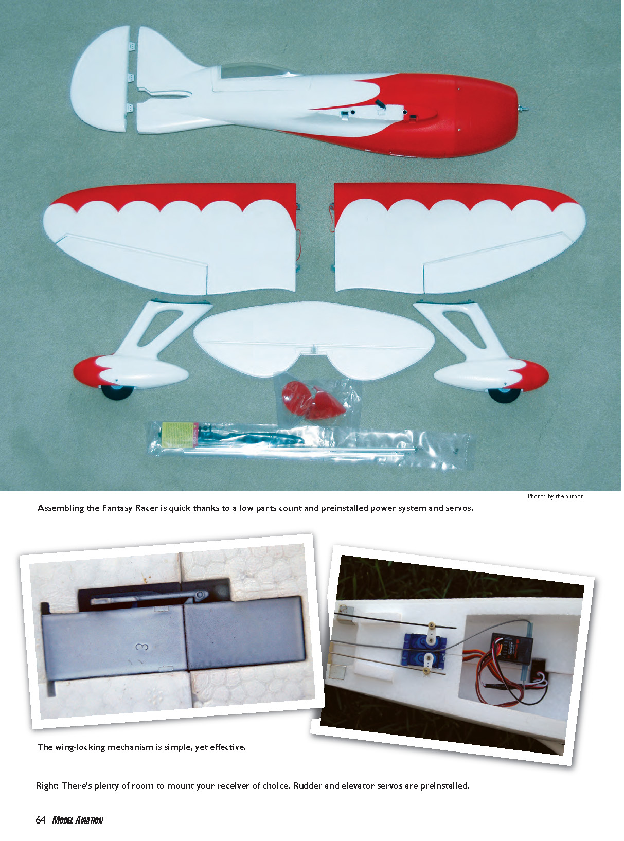 Left: Aileron servos are preinstalled with the linkages already connected. Note the two wing-locking mechanisms on the right side of the