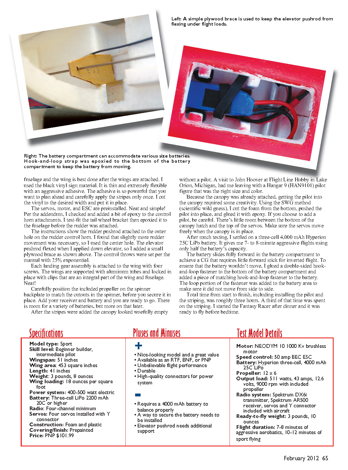 Right: There’s plenty of room to mount your receiver of choice. Rudder and elevator servos are preinstalled.