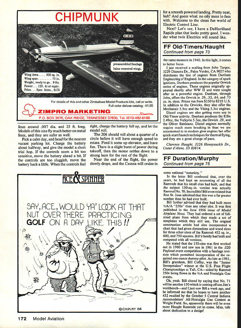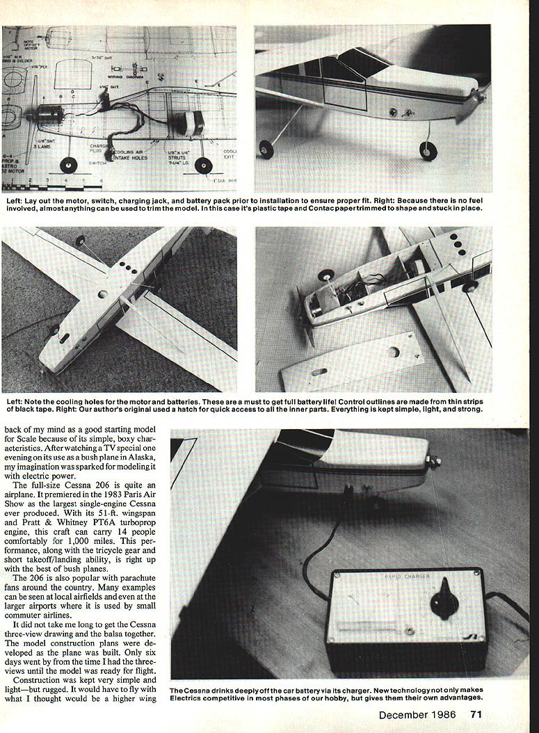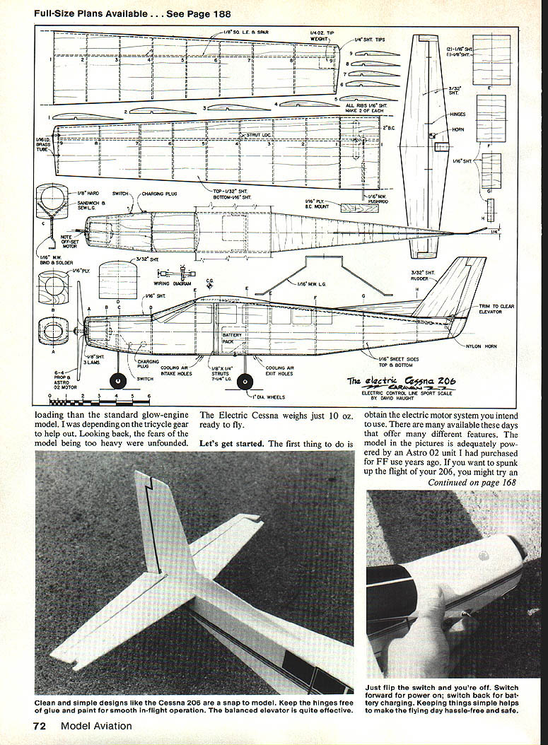.ontrol Line tricycle landing gear provides very smooth landings Cessna 06 Modeled after Cessnas largest single-engine plane simple-to-build electric-powered Control Line model makes perfect transition clean quiet world kind power plant U Dave Haught WHAT WOULD say about model costs virtually nothing fly uses no fuel does get oily after flight flies hum neighborhood parking lot Sounds interesting Too good true Just stick around hear story Electrics have invaded Control Line circles looks though stay intrigued pictures CL Electrics different magazine columns brief encounter Electrics Free Flight Scale few years ago did impress weight power unit just too much could get myself add lightweight FF model natural After reading success others having electric-powered CL models decided time give try sol blew off dust settled old Astro power unit charger Cessna 206 Caravan 70 Model Aviation Left Ready take passengers Cessna 206 shows off its boxy lines same lines made appealing simple quick-to-build semiscale model lull-size version real workhorse Above Cessna takes very little room fly probably makes less noise passing cara great combination cant find large secluded place fly Left Lay out motor switch charging jack battery pack prior installation ensure proper fit Right Because no fuel involved almostanything can used totrim model case its plastic tape Contac papertrlmmed shape stuck place back mind good starting model Scale because its simple boxy char acteristics After watching TV special evening its use bush plane Alaska imagination sparked modeling electric power full-size Cessna 206 quite airplane premiered 1983 Paris Air Show largest single-engine Cessna ever produced its 51-ft wingspan Pratt & Whitney PT6A turboprop engine craft can carry 14 people comfortably 1000 miles per formance along tricycle gear short takeoff/landing ability right up best bush planes 206 also popular parachute fans around country examples can seen local airfields larger airports used small commuter airlines did take long get Cessna three-view drawing balsa together model construction plans de veloped plane built Only six days went time threeviews until model ready flight Construction kept very simple lightbut rugged would have fly what thought would higher wing December 1986 71 Left Note cooling holes motor batteries must get full battery life Control outlines made thin strips black tape Right authors original used hatch quick access inner parts Everything kept simple light strong Cessna drinks deeplyoff car batteryvia its charger Newtechnology notonly makes Electrics competitive phases hobby gives own advantages Full-Size Plans Available. See Page 188 I/BSO LA IN SFINRI/40Z TIP WEIGHT L4SHT TIPS II IIIIIII ____________I Sill671T911 IIIIIIII IIIIII ii Liu 4 RIBS IA Sm ____MARE S OF EACH -tr ii -41- 5AII~LIL24TIMEBIt711Bi~I311_211_-4 I Ii IIIIIiii 1I IIItI III kII~~~11~ TOP-I/SS SHT BOTTOM-LITR SNTI/I6ItW 1A6 PLY BC MGI*IT VB HARDSWITCHCHARGING PLUG SAMIRICH SEW LG c Hi MOTOR____ 1/16 MW ate SOLDER jI/IRPLT B N PROP 8 ASTRO OS MOTOR 0 I 2 3/32 SHT HINGES HORN E I/TIN SHT r Ii 1/4 ___NYLON HORN \1/16 SHEET SIDES TOP B BOTTOM PLUGCOOLING AIRCODUNG AIR EXIT HOLES 3456 GIA WHEELS Th aiectri ~fla 20e ELECTRIC CONTROL LINE SPORT SCALE BY DAVID HAUBIT Electric Cessna weighs just 10 oz ready fly loading standard glow-engine model depending tricycle gear help out Looking back fears model being too heavy unfounded Lets eet started first thino Clean simple designs like Cessna 206 snap model Keep hinges free glue paint smooth in-flight operation balanced elevator quite effective obtain electric motor system intend use available days offer different features model pictures adequately pow ered Astro 02 unit purchased FF use years ago want spunk up flight 206 might try Continued page 168 Just flip switch youre off Switch forward power switch back bat tery charging Keeping things simple helps make flying day hassle-free safe 72 Model Aviation nylon prop will save money over wood variety use 10-6 has plenty flywheel effect help start engine prop gear also help ricochet off ground during matches object keep cost per mach low life-expectancy model high areas noise still problem VooDoo/Fox combination Ive mentioned before would give little performance whereas full-bodied model would give better protection muffler would balance better has ability use stooge launching Flying style would also need modiing Stealth Combat wont fun other variety practically match ends midair suggestion would start off slowly doing wingovers playing leapfrog using other simple maneuvers Stand right next opponent dont run around flap arms use wrist-action flying youll able fly consecutive loops around oppo nents lines getting tied up style looked impressive during diesel days Europe theyd 20 consecutive insides followed same number outsides keep lines clear running 100-yard dash around circle wildly waving arms around thereby snagging opponents lines lockingthem together during tangle ever formal contest using such models flying style think adopting Cartier Five-Round System would best bet Everyone flies least five rounds points matches added together highest combined score placing first such mellow models pilots tuned fun might possible pilot fly 10 matches day C artier System sit down day after two mid-airs both pilots Out completely either model cut away may very harsh rules banzai-type flying has strongly discouraged event will just another 70-mph-midair meet Ive very little experience muffled Combat engines others flying mufflers have good engine suggest please let know about can make smart purchases start Charlie Johnson 3716 Ingraham St San Diego CA 92109 CL Navy Carrier/Perry Continued page 69 leasing line slider could also use flexible line pushrod-and-bellcrank arrange ment connected tail hook lines would released tail hook falls essential once line guide released must immediately move fully aft stay common method achiev ing effect use rubberband move