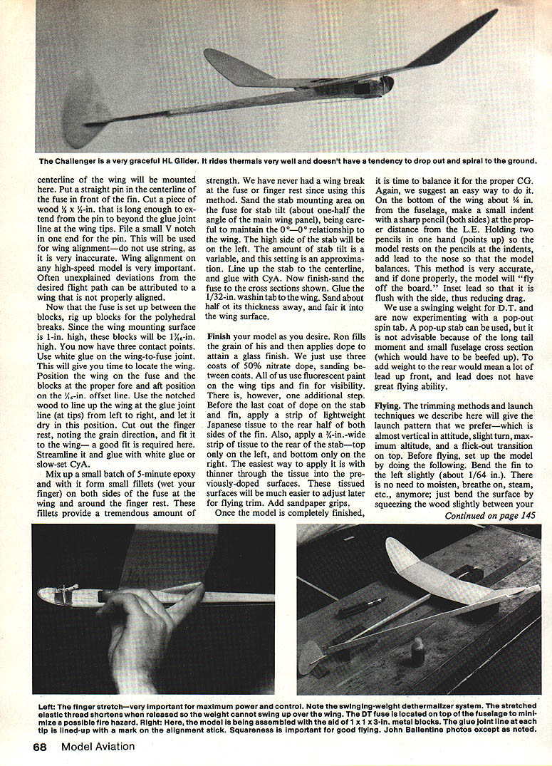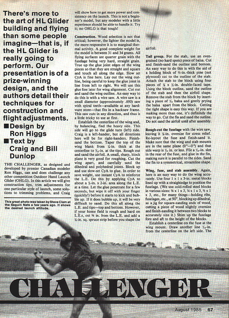 Theres art HL Glider building flying some people imaginethat HL Glider really going perform presentation prize-winning design authors detail techniques construction flight adjustments Design Ron Higgs Text Craig Bill Dunlop THE CHALLENGER designed developed premier Canadian modeler Ron Higgs can does challenge other competition Outdoor Hand Launch Glider OHLG article will give construction tips trim adjustments particular style launch some solu tions trimming problems Craig will show get powe sistency launch n ners model modeler wi experience should able har no OHLG tough Construction Wood critical however the responsive LC mal activity good model between 31 aim flying surfaces quarter grai~ fuselage being very hard sti True up glue joint edges oi pieces straight sc touch along edge Slow CyA fine Lay out wing Out line being careful keep glue joint line left right will use glue line later wing alignment Cut out sand wing outline An easy way wire saw wire saw small diameter approximately 050 saw spiral teethavailable hard ware storethat fits hacksaw frame saw cuts direction thus little tricky use first Establish centerline wing balancing find heavy side side will go glide turn left side Craig left-hander directiops will right-handers Finishsand bottom Taper top wing blank A-in thick centerline %2-in tips Rough out sand airfoil small sharp block plane very good roughing Cut wing apart carefully sand dihedral polyhedral joints Block up use slow-set CyA glue order save weight use instant CyA reinforce LE applying CyA about Y4-in x 2-ii area along LE time Let glue penetrate few seconds wipe off finger quickly before starts kick bub ble up does bubble up will very difficult sand along LE tipstop bottom However home field rough hard LEs cut dd A-in sq spruce strip before shape the stab use snots piece balsa Cut e outline bottom aid -in-thick pine outline stab block using four x A-in double-faced tape using block outline sand outline stab airfoil shape Remove stab block insert ing piece /32 balsa gently prying balsa apart block Getting right shape easy way making its definitely way go Cut fm sand outline sand airfoil until after assembly Rough-cut fuselage wire saw leaving A-in oversize stress relief Re-layout fuse finish-sand Make sure th same plane side warp A2 less rear fuse making sure fin symmetrical stre great photo taken bySteve Clem Seguin Nats few years ago shows desired launch attitude centerline wing will mounted Put straight pin centerline fuse front fin Cut piece wood x A-in long enough ex tend pin beyond glue joint line wing tips File small V notch end pin will used wing alignmentdo use string very inaccurate Wing alignment high-speed model very important Often unexplained deviations desired flight path can attributed wing properly aligned Now fuse set up between blocks rig up blocks polyhedral breaks Since wing mounting surface 1-in high blocks will 1Y16-in high now have three contact points Use white glue wing-to-fuse joint will give time locate wing Position wing fuse blocks proper fore aft position A-in offset line Use notched wood line up wing glue joint line tips left right let dry position Cut out finger rest noting grain direction fit wing good fit required Streamline glue white glue slow-set CyA Mix up small batch 5-minute epoxy form small fillets wet finger both sides fuse wing around finger rest fillets provide tremendous amount strength have never wing break fuse finger rest since using method Sand stab mounting area fuse stab tilt about one-half angle main wing panel being care ful maintain 0 Jo relationship wing high side stab will left amount stab tilt variable setting approxima tion Line up stab centerline glue CyA Now finish-sand fuse cross sections shown Glue 1/32-in washin tab wing Sand about half ot its thickness away fair wing surface Finish model desire Ron fills grain applies dope attain glass finish just use three coats 50% nitrate dope sanding tween coats us use fluorescent paint wing tips fin visibility however additional step Before last coat dope stab fin apply strip lightweight Japanese tissue rear half both sides fin Also apply Y4-in-wide strip tissue rear stabtop left bottom right easiest way apply thinner through tissue pre viously-doped surfaces tissued surfaces will much easier adjust later flying trim Add sandpaper grips Once model completely finished time balance proper CG Again suggest easy way bottom wing about lage make small indent sharp pencil both sides prop er distance LE Holding two pencils hand points up model rests pencils indents add lead nose model balances method very accurate done properly model will fly off board Inset lead flush side thus reducing drag use swinging weight DT now experimenting pop-out spin tab pop-up stab can used advisable because long tail moment small fuselage cross section would have beefed up add weight rear would mean lot lead up front lead does have great flying ability Hying trimming methods launch techniques describe will give launch pattern preferwhich almost vertical attitude slight turn max imum altitude flick-out transition top Before flying set up model doing following Bend fin left slightly about 1/64 no need moisten breathe steam etc anymore just bend surface squeezing wood slightly between Continued page 145 Left finger stretchvery important maximum power control Note swinging-weight dethermalizer system stretched elastic thread shortens reieased weight cannot swing up over wing DT fuse ocated top fuselage mini mize possible fire hazard Right model being assembled aid 1 xl x 3-In metal blocks glue joint line tip i lined-up mark alignment stick Squareness important good flying John Ballentine photos except noted 68 Model Aviation Chailenger very graceful HI Gilder rides thermals very well doesnt have tendency drop out spiral ground 904 478-6745 Al Featuring fast service qualified people latest equipment including SPECTRUM ANAL YZER AM FM SIGNAL GENERATOR Call Sam Leonard Tony Stiliman custom work com