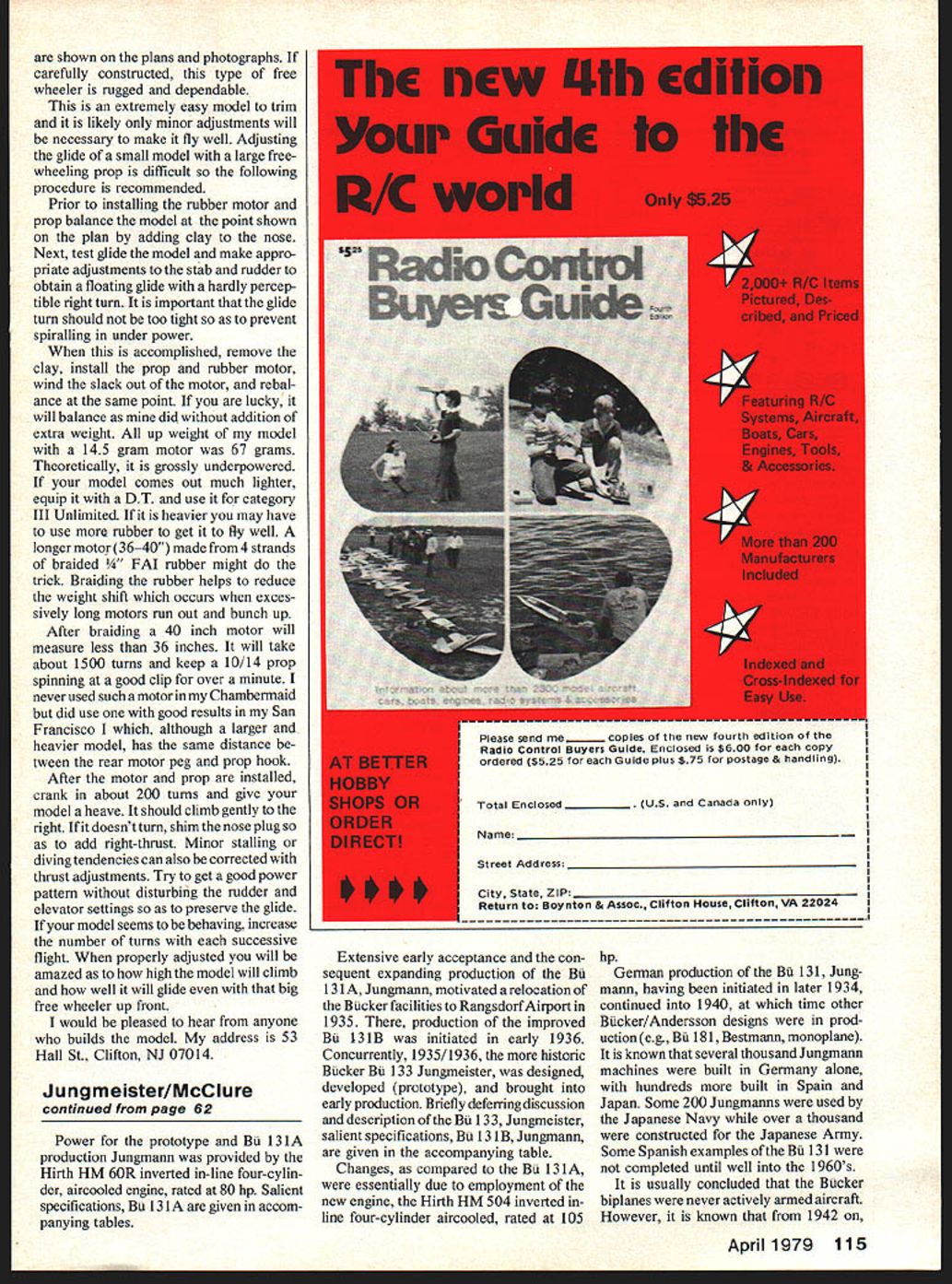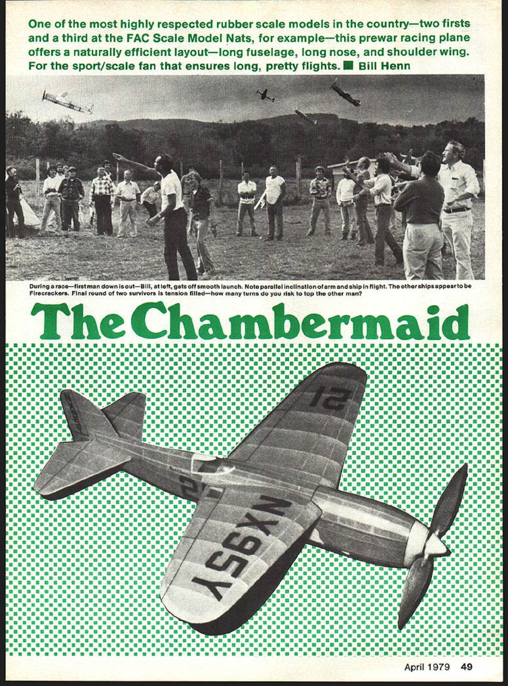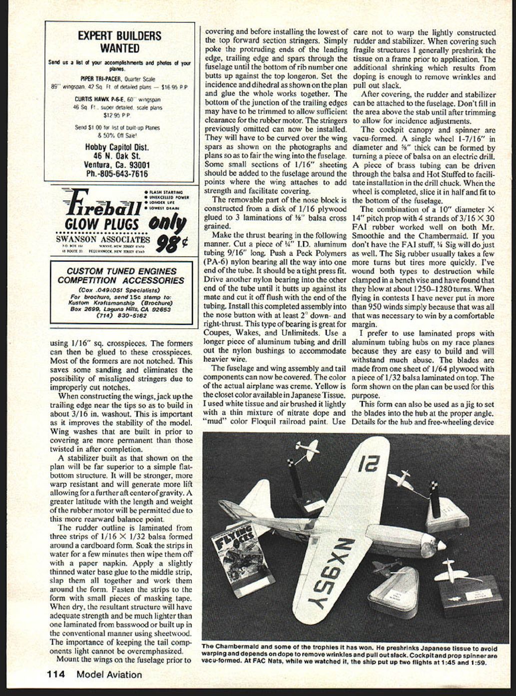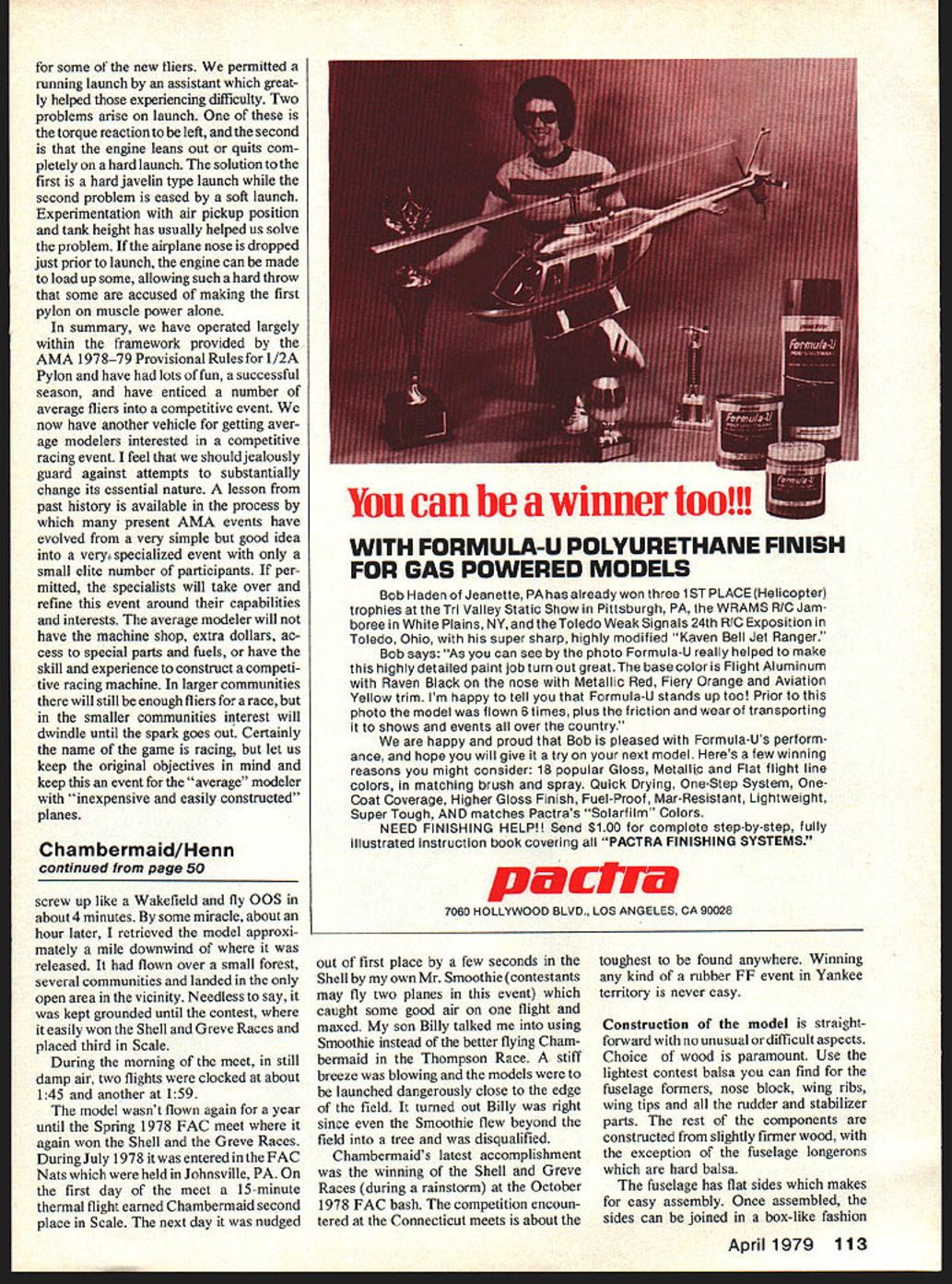 One highly respected rubber scale models countrytwo firsts third FAC Scale Model Nats examplethis prewar racing plane offers naturally efficient layoutlong fuselage long nose shoulder wing sport/scale fan ensures long pretty flightsE Bill Henn curing racetarsi man aown outaii ion gets ott smootn launon Note parallel Inclination otarm snip flight othershipsappeartO Firecrackers Final round two survivors tension filledhow turns risk top other man Chambermaid Bummum .u..mu mmuuu mm .....mmuuu.muu.u.uu UUU U U EU mini Eu. .....uu.u U ENUEUEME UUUUUUUUU UU uummuummumuuumuummummuuumummumuuuuruuumuuumummmmuui Eummmm.mm..muuuuuu..u.uu.uuumuumuu mmu.uu.ummmm.uu...m.u. muumuummummmummm.uummuumuuumuumruu.u.uuu ummmuu.uu.muumuuuu.mul..mmu.u.I Im.uuu..uu...mu..uu.. mumuuummummruuuuuuuuuummmmuurmmmmmmumuI Em..U. ......uuum u.muuu... umuumumumuummr uuu. U..um.umum.uu umuEEuUuuUUI mm..mu.uu.m umuu..u.m mu....um..mr um.u.u.umI lmummukUUUUU IUUUUUEUEUUEU uu..uuuuuuI uuumummuumr .mu umu.u..u.ma I...uum.u. uuuummuum U.. 1mmu uumUUuu U.~1EU lummiu..m. Eu. mu U.I..u.uuml mu. Eu.um.um.ur uu U..u.m.. urn Em.mmmmm.mu 1Mm U.mm.uuu. mu mumm mmuummmmmmr mum mumam. uuuuumu mmml HUEiUUEC mm mm. JummumumuLmU qmuuuusEEm mum u..uumm. mum rmmmi ..mu.ummmmummUmmmmm. mmmmmummmmmmummmuumquamummi mummum mm..m mumumur muum umum mummum mummum mummummi mumummmmuuummmmmmmimumum umummumummmmmmmmuumwmm. mumummmmummmmmmmmmuimumum mummmmuummmmmmmmmumuuinUUi mmmmmummmmmummmumummumum mm ummumum ummumumum pimminmi mmmmuummmuuummummumumum mmmmmmmmmmmm.mmimmumi muummuuuumumuuummuu mJuumu mmmummmmummmmmmmmm umhjummummi mmmmmmumummummmmmm mumumumummum ummummmmmmmmmmumm mmummumummummi mmmmmumummmmummmr aummummumumum mumummum mmmmuininmminuinmmuui mummumumumummummummi immummum mum... umumummmummu ummummuin mumummummmm.u ummummummummmmmuumi ummmmmmmmmmmmmmmi mmumummumumi mumumumin mmmmmmuummmummmmu mmmmmmmmmmmumummummi Eummummmumummmmumh uuuuumuuumm uminmummin mmmmmummummuuummmu ummuumuummu mummummi mmmmummmmmmmmmmm aumummmummmmmuw mmumum mmmmmmmmummumummmmmummumumummum. umumumi mmmmmumummmmmmuiuinmmmmmu mmmumumumUummmmummLummmmmmmummmmmmmmmmminmi EmmmmmummmuumuummmmmumuumumummuumbuumummmmmE ummummmmmmmummmmmmmm--ummmummummmmmmuummmuumumumml mm. mum... mum... mmmmmm mu.uumm umummum mm mummum m mumum. mumum ummummum mu.. mum.. ummumummummum ummum_ma April 1979 49 ms up Slmulate6 rev triangular bloc ore 1/64 plywood p ium hub Note elm fouratrande 3 umg before blowln rally smaller low fell out sk over coni shoulder wing mode f6llowing v simplified 24-in Sm ounce lightei e performance d fli2hts 85yu isfaction th noothie led ect t meet ruseiage ano sun navt obLa An Florida 3 time crafi over ALt tatE RiDS eldS&ET WA ArL OT1 OF Re Wi aim-Smws- rnAR,tzS Au S-ixwez* Ptuco &LiR2S V.EReWTlIJ TZTAIA. ZI US$i AJ AS FiGR AS ir 4iUDo AAV Din- DSP w7W-rusa 8TA7TNA fIIjWTW0m4 I I1IIIAift ST T z3-UA ~ FAiSR-D LA*wv*wz OirwEjJ PTCH DNSJG D BY B LUEPJN CHAMBEMAItJ LITOM3A~I IFOUl*aS3YR3UR8CHE 54J DALE ETIDEET BVoN PARL ~ti OEoAEDR PA74JL ktS _Li _____________________________ LSIZE PLANS AVAILABLE SEE PAGE 120 ii II Li IJ III NO OCR TEXT NO OCR TEXT some new fliers permitted running launch assistant great ly helped experiencing difficulty Two problems arise launch torque reaction left second engine leans out quits com pletely hard launch solution first hard javelin type launch second problem eased soft launch Experimentation air pickup position tank height has usually helped us solve problem airplane nose dropped just prior launch engine can made load up some allowing such hard throw some accused making first pylon muscle power alone summary have operated largely within framework provided AMA 197 879 Provisional Rules l/2A Pylon have lots fun successful season have enticed number average fliers competitive event now have another vehicle getting aver age modelers interested competitive racing event feel should jealously guard against attempts substantially change its essential nature lesson past history available process present AMA events have evolved very simple good idea very specialized event small elite number participants per mitted specialists will take over refine event around capabilities interests average modeler will have machine shop extra dollars ac cess special parts fuels have skill experience construct competi tive racing machine larger communities will still enough fliers race smaller communities interest will dwindle until spark goes out Certainly name game racing let us keep original objectives mind keep event average modeler inexpensive easily constructed planes Chambermaid/Henn continued page 50 screw up like Wakefield fly 005 about 4 minutes some miracle about hour later retrieved model approxi mately mile downwind released flown over small forest several communities landed open area vicinity Needless say kept grounded until contest easily won Shell Greve Races placed third Scale During morning meet still damp air two flights clocked about 145 another 159 model wasnt flown again year until Spring 1978 FAC meet again won Shell Greve Races During July 1978 entered FAC Nats held Johnsville PA first day meet 15-minute thermal flight earned Chambermaid second place Scale next day nudged Bob Haden Jeanette PA has already won three 1ST PLACE Helicopter trophies Tn Valley Static Show Pittsburgh PA WRAMS RIG Jam boree White Plains NY Toledo Weak Signals 24th R/G Exposition Toledo Ohio super sharp highly modified Kaven Bell Jet Ranger Bob says As can see photo Formula-U really helped make highly detailed paint job turn out great base color Flight Aluminum Raven Black nose Metallic Red Fiery Orange Aviation Yellow trim Im happy tell Formula-U stands up tool Prior photo model flown 6 times plus friction wear transporting shows events over country happy proud Bob pleased Formula-Us perform ance hope will give try next model Heres few winning reasons might consider 18 popular Gloss Metallic Flat flight line colors matching brush spray Quick Drying One-Step