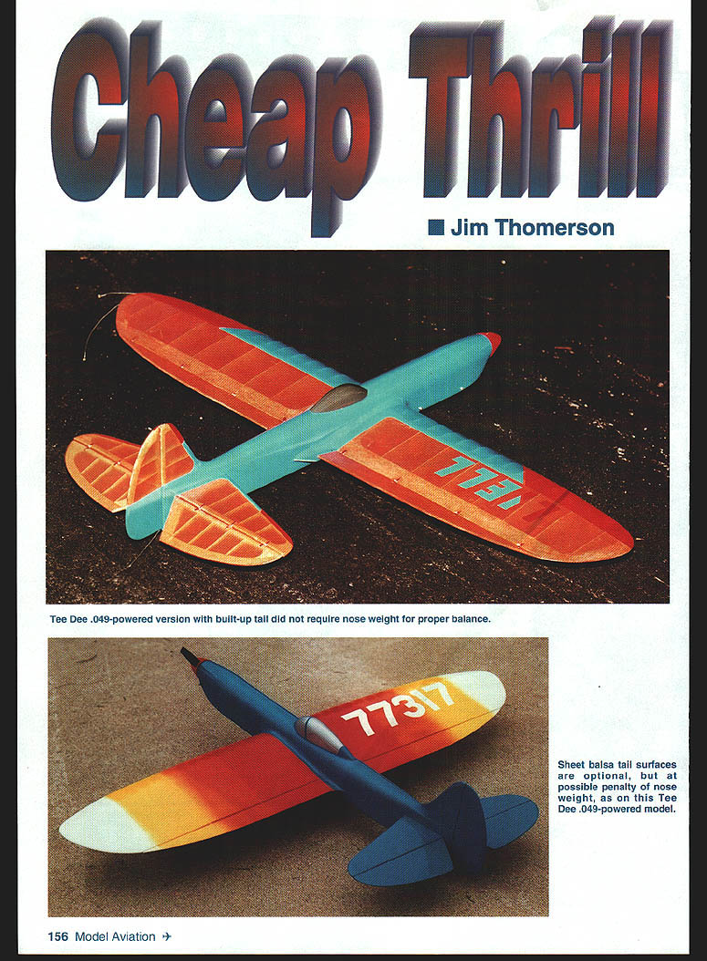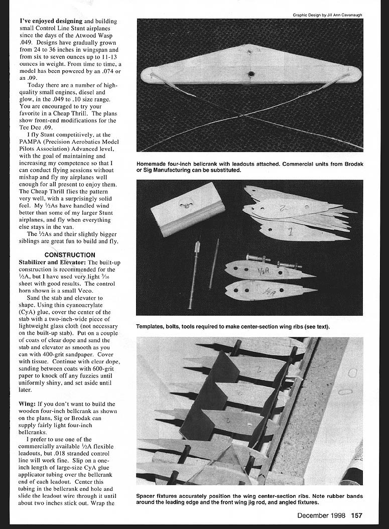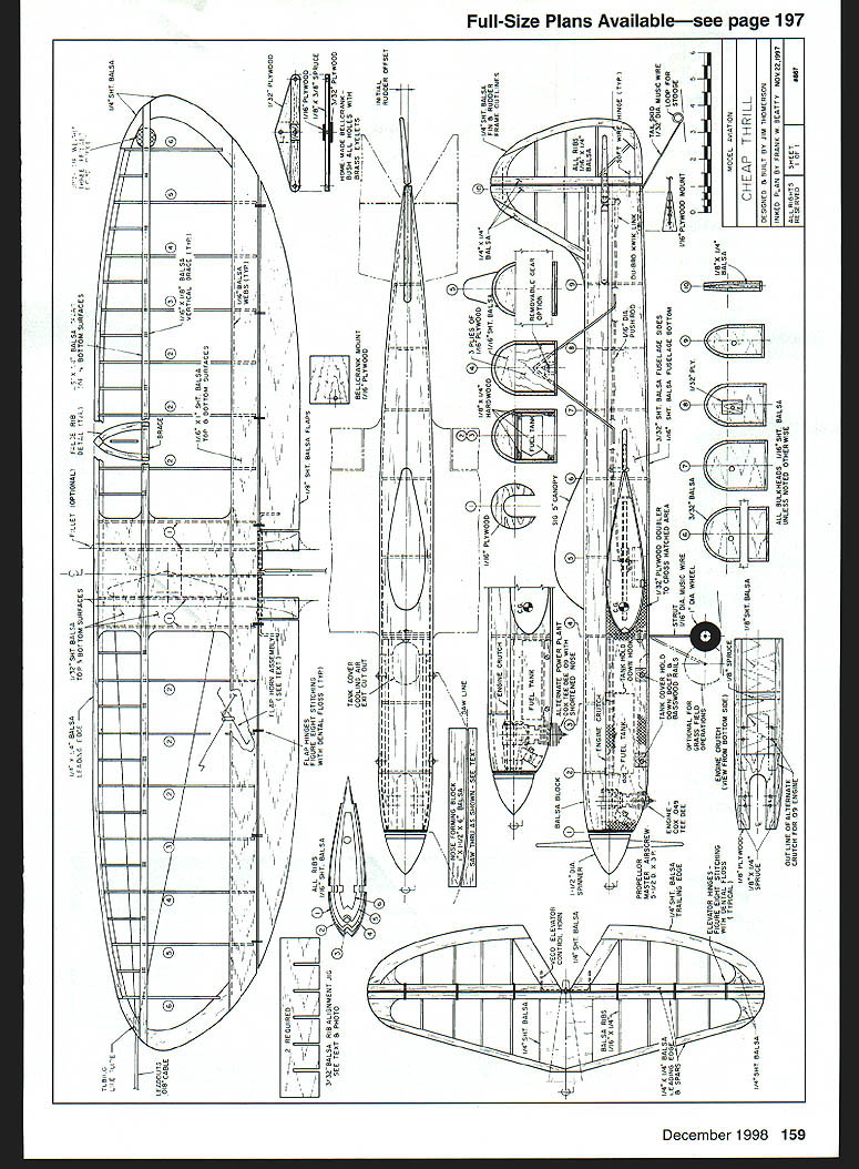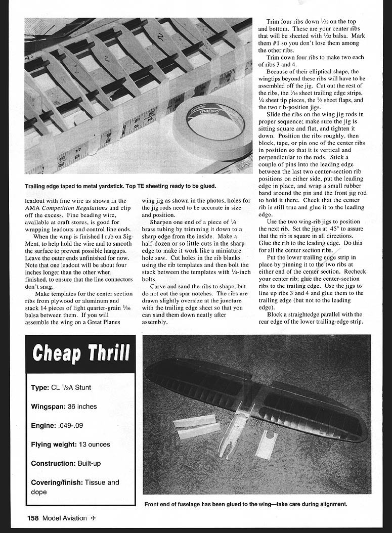 Sheet balsa tail surfaces optional possible penalty nose weight Tee Dee 049-powered model 156 Model Aviation m Thomerson Tee Dee 049-powered version built-up tail did require nose weight proper balance Ive enjoyed designing building small Control Line Stunt airplanes since days Atwood Wasp 049 Designs have gradually grown 24 36 inches wingspan six seven ounces up 11-13 ounces weight time time model has powered 074 09 Today number highquality small engines diesel glow 049 10 size range encouraged try favorite Cheap Thrill plans show front-end modifications Tee Dee 09 fly Stunt competitively PAMPA Precision Aerobatics Model Pilots Association Advanced level goal maintaining increasing competence can conduct flying sessions mishap fly airplanes well enough present enjoy Cheap Thrill flies pattern very well surprisingly solid feel 1/2As have handled wind better some larger Stunt airplanes fly everything else stays van 1/As slightly bigger siblings great fun build fly CONSTRUCTION Stabilizer Elevator built-up construction recommended /2A have used very light /16 sheet good results control horn shown small Veco Sand stab elevator shape Using thin cyanoacrylate CyA glue cover center stab two-inch-wide piece lightweight glass cloth necessary built-up stab Put couple coats clear dope sand stab elevator smooth can 400-grit sandpaper Cover tissue Continue clear dope sanding between coats 600-grit paper knock off fuzzies until uniformly shiny set aside until later Wing If dont want build wooden four-inch bellcrank shown plans Sig Brodak can supply fairly light four-inch bellcranks prefer use commercially available /2A flexible leadouts 018 stranded control line will work fine Slip oneinch length large-size CyA glue applicator tubing over bellcrank end leadout Center tubing bellcrank end hole slide leadout wire through until about two inches stick out Wrap Graphic Design Jill Ann Cavanaugh December1998 157 Homemade four-inch belicrank leadouts attached Commercial units Brodak Sig Manufacturing can substituted Templates bolts tools required make center-section wing ribs see text Spacer fixtures accurately position wing center-section ribs Note rubber bands around leading edge front wing jig rod angled fixtures leadout fine wire shown AMA Competition Regulations clip off excess Fine beading wire available craft stores good wrapping leadouts control line ends wrap finished rub Sig Ment help hold wire smooth surface prevent possible hangups Leave outer ends unfinished now Note leadout will about four inches longer other finished ensure line connectors dont snag Make templates center section ribs plywood aluminum stack 14 pieces light quarter-grain A6 balsa between will assemble wing Great Planes wing jig shown photos holes jig rods need accurate size position Sharpen end piece 1/4 brass tubing trimming down sharp edge inside Make half-dozen little cuts sharp edge make work like miniature hole saw Cut holes rib blanks using rib templates bolt stack between templates /4-inch bolts Carve sand ribs shape cut spar notches ribs drawn slightly oversize juncture trailing edge sheet can sand down neatly after assembly Trim four ribs down /32 top bottom center ribs will sheeted /32 balsa Mark #1 dont lose among other ribs Trim down four ribs make two ribs 3 4 Because elliptical shape wingtips beyond ribs will have assembled off jig Cut out rest ribs A6 sheet trailing edge strips sheet tip pieces 1/ sheet flaps two rib-position jigs Slide ribs wing jig rods proper sequence make sure jig sitting square flat tighten down Position ribs roughly block tape pin center ribs position vertical perpendicular rods Stick couple pins leading edge between last two center-section rib positions either side put leading edge place wrap small rubber band around pin front jig rod hold Check center rib still true glue leading edge Use two wing-rib jigs position next rib Set jigs 450 assure rib square directions Glue rib leading edge center section ribs Put lower trailing edge strip place pinning two ribs either end center section Recheck center rib glue center-section ribs trailing edge Use jigs line up ribs 3 4 glue trailing edge leading edge Block straightedge parallel rear edge lower trailing-edge strip Type CL 1/2A Stunt Wingspan 36 inches Engine 049-09 Flying weight 13 ounces Construction Built-up Covering/finish Tissue dope 158 Model Aviation ling edge taped metal yardstick Top TE sheeting ready glued Front end fuselage has glued wingtake care during alignment U BALSA132 SHT BALSA17 LEUDSC ESCETOP SBOTTOM SURFACES17 EDO II F 0 REQ LJLJLJLJLJLi RIBS D9 I/IA SHT BALSA 3/SUBALSA RB ALIUNMENT JIS SEE TEAT PRUTU / 1/4 SUT BALSA BALSA RIBS I/IAS /4 I/4A 1/4 BALSA EADING EGG SPARS I/H SRI BALSAI E -4-HF00 -SR -HF II LLEU OPTIONAL FLL NE RIB GESL AIM L\ I4111 AL1kII II[III/ ~I S \ II FLAP HORN ASSEMBLYII 1-' 77 1 SEE TEAT AP HINGES FIGURE EIART STITCHINA WITH DENTAL FLOSS TSP TANK COVER COOLING AIR EGIT CUTOUT -T NOSE FORMING BLOCK______ IA 11/2 A_BALSA-' LINE FSAW THRA AS SHOWN SEE TEAT ---"] - FUEL7~C UECO EEUATOR CONTROL HORN 3 I/A SHT BALSA CA L.-TANK HOLD PRSPELLSR FUEL TANK-_ ROOK ~S4RA MASTER AIRACREW I/4SRT BALSAI ENGINE TRAILING EDGEUCOG 049 ATEE SEE / ELEAATSR HINGES FIGURE EIGHT STITCHING WITH GENTAL FLOSS TYPICAL I/B 1/4~15AI I5/ SPRUCEAj----OUT LINE OP ALTERNATE CRUTCH FOR 59 ENGINE IIII BRACE 0 I/IA G ART BALSA TOP BOTTOM SURF 41 II /8 SHT BALSA FLAPS F -- ~77fl IiiJBELLCRANK MOUNT Ir/IK BALSA U TIBOTTOM SJRFACES-hEEF /4UHT BALSA SI E S 0 I/R BALSA TICAL BRACE 5 1/IBBALSA II WEBS TYPI TSP III 0 7 3 P WOOD OOo OW INITIAL RUDDER OFFSET -Sh-zr- ~ziV" II--JL-- _U- ______U IBA H 9Y AP WOO 4SH RASA IA 43P EDO Aji XPt4V"x\\ FRAME OS NED K PL WOOD K SR BA F N B BUGGER UE AREMO AR K AEAR POWER P ANGD 5 CANOP F 'C05 EEDEE 09W H 9KG 4 SHOR KNEE NOSEQBBI}BBS I-~~"'A SB Iml HINGE TSP I_II PUSH RODIA OG-BRO KWIK LINK 3/3D ART BALSA FASELAGE SIDESI/3D DIA MAGIC WIRE 1/1K SRI BALSA FUSELAGE BOTTO I/IA SIB MUSIC WIREK7BN10I/IA PLYWOOD MOUNT