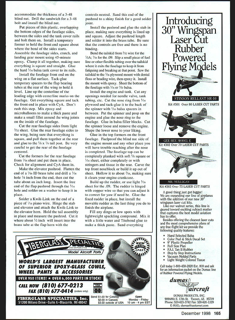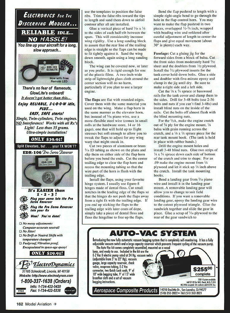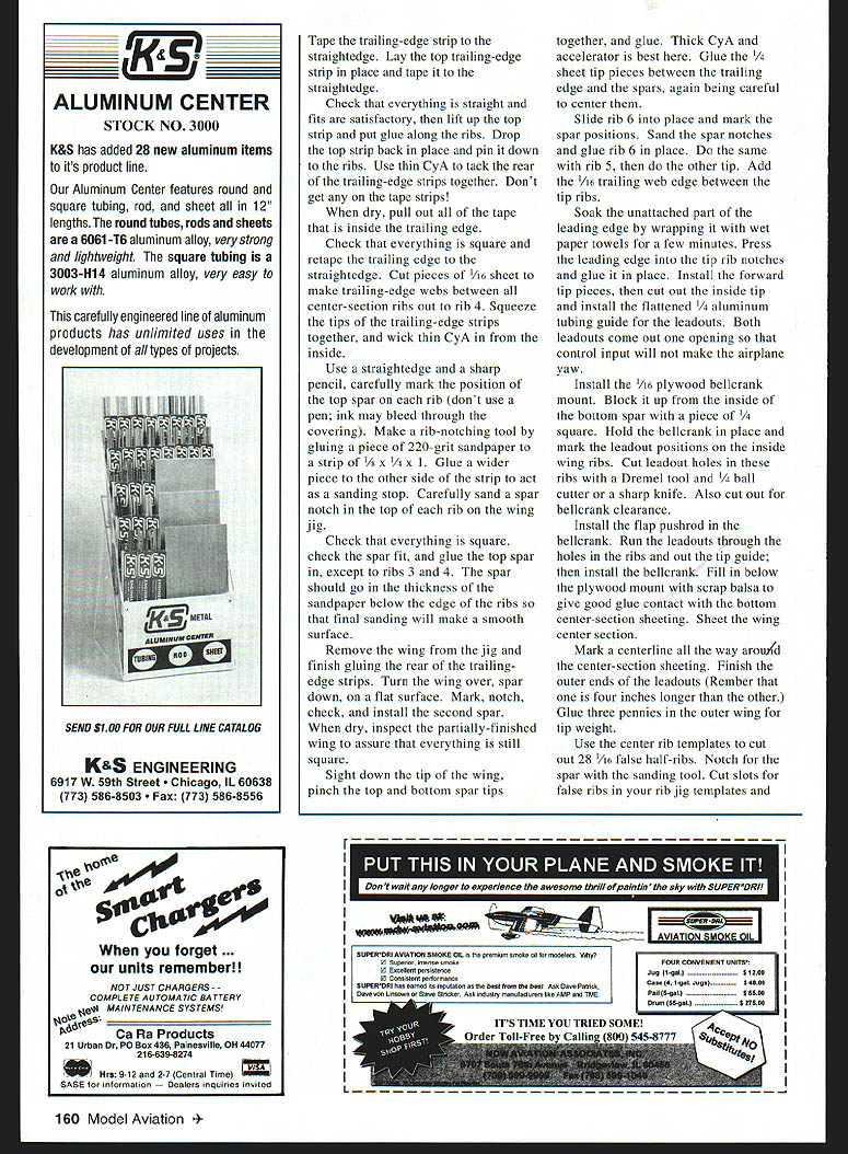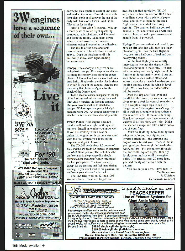 Sheet balsa tail surfaces optional possible penalty nose weight Tee Dee 049-powered model 156 Model Aviation m Thomerson Tee Dee 049-powered version built-up tail did require nose weight proper balance Ive enjoyed designing building small Control Line Stunt airplanes since days Atwood Wasp 049 Designs have gradually grown 24 36 inches wingspan six seven ounces up 11-13 ounces weight time time model has powered 074 09 Today number highquality small engines diesel glow 049 10 size range encouraged try favorite Cheap Thrill plans show front-end modifications Tee Dee 09 fly Stunt competitively PAMPA Precision Aerobatics Model Pilots Association Advanced level goal maintaining increasing competence can conduct flying sessions mishap fly airplanes well enough present enjoy Cheap Thrill flies pattern very well surprisingly solid feel 1/2As have handled wind better some larger Stunt airplanes fly everything else stays van 1/As slightly bigger siblings great fun build fly CONSTRUCTION Stabilizer Elevator built-up construction recommended /2A have used very light /16 sheet good results control horn shown small Veco Sand stab elevator shape Using thin cyanoacrylate CyA glue cover center stab two-inch-wide piece lightweight glass cloth necessary built-up stab Put couple coats clear dope sand stab elevator smooth can 400-grit sandpaper Cover tissue Continue clear dope sanding between coats 600-grit paper knock off fuzzies until uniformly shiny set aside until later Wing If dont want build wooden four-inch bellcrank shown plans Sig Brodak can supply fairly light four-inch bellcranks prefer use commercially available /2A flexible leadouts 018 stranded control line will work fine Slip oneinch length large-size CyA glue applicator tubing over bellcrank end leadout Center tubing bellcrank end hole slide leadout wire through until about two inches stick out Wrap Graphic Design Jill Ann Cavanaugh December1998 157 Homemade four-inch belicrank leadouts attached Commercial units Brodak Sig Manufacturing can substituted Templates bolts tools required make center-section wing ribs see text Spacer fixtures accurately position wing center-section ribs Note rubber bands around leading edge front wing jig rod angled fixtures leadout fine wire shown AMA Competition Regulations clip off excess Fine beading wire available craft stores good wrapping leadouts control line ends wrap finished rub Sig Ment help hold wire smooth surface prevent possible hangups Leave outer ends unfinished now Note leadout will about four inches longer other finished ensure line connectors dont snag Make templates center section ribs plywood aluminum stack 14 pieces light quarter-grain A6 balsa between will assemble wing Great Planes wing jig shown photos holes jig rods need accurate size position Sharpen end piece 1/4 brass tubing trimming down sharp edge inside Make half-dozen little cuts sharp edge make work like miniature hole saw Cut holes rib blanks using rib templates bolt stack between templates /4-inch bolts Carve sand ribs shape cut spar notches ribs drawn slightly oversize juncture trailing edge sheet can sand down neatly after assembly Trim four ribs down /32 top bottom center ribs will sheeted /32 balsa Mark #1 dont lose among other ribs Trim down four ribs make two ribs 3 4 Because elliptical shape wingtips beyond ribs will have assembled off jig Cut out rest ribs A6 sheet trailing edge strips sheet tip pieces 1/ sheet flaps two rib-position jigs Slide ribs wing jig rods proper sequence make sure jig sitting square flat tighten down Position ribs roughly block tape pin center ribs position vertical perpendicular rods Stick couple pins leading edge between last two center-section rib positions either side put leading edge place wrap small rubber band around pin front jig rod hold Check center rib still true glue leading edge Use two wing-rib jigs position next rib Set jigs 450 assure rib square directions Glue rib leading edge center section ribs Put lower trailing edge strip place pinning two ribs either end center section Recheck center rib glue center-section ribs trailing edge Use jigs line up ribs 3 4 glue trailing edge leading edge Block straightedge parallel rear edge lower trailing-edge strip Type CL 1/2A Stunt Wingspan 36 inches Engine 049-09 Flying weight 13 ounces Construction Built-up Covering/finish Tissue dope 158 Model Aviation ling edge taped metal yardstick Top TE sheeting ready glued Front end fuselage has glued wingtake care during alignment U BALSA132 SHT BALSA17 LEUDSC ESCETOP SBOTTOM SURFACES17 EDO II F 0 REQ LJLJLJLJLJLi RIBS D9 I/IA SHT BALSA 3/SUBALSA RB ALIUNMENT JIS SEE TEAT PRUTU / 1/4 SUT BALSA BALSA RIBS I/IAS /4 I/4A 1/4 BALSA EADING EGG SPARS I/H SRI BALSAI E -4-HF00 -SR -HF II LLEU OPTIONAL FLL NE RIB GESL AIM L\ I4111 AL1kII II[III/ ~I S \ II FLAP HORN ASSEMBLYII 1-' 77 1 SEE TEAT AP HINGES FIGURE EIART STITCHINA WITH DENTAL FLOSS TSP TANK COVER COOLING AIR EGIT CUTOUT -T NOSE FORMING BLOCK______ IA 11/2 A_BALSA-' LINE FSAW THRA AS SHOWN SEE TEAT ---"] - FUEL7~C UECO EEUATOR CONTROL HORN 3 I/A SHT BALSA CA L.-TANK HOLD PRSPELLSR FUEL TANK-_ ROOK ~S4RA MASTER AIRACREW I/4SRT BALSAI ENGINE TRAILING EDGEUCOG 049 ATEE SEE / ELEAATSR HINGES FIGURE EIGHT STITCHING WITH GENTAL FLOSS TYPICAL I/B 1/4~15AI I5/ SPRUCEAj----OUT LINE OP ALTERNATE CRUTCH FOR 59 ENGINE IIII BRACE 0 I/IA G ART BALSA TOP BOTTOM SURF 41 II /8 SHT BALSA FLAPS F -- ~77fl IiiJBELLCRANK MOUNT Ir/IK BALSA U TIBOTTOM SJRFACES-hEEF /4UHT BALSA SI E S 0 I/R BALSA TICAL BRACE 5 1/IBBALSA II WEBS TYPI TSP III 0 7 3 P WOOD OOo OW INITIAL RUDDER OFFSET -Sh-zr- ~ziV" II--JL-- _U- ______U IBA H 9Y AP WOO 4SH RASA IA 43P EDO Aji XPt4V"x\\ FRAME OS NED K PL WOOD K SR BA F N B BUGGER UE AREMO AR K AEAR POWER P ANGD 5 CANOP F 'C05 EEDEE 09W H 9KG 4 SHOR KNEE NOSEQBBI}BBS I-~~"'A SB Iml HINGE TSP I_II PUSH RODIA OG-BRO KWIK LINK 3/3D ART BALSA FASELAGE SIDESI/3D DIA MAGIC WIRE 1/1K SRI BALSA FUSELAGE BOTTO I/IA SIB MUSIC WIREK7BN10I/IA PLYWOOD MOUNT