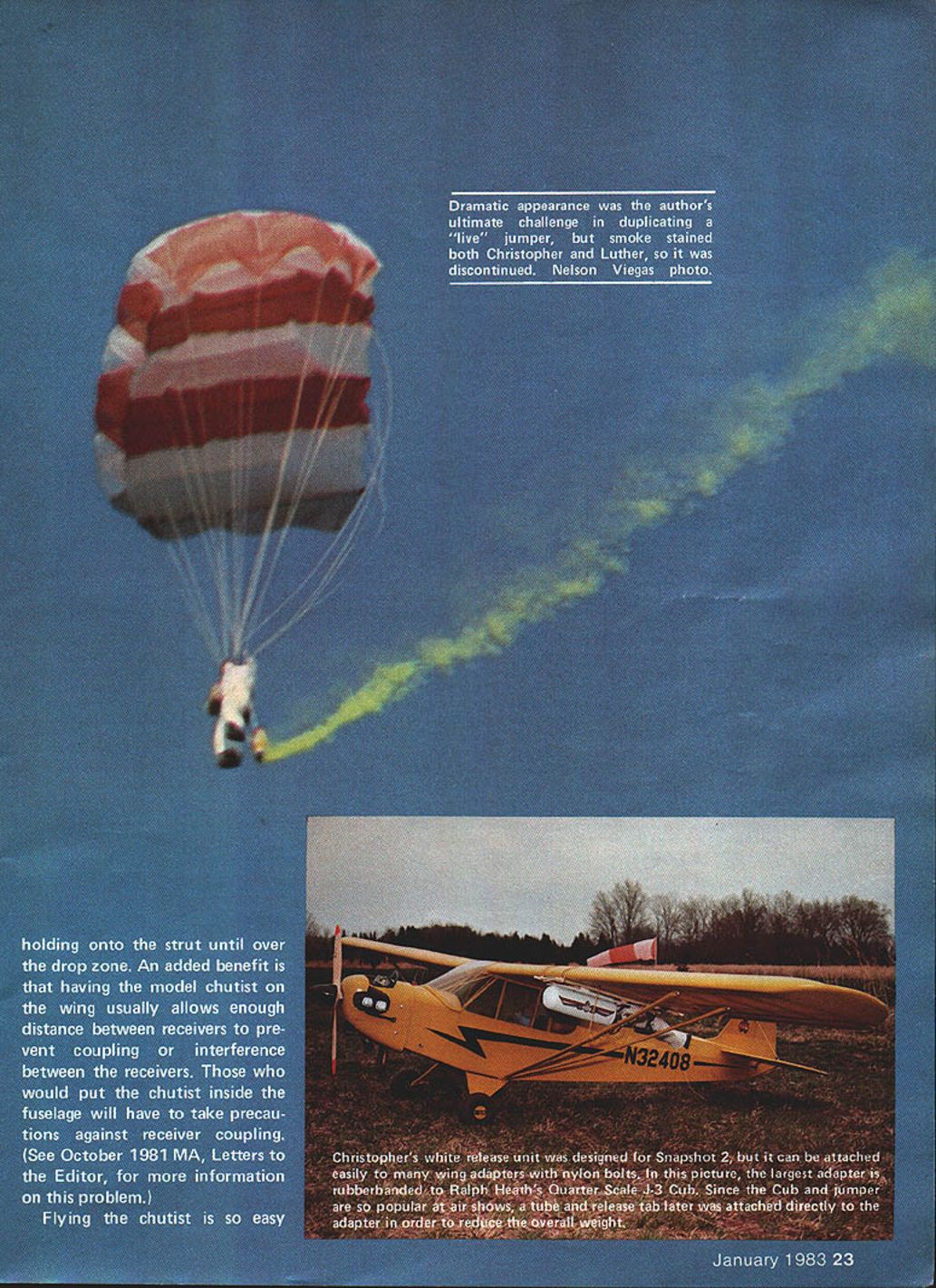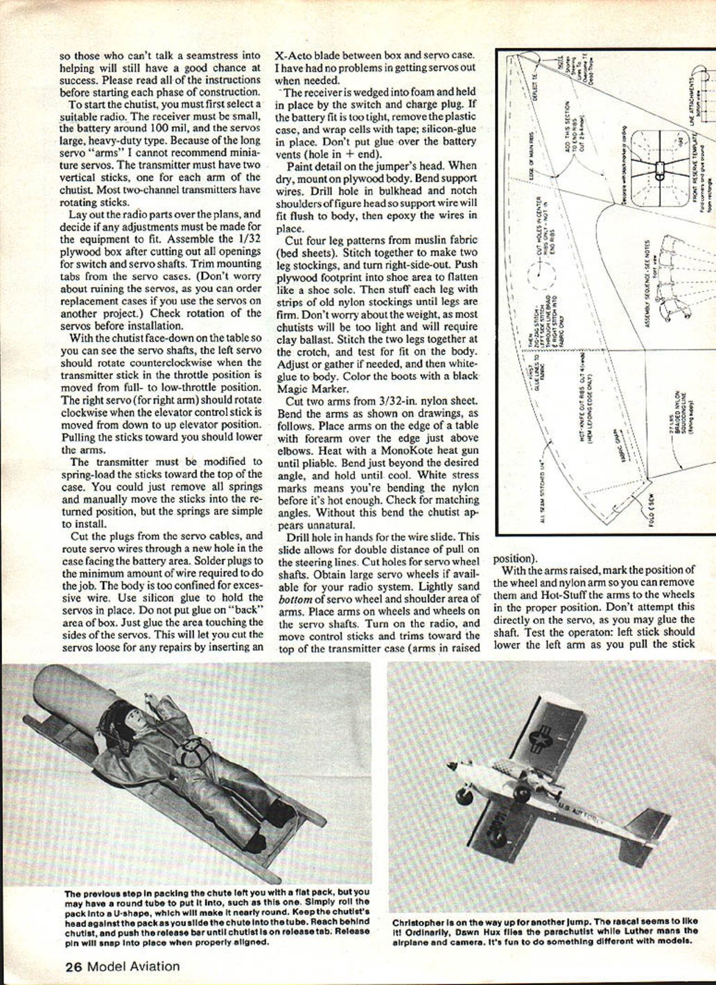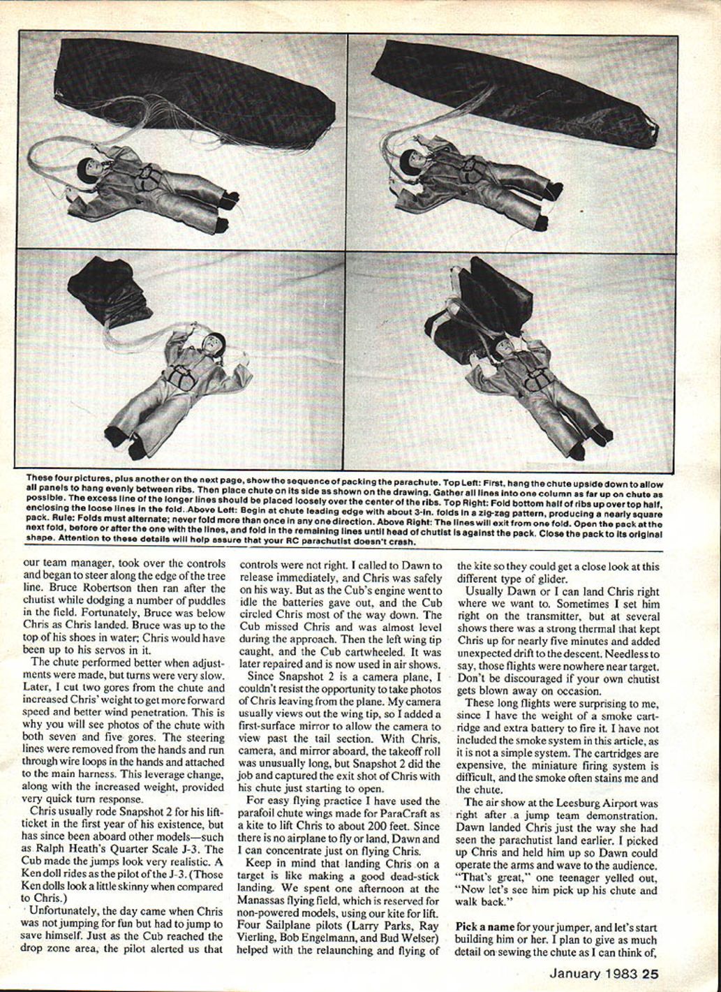 NO OCR TEXT NO OCR TEXT nese pictures snowiwo uinereni cnuie pous usco authors Snapshot 2 planeand two locations forthe chutist case pod should sanded smooth prevent fabric snags chutist 72 MHz model 53 MHz close proximity receivers has caused interferencewhile some same-band combinations have troublesome regard photo right authors wife Dawn can seen mirror fuselage allows camera look rearward pilot has quick shutter close-ups releases can hand transmitter kids may have climb ing trees cant actually crash asked wanted name little guy Immediately replied Christo pher Boy fast Christo pher asked watching TV interview Christopher Reeve played role Superman flies too Chris could talk could just imagine comments first jump rained day before hung wing pod face right over large balloon tires Im sure hoping run through puddles takeoff Snapshot 2 cleared puddles took Chris altitude just minute Guessing best could wind speed direction called Dawn release chute few seconds Chris riding overhead toward trees behind us wind strong Chris could pene trate steering lines much too short trailing edge chute too far down would flairing land would simple matter correct next flight could get Chris down within reach Chuck Thomas Left Luthertests new red-and-white patriotic chute inflating lightwind Photo JudyOckert Inventorof parafoil design Domina Jalbert built first fabric wings ss kitelater adapated parachute use Right Flying parachutist windy day often results long walk retrieval photo shows Dawn Hux about retrieve Chris taking step Best learning calm days team manager took over controls began steer along edge tree line Bruce Robertson ran after chutist dodging number puddles field Fortunately Bruce below Chris Chris landed Bruce up top shoes water Chris would have up servos chute performed better adjust ments made turns very slow Later cut two gores chute increased Chris weight get forward speed better wind penetration will see photos chute both seven five gores steering lines removed hands run through wire loops hands attached main harness leverage change along increased weight provided very quick turn response Chris usually rode Snapshot 2 liftticket first year existence has since aboard other modelssuch Ralph Heaths Quarter Scale J-3 Cub made jumps look very realistic Ken doll rides pilot J-3 Ken dolls look little skinny compared Chris Unfortunately day came Chris jumping fun jump save himself Just Cub reached drop zone area pilot alerted us controls right called Dawn release immediately Chris safely way Cubs engine went idle batteries gave out Cub circled Chris way down Cub missed Chris almost level during approach left wing tip caught Cub cartwheeled later repaired now used air shows Since Snapshot 2 camera plane couldnt resist opportunity take photos Chris leaving plane camera usually views out wingtip added first-surface mirror allow camera view past tail section Chris camera mirror aboard takeoff roll unusually long Snapshot 2 did job captured exit shot Chris chute just starting open easy flying practice have used parafoil chute wings made ParaCraft kite lift Chris about 200 feet Since no airplane fly land Dawn can concentrate just flying Chris Keep mind landing Chris target like making good dead-stick landing spent afternoon Manassas flying field reserved non-powered models using kite lift Four Sailplane pilots Larry Parks Ray Vierling Bob Engelmann Bud Welser helped relaunching flying kite could get close look different type glider Usually Dawn can land Chris right want Sometimes set him right transmitter several shows strong thermal kept Chris up nearly five minutes added unexpected drift descent Needless say flights nowhere near target Dont discouraged own chutist gets blown away occasion long flights surprising since have weight smoke cart ridge extra battery fire have included smoke system article simple system cartridges expensive miniature firing system difficult smoke often stains chute air show Leesburg Airport right after jump team demonstration Dawn landed Chris just way seen parachutist land earlier picked up Chris held him up Dawn could operate arms wave audience Thats great teenager yelled out Now lets see him pick up chute walk back Pick name jumper lets start building him plan give much detail sewing chute can think January 198325 four pictures plus another next page showthe sequence packing parachute Top Left First hang chute upside down allow panels hang evenly between ribs place chute its side ss shown drawing Gather lines column far up chute possible excess line longer lines should placed loosely over center ribs Top Right Fold bottom half ribs up overtop half enclosing loose lines fold Above Left Begin chute leading edge about 3-in folds zig-zag pattern producIng nearly square pack Rule Folds must alternate never fold once direction Above Right lines will exit fold Open pack next fold before after lines fold remainkng lines until head chutist against pack Close pack its original shape Attention details will help assure RC parachutist doesnt craeh cant talk seamstress helping will still have good chance success Please read instructions before starting phase construction start chutist must first select suitable radio receiver must small battery around 100 mil servos large heavy-duty type Because long servo arms cannot recommend minia ture servos transmitter must have two vertical sticks arm chutist Most two-channel transmitters have rotating sticks Lay out radio parts over plans decide adjustments must made equipment fit Assemble 1/32 plywood box after cutting out openings switch servo shafts Trim mounting tabs servo cases Dont worry about ruining servos can order replacement cases use servos another project Check rotation servos before installation chutist face-down table can see servo shafts left servo should rotate counterclockwise transmitter stick throttle position moved full- low-throttle position right servo right arm should rotate clockwise elevator control stick moved