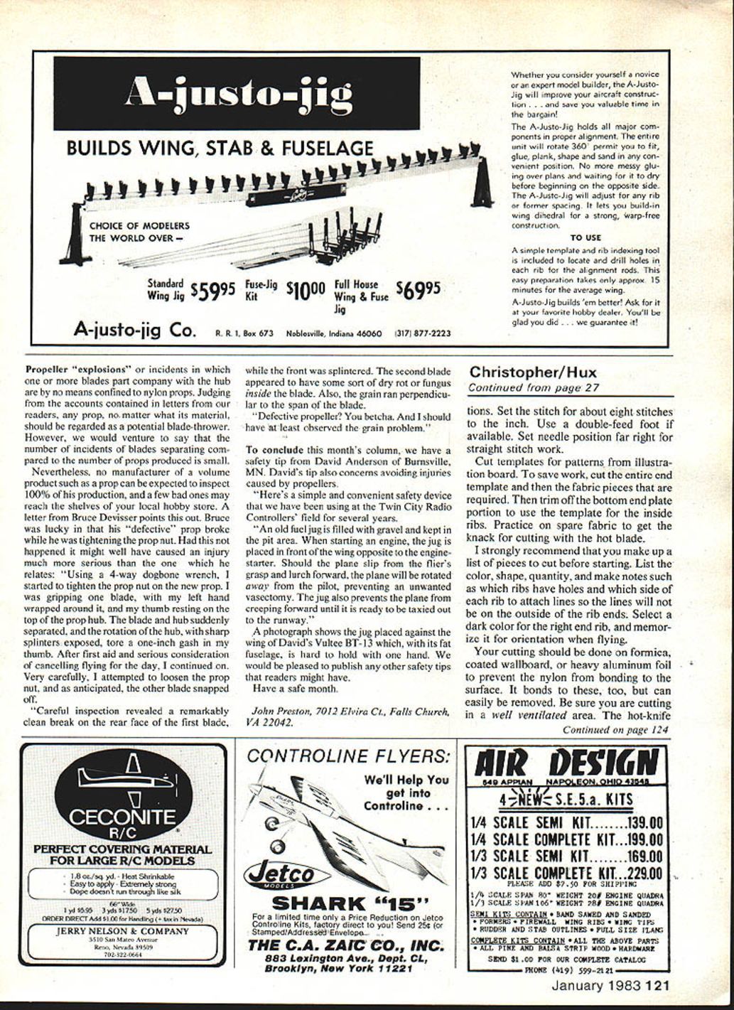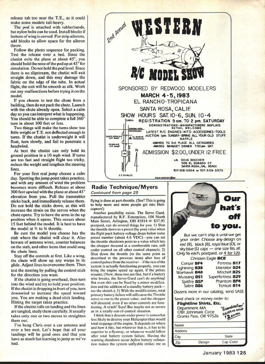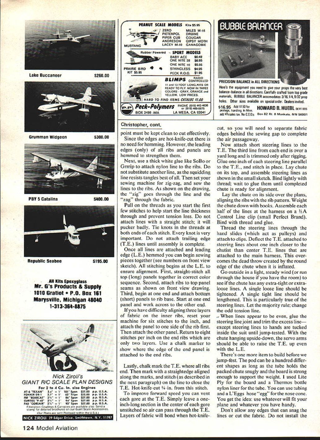 NO OCR TEXT NO OCR TEXT nese pictures snowiwo uinereni cnuie pous usco authors Snapshot 2 planeand two locations forthe chutist case pod should sanded smooth prevent fabric snags chutist 72 MHz model 53 MHz close proximity receivers has caused interferencewhile some same-band combinations have troublesome regard photo right authors wife Dawn can seen mirror fuselage allows camera look rearward pilot has quick shutter close-ups releases can hand transmitter kids may have climb ing trees cant actually crash asked wanted name little guy Immediately replied Christo pher Boy fast Christo pher asked watching TV interview Christopher Reeve played role Superman flies too Chris could talk could just imagine comments first jump rained day before hung wing pod face right over large balloon tires Im sure hoping run through puddles takeoff Snapshot 2 cleared puddles took Chris altitude just minute Guessing best could wind speed direction called Dawn release chute few seconds Chris riding overhead toward trees behind us wind strong Chris could pene trate steering lines much too short trailing edge chute too far down would flairing land would simple matter correct next flight could get Chris down within reach Chuck Thomas Left Luthertests new red-and-white patriotic chute inflating lightwind Photo JudyOckert Inventorof parafoil design Domina Jalbert built first fabric wings ss kitelater adapated parachute use Right Flying parachutist windy day often results long walk retrieval photo shows Dawn Hux about retrieve Chris taking step Best learning calm days team manager took over controls began steer along edge tree line Bruce Robertson ran after chutist dodging number puddles field Fortunately Bruce below Chris Chris landed Bruce up top shoes water Chris would have up servos chute performed better adjust ments made turns very slow Later cut two gores chute increased Chris weight get forward speed better wind penetration will see photos chute both seven five gores steering lines removed hands run through wire loops hands attached main harness leverage change along increased weight provided very quick turn response Chris usually rode Snapshot 2 liftticket first year existence has since aboard other modelssuch Ralph Heaths Quarter Scale J-3 Cub made jumps look very realistic Ken doll rides pilot J-3 Ken dolls look little skinny compared Chris Unfortunately day came Chris jumping fun jump save himself Just Cub reached drop zone area pilot alerted us controls right called Dawn release immediately Chris safely way Cubs engine went idle batteries gave out Cub circled Chris way down Cub missed Chris almost level during approach left wing tip caught Cub cartwheeled later repaired now used air shows Since Snapshot 2 camera plane couldnt resist opportunity take photos Chris leaving plane camera usually views out wingtip added first-surface mirror allow camera view past tail section Chris camera mirror aboard takeoff roll unusually long Snapshot 2 did job captured exit shot Chris chute just starting open easy flying practice have used parafoil chute wings made ParaCraft kite lift Chris about 200 feet Since no airplane fly land Dawn can concentrate just flying Chris Keep mind landing Chris target like making good dead-stick landing spent afternoon Manassas flying field reserved non-powered models using kite lift Four Sailplane pilots Larry Parks Ray Vierling Bob Engelmann Bud Welser helped relaunching flying kite could get close look different type glider Usually Dawn can land Chris right want Sometimes set him right transmitter several shows strong thermal kept Chris up nearly five minutes added unexpected drift descent Needless say flights nowhere near target Dont discouraged own chutist gets blown away occasion long flights surprising since have weight smoke cart ridge extra battery fire have included smoke system article simple system cartridges expensive miniature firing system difficult smoke often stains chute air show Leesburg Airport right after jump team demonstration Dawn landed Chris just way seen parachutist land earlier picked up Chris held him up Dawn could operate arms wave audience Thats great teenager yelled out Now lets see him pick up chute walk back Pick name jumper lets start building him plan give much detail sewing chute can think January 198325 four pictures plus another next page showthe sequence packing parachute Top Left First hang chute upside down allow panels hang evenly between ribs place chute its side ss shown drawing Gather lines column far up chute possible excess line longer lines should placed loosely over center ribs Top Right Fold bottom half ribs up overtop half enclosing loose lines fold Above Left Begin chute leading edge about 3-in folds zig-zag pattern producIng nearly square pack Rule Folds must alternate never fold once direction Above Right lines will exit fold Open pack next fold before after lines fold remainkng lines until head chutist against pack Close pack its original shape Attention details will help assure RC parachutist doesnt craeh cant talk seamstress helping will still have good chance success Please read instructions before starting phase construction start chutist must first select suitable radio receiver must small battery around 100 mil servos large heavy-duty type Because long servo arms cannot recommend minia ture servos transmitter must have two vertical sticks arm chutist Most two-channel transmitters have rotating sticks Lay out radio parts over plans decide adjustments must made equipment fit Assemble 1/32 plywood box after cutting out openings switch servo shafts Trim mounting tabs servo cases Dont worry about ruining servos can order replacement cases use servos another project Check rotation servos before installation chutist face-down table can see servo shafts left servo should rotate counterclockwise transmitter stick throttle position moved full- low-throttle position right servo right arm should rotate clockwise elevator control stick moved