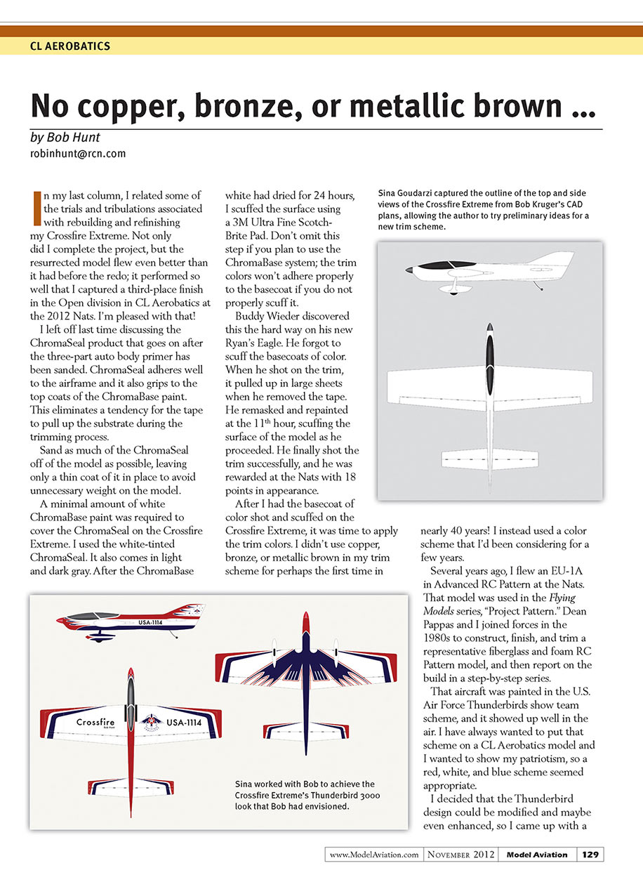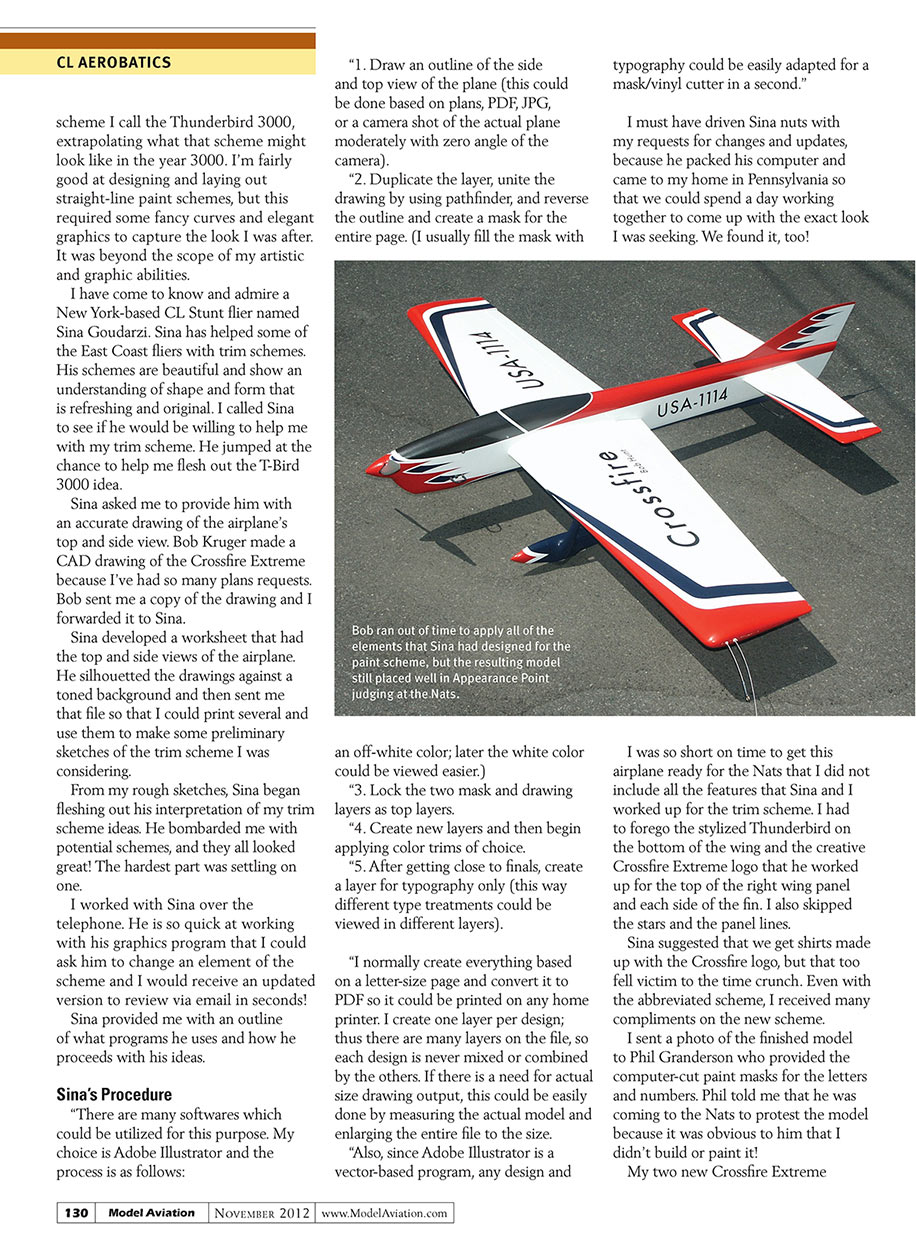 I have come to know and admire a New York-based CL Stunt flier named Sina Goudarzi. Sina has helped some of the East Coast fliers with trim schemes. His schemes are beautiful and show an understanding of shape and form that is refreshing and original. I called Sina to see if he would be willing to help me with my trim scheme. He jumped at the chance to help me flesh out the T-Bird 3000 idea.