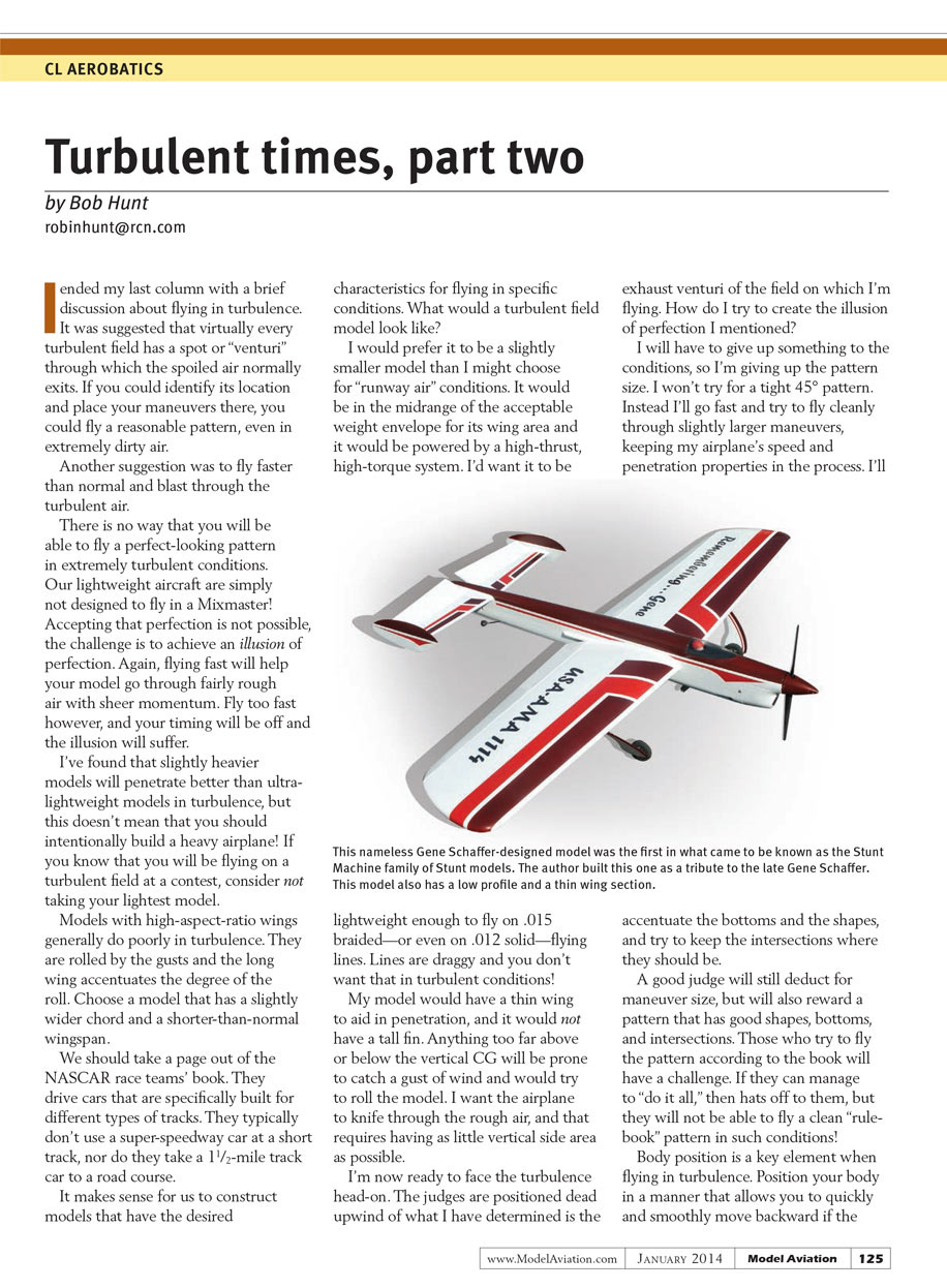 In my last column, I left off with a brief discussion about flying in turbulence. It was suggested that virtually every turbulent field has a spot or “venturi,” through which the spoiled air normally exits. If you could identify its location and place your maneuvers there, you could fly a reasonable pattern, even in extremely dirty air.