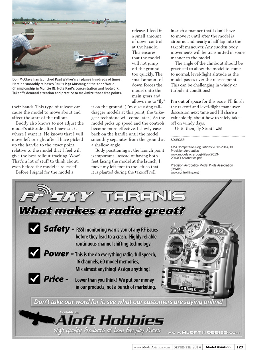 I’m out of space for this issue’s discussion. I’ll finish the takeoff and level flight maneuver discussion next time and I’ll share a valuable tip about how to safely take off on windy days.