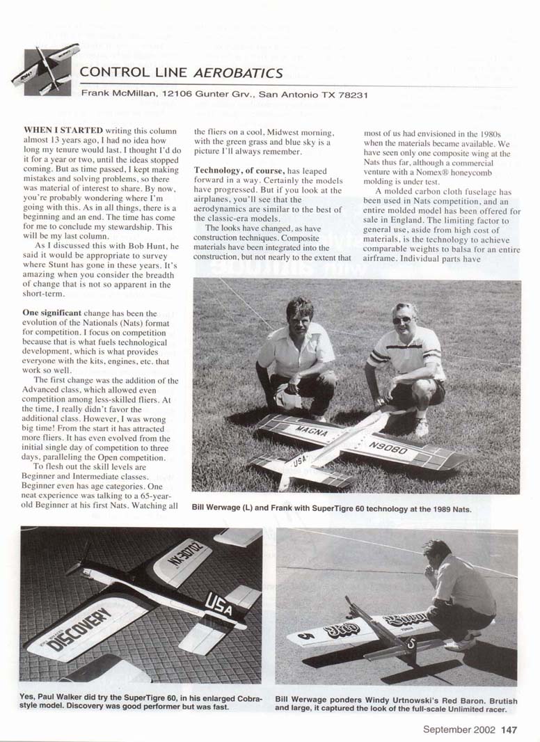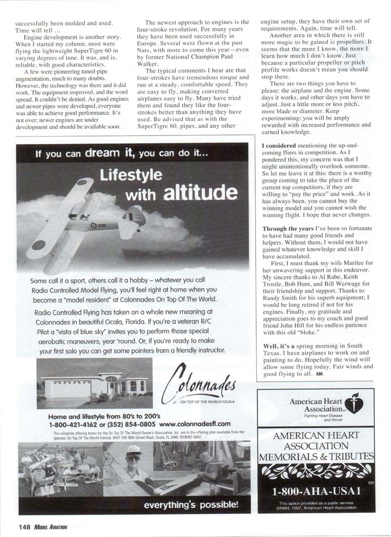 WHEN I STARTED writing this column almost 13 years ago, I had no idea how long my tenure would last. I thought I'd do it for a year or two, until the ideas stopped coming. But as time passed, I kept making mistakes and solving problems, so there was material of interest to share. By now, you're probably wondering where I'm going with this. As in all things, there is a beginning and an end. The time has come for me to conclude my stewardship. This will be my last column. As I discussed this with Bob Hunt, he said it would be appropriate to survey where Stunt has gone in these years. It's amazing when you consider the breadth of change that is not so apparent in the short-term. One significant change has been the evolution of the Nationals (Nats) format for competition. I focus on competition because that is what fuels technological development, which is what provides everyone with the kits, engines, etc. that work so well. The first change was the addition of the Advanced class, which allowed even competition among less-skilled fliers. At the time, I really didn't favor the additional class. However, I was wrong big time! From the start it has attracted more fliers. It has even evolved from the initial single day of competition to three days, paralleling the Open competition. To flesh out the skill levels are Beginner and Intermediate classes. Beginner even has age categories. One neat experience was talking to a 65-year-old Beginner at his first Nats. Watching all the fliers on a cool. Midwest morning, with the green grass and blue sky is a picture I'll always remember. Technology, of course, has leaped forward in a way. Certainly the models have progressed. But if you look at the airplanes, you'll see that the aerodynamics are similar to the best of the classic-era models. The looks have changed, as have construction techniques. Composite materials have been integrated into the construction, but not nearly to the extent that most of us had envisioned in the 1980s when the materials became available. We have seen only one composite wing at the Nats thus far, although a commercial venture with a Nomex® honeycomb molding is under test. A molded carbon cloth fuselage has been used in Nats competition, and an entire molded model has been offered for sale in England. The limiting factor to general use, aside from high cost of materials, is the technology to achieve comparable weights to balsa for an entire airframe. Individual parts have Bill Werwage (L) and Frank with SuperTigre 60 technology at the 1989 Nats. Yes, Paul Walker did try the SuperTigre 60, in his enlarged Cobra-style model. Discovery was good performer but was fast. Bill Werwage ponders Windy Urtnowski's Red Baron. Brutish and large, it captured the look of the full-scale Unlimited racer. successfully been molded and used. Time will tell ... Engine development is another story. When I started my column, most were flying the lightweight SuperTigre 60 in varying degrees of tune. It was, and is, reliable, with good characteristics. A few were pioneering tuned-pipe augmentation, much to many doubts. However, the technology was there and it did work. The equipment improved, and the word spread. It couldn't be denied. As good engines and newer pipes were developed, everyone was able to achieve good performance. It's not over; newer engines are under development and should be available soon. The newest approach to engines is the four-stroke revolution. For many years they have been used successfully in Europe. Several were flown at the past Nats, with more to come this year—even by former National Champion Paul Walker. The typical comments I hear are that four-strokes have tremendous torque and run at a steady, comfortable speed. They are easy to fly, making converted airplanes easy to fly. Many have tried them and found they like the four-strokes better than anything they have used. Be advised that as with the SuperTigre 60, pipes, and any other Some call it a sport, others call it a hobby - whatever you call Radio Controlled Model Flying, you'll feel right at home when you become a "model residenf at Colonnades On Top Of The World. Radio Controlled Flying has taken on a whole new meaning at Colonnades in beautiful Ocala, Florida. If you're a veteran R/C Pilot a "vista of blue sky" invites you to perform those special aerobatic maneuvers, year 'round. Or, if you're ready to make your first solo you can get some pointers from a friendly instructor. ON TOP OF THE WORLD/OCALA Home and lifestyle from 80's to 200's 1-800-421-4162 or (352) 854-0805 www.colonnadesfl.com The complete offering lenm kn the [>i Tup Of The World Owner's Association, Inc are in the offering plan available from the sponsor. On Top Of The World Cnntr.i:. 8447 SW 99th Street Road, Ocala. FL 3448. NY/H87-0002 engine setup, they have their own set of requirements. Again, time will tell. Another area in which there is still more magic to be gained is propellers. It seems that the more I know, the more I learn how much I don't know. Just because a particular propeller or pitch profile works doesn't mean you should stop there. There are two things you have to please: the airplane and the engine. Some days it works, and other days you have to adjust. Just a little more or less pitch, more blade or diameter. Keep experimenting; you will be amply rewarded with increased performance and earned knowledge. I considered mentioning the up-and-coming fliers in competition. As I pondered this, my concern was that I might unintentionally overlook someone. So let me leave it at this: there is a worthy group coming to take the place of the current top competitors, if they are willing to "pay the price" and work. As it has always been, you cannot buy the winning model and you cannot wish the winning flight. I hope that never changes. Through the years I've been so fortunate to have had many good friends and helpers. Without them, I would not have gained whatever knowledge and skill