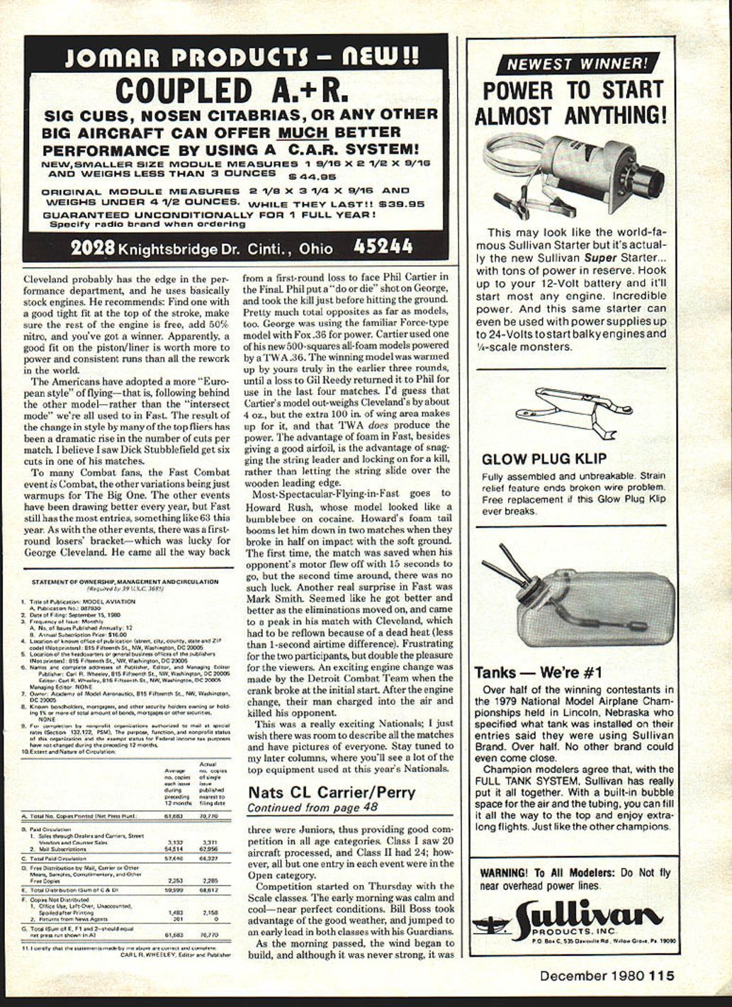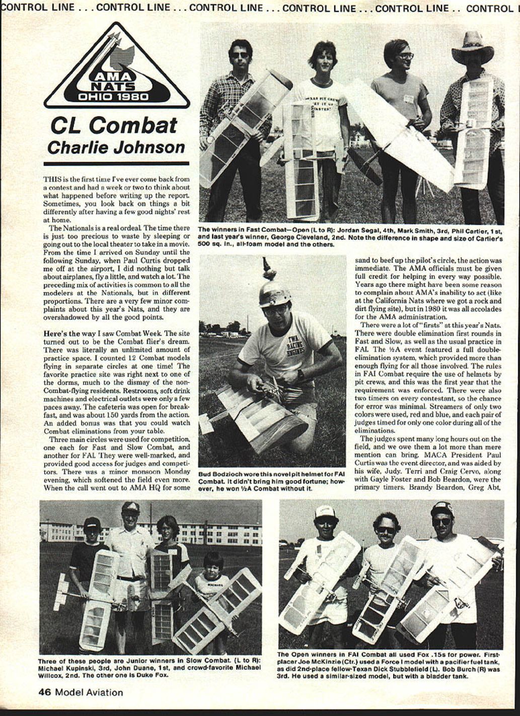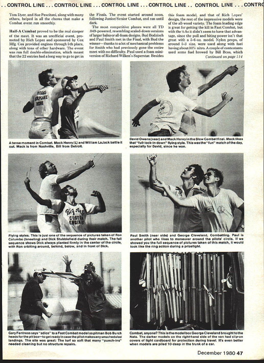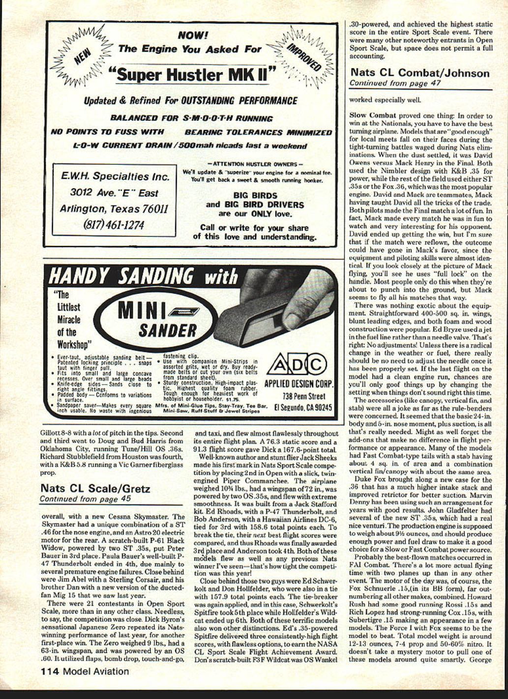 CONTROL LINE. CONTROL LINE .CONTROL LINE .CONTROL LINE. CONTROL LINE. CONTROL CL Combat Charlie Johnson THIS first time rye ever come back contest week two think about what happened before writing up report Sometimes look hack things bit differently after having few good nights rest home Nationals real ordeal time just too precious waste sleeping going out local theater take movie time arrived Sunday until following Sunday Paul Curtis dropped off airport did nothing talk about airplanes fly little watch lot preceding mix activities common modelers Nationals hut different proportions very few minor com plaints about years Nats overshadowed good points Heres way saw Combat Week site turned out Combat fliers dream literally unlimited amount practice space counted 12 Combat models flying separate circles time favorite practice site right next dorms much dismay non Combat-flying residents Restrooms soft drink machines electrical outlets few paces away cafeteria open break fast about 150 yards action An added bonus could watch Combat eliminations table Three main circles used competition Fast Slow Combat another FAL well-marked provided good access judges competi tors minor monsoon Monday evening softened field call went out AMA HQ some sand beef up pilots circle action immediate AMA officials must given full credit helping way possible Years ago might have some reason complain about AMAs inability act like California Nats got rock dirt flying site 1980 accolades AMA administration lot firsts years Nats double elimination first rounds Fast Slow well usual practice FM event featured full doubleelimination system provided enough flying involved rules FAI Combat require use helmets pit crews first year requirement enforced also two timers contestant chance error minimaL Streamers two colors used red blue pair judges timed color during eliminations judges spent long hours out field owe lot mere mention can bring MACA President Paul Curtis event director aided wife Judy Tern Craig Cervo along Gayle Foster Bob Beardon primary timers Brandy Beardon Greg Abt 46 Model Aviation winners FastCombatOpenLto R Jordan Segal4th MarKmItn srd PnhlLanier 1st last years winner George Cleveland 2nd Note difference shape size Cartiers 500 sq all-foam model others Bud Bodzioch wore novel pit helmet FAI Combat didnt bring him good fortune ever won 1/2A Combat Open winners inCombat all15s power Three people Junior winners Iow uomoaT IL TO 1JplacerJoeMcKinzieCtrusedaForcelmodelwithapacifierfueltank[v32][b24583038162725910]] Michael Kupinski 3rd John Duane 1st crowd-favorite Michaelas did 2nd-place fellow-Texan Dick Stubblefield L Bob Burch R Willcox 2nd other Duke Fox3rd used similar-sized model bladder tank CONTROL LINE . CONTROL LINE. CONTROL LINE . CONTROL LINE. CONTROL LINE. CONTRC loin Dyer Sue Pescitani along others helped chores make Combat event run smoothly Half-A Combat proved real sleeper meet unofficial event pro moted Rich Lopez sponsored Cox Mfg Cox provided engines through 5th place along tons other hardware event run full double-elimination meant 22 entries along way go get Finals event started around noon following Junior/Senior Combat ran until dark competitive planes TD 049-powered resembling scaled-down versions larger balsa all-foam designs Bud Bodzioch Paul Smith met Final Bud winnerthanks lot mechanical problems Smith previously gone entire meet no difficulty Paul used foam miniversion Richard Wilkens Superstar Besides foam model Rich Lopez design rest impressive models all-wood variety foam leading edge great getting kill Fast Combat hAs didnt seem have advan tage since pull biting power isnt great 5-6-oz modeL Nylon props around 5-3 size used along fuel having about 30% nitro couple contestants used some fuel brewed Bill Boss Continued pate 114 December 1980 47 tense moment Combat Mack Henry L William LaJack battle out Mack Nashville Bill Detroit David Owensnear Mack Henry Slow Combatfinal Mack thatfull-lock-in-down flying style fun match day especially David since won Flying styles just 0 sequence pictures taken lion Columbo kneeling Dick Stubblefield during match full sequence shows Dick always planted firmly center circle Ron orbiting around behind below front Dick Paul Smith near side George Cleveland Combatting Paul another pilot likes maneuver around pilots circle showed full sequence pictures taken match would look like ring action during prizefight Gary Fentress says adios Fast Co, mu ,uuue ee pisman uo urcn heads forthe pit boxto get ready case pilot makes unscheduled landings site great turf soft punch-ins needed cleaning no structure repairs Combat anyone m nw mouei oux usorge ,ieveiana orougnitoine Nats darker models right-hand side van slip-on covers light cardboard protection during travel Its better models piled 10-deep trunk car NOW~i4\~v14 ne Asked Q 2 Super Hustler MK II 7 Updated & Refined OUTSTANDING PERFORMANCE BALANCED FOR S-M-OOTN RUNNWC NO POINTS TO FUSS WITHBEARING TOLERANCES MINIMIZED L-O-W CURRENT DRAIN /500mah nicads last weekend ATTENTION HUSTLER OWNERS Wefl update & seaperize-- engine nominal tee Youll get back sweet & smooth running honker BIG BIRDS BIG BIRD DRIVERS ONLY love Call write share love understanding Ins Littlest Miracle Workshop Ever-taut adjustable sanding belt ening Clip Patented lacking principle ps cumpunian Mini-Strips taut finger pull assurted gritn wet dry Buy readyFits small large concave made belts er cut year awn sin belts recesses Over small large beads tram standard sheet Knife-edge sides s close dy cunstructian High-impact planright angle fittings tic Highest quality tuam rubber Padded bndy arms tn variatians Tough enaugh far heaviest work surface habbyist ur hausehulder $175 Sandpaper saverMakes square Mtrs ot Mini-Glue Tips Stay-Tray Tee Bar Lnch usable Na waste ingeniousMini-Saw Ruff-Stuft & Jewel Snripes Gillott 8-8 lot pitch tips Second third went Doug Bud Harris Oklahoma City running Tune/Hill OS 36s Richard Stubblefield Houston fourt