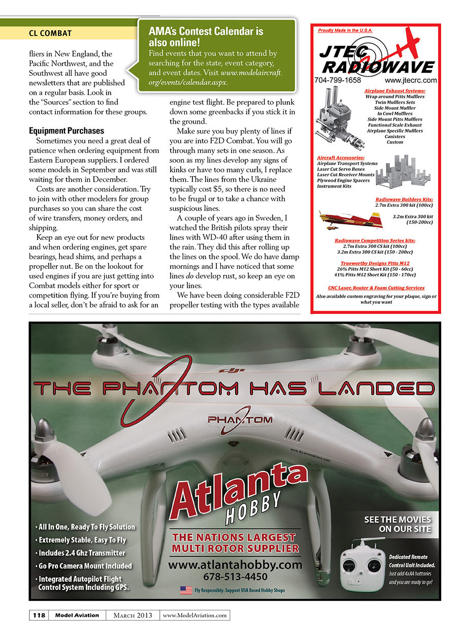 Keep an eye out for new products and when ordering engines, get spare bearings, head shims, and perhaps a propeller nut. Be on the lookout for used engines if you are just getting into Combat models either for sport or competition flying. If you’re buying from a local seller, don’t be afraid to ask for an engine test flight. Be prepared to plunk down some greenbacks if you stick it in the ground.