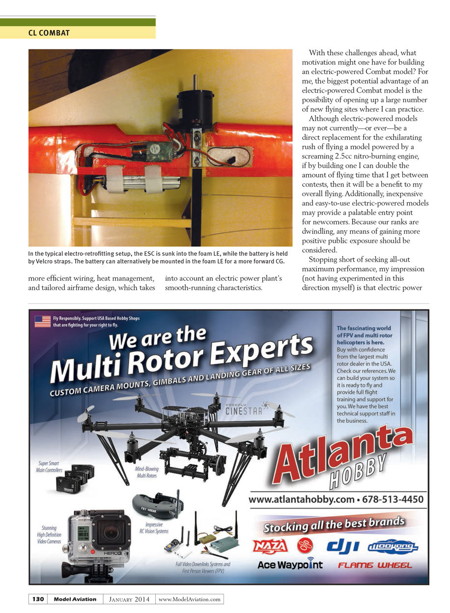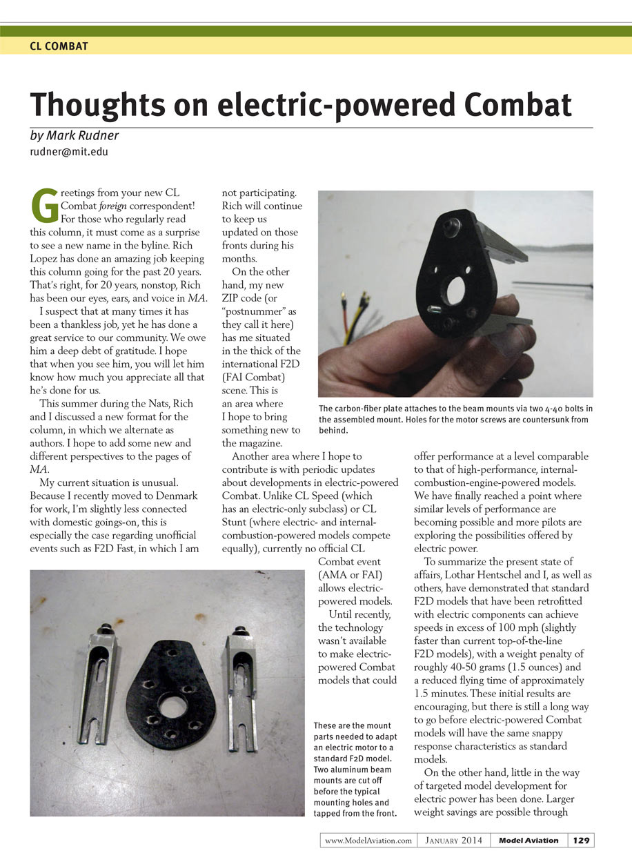 Another area where I hope to contribute is with periodic updates about developments in Electric Combat. Unlike CL Speed (which has an electric-only subclass) or CL Stunt (where electric- and internal-combustion-powered models compete equally), currently no official CL Combat event (AMA or FAI) allows electric-powered models.