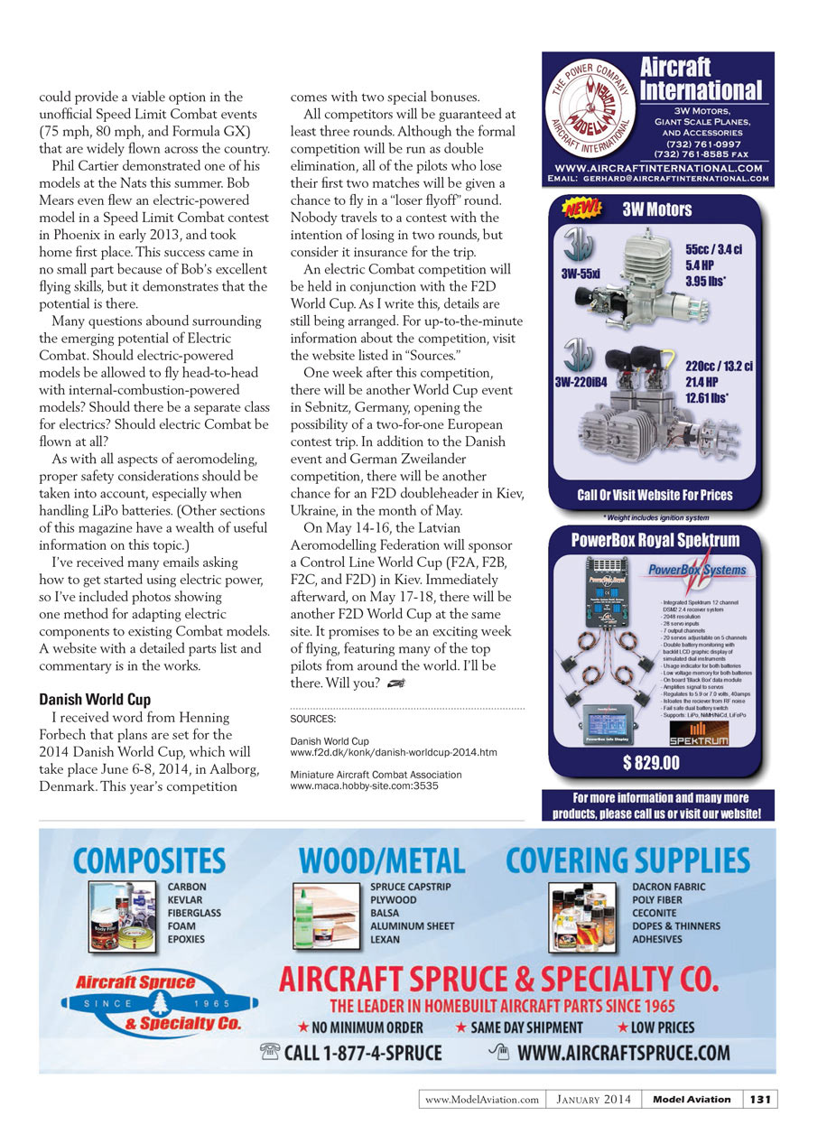 An Electric Combat competition will also be held in conjunction with the F2D World Cup. As I write this, details are still being arranged. For up-to-the-minute information about the competition, visit the website listed in “Sources.”