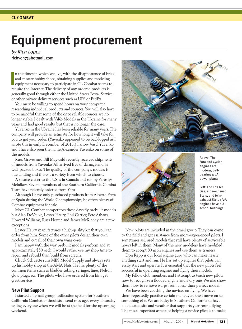 In the times in which we live, with the disappearance of brick-and-mortar hobby shops, obtaining supplies and modeling equipment necessary to participate in CL Combat seems to require the Internet. The delivery of any ordered products is generally good through either the United States Postal Service or other private delivery services such as UPS or FedEx.