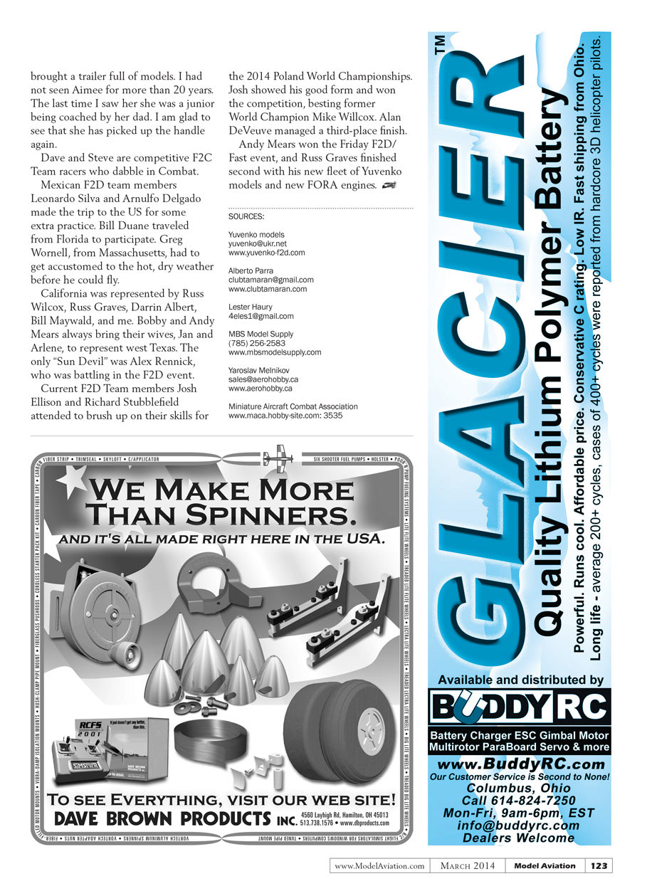 Chuck Schuette runs MBS Model Supply and always sets up his hobby shop at the AMA Nats. He has plenty of the common items such as bladder tubing, syringes, lines, Nelson glow plugs, etc. The pilots who have ordered from him get great service.