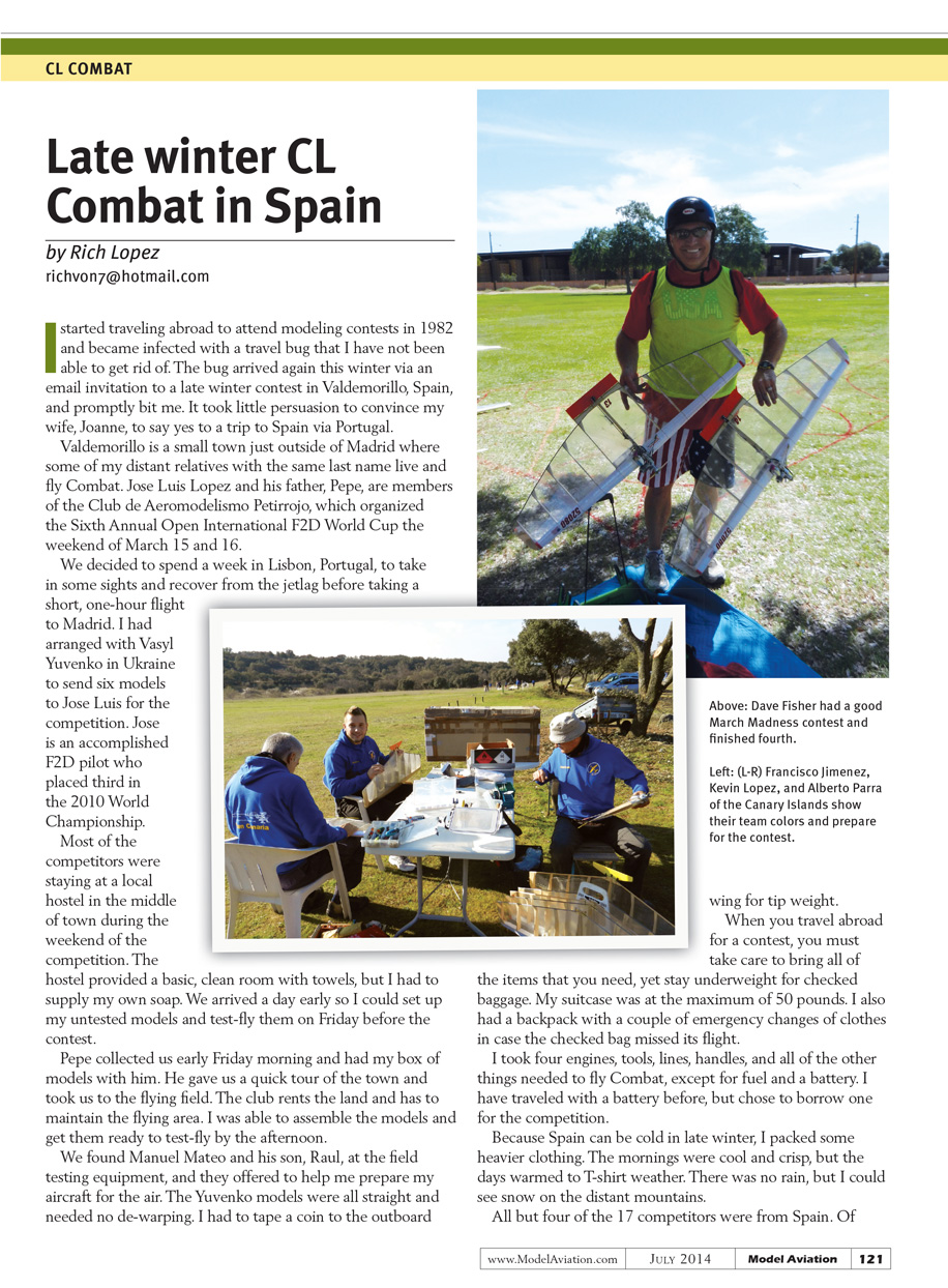 Valdemorillo is a small town just outside of Madrid where some of my distant relatives with the same last name live and fly Combat. Jose Luis Lopez and his father, Pepe, are members of the Club de Aeromodelismo Petirrojo, which organized the Sixth Annual Open International F2D World Cup the weekend of March 15 and 16.