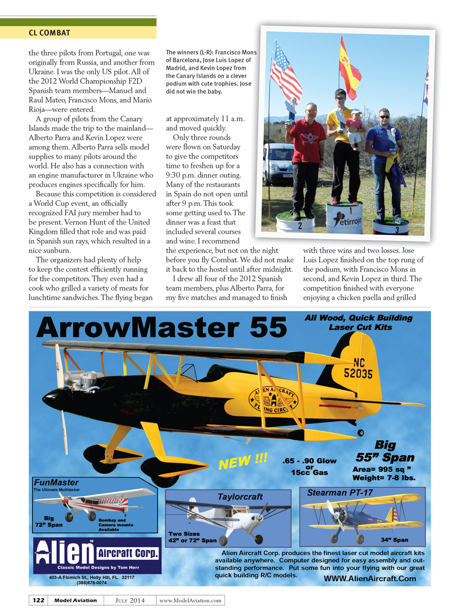 All but four of the 17 competitors were from Spain. Of the three pilots from Portugal, one was originally from Russia, and another from Ukraine. I was the only US pilot. All of the 2012 World Championship F2D Spanish team—Manuel and Raul Mateo, Francisco Mons, and Mario Rioja—were entered.