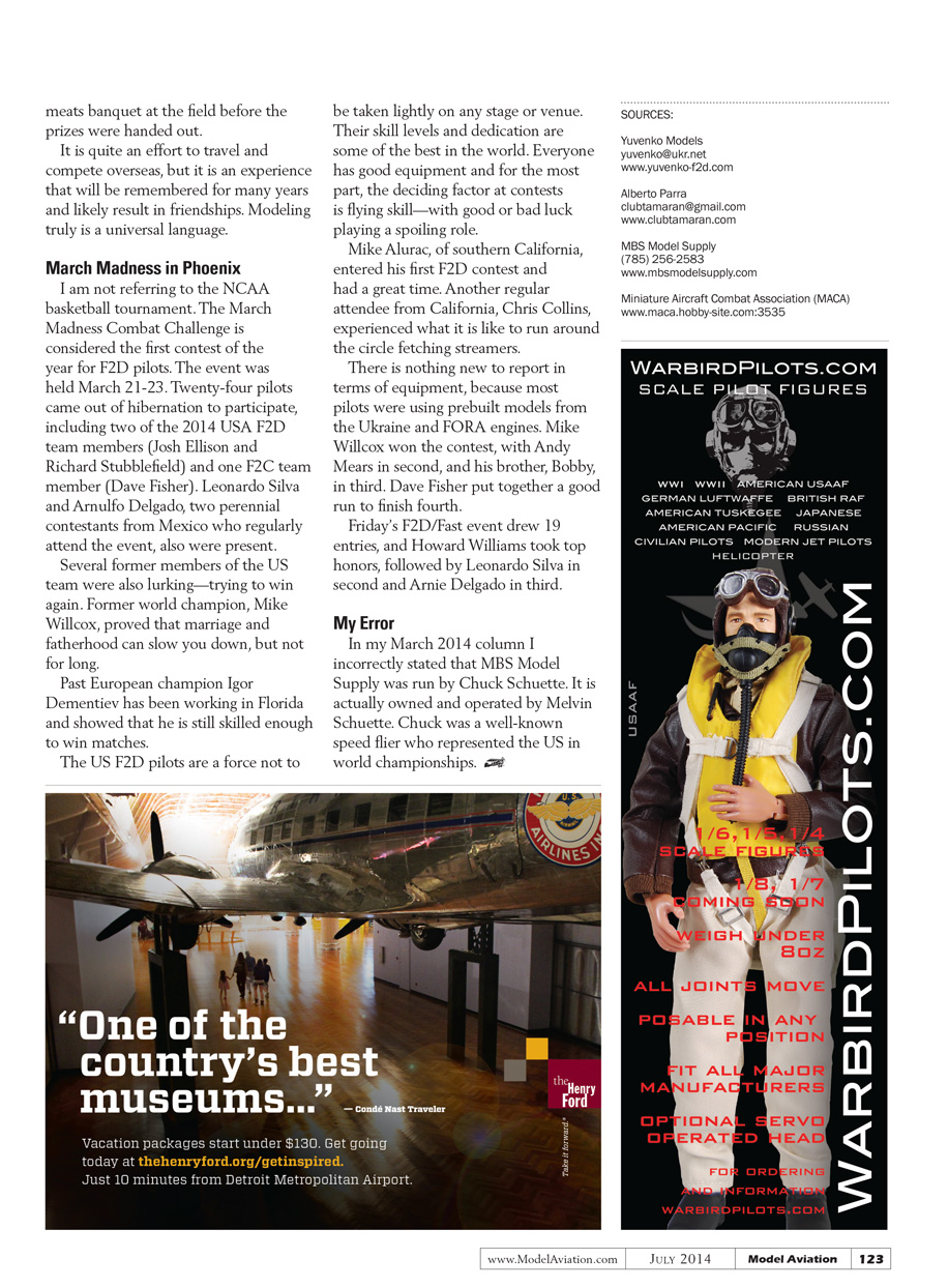 In my March column I incorrectly stated that MBS model supply was run by Chuck Schuette. It is actually owned and run by Melvin Schuette. Chuck was a well-known speed flier who represented the US in world championships.