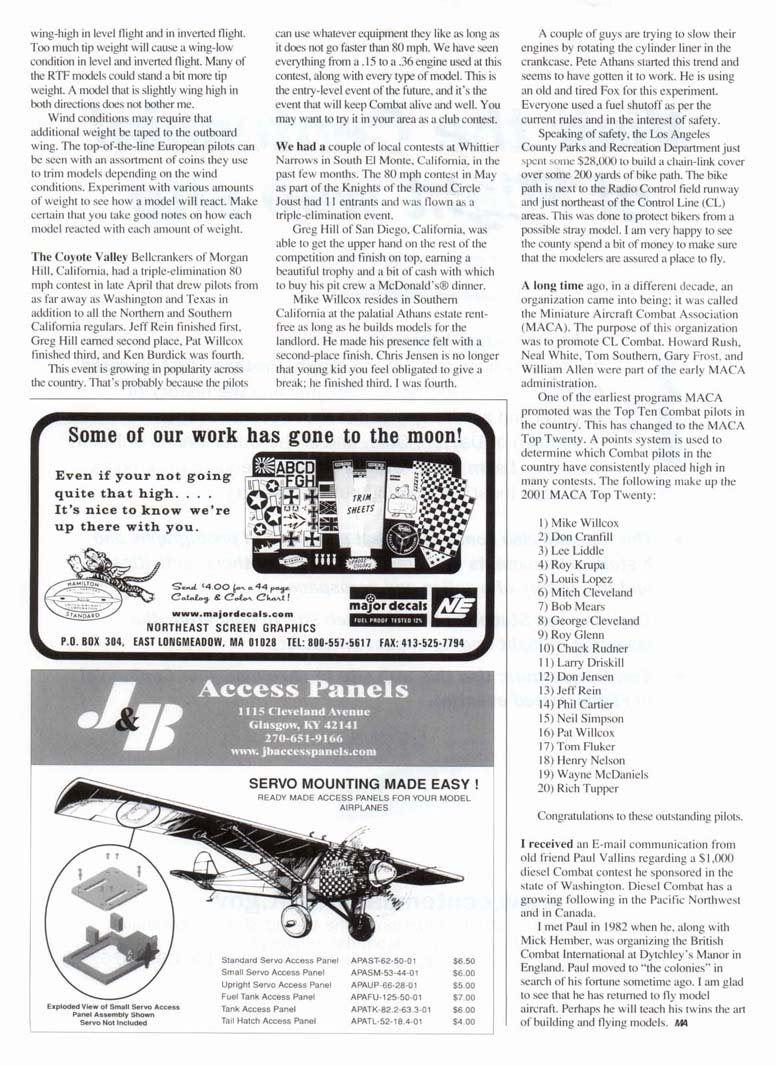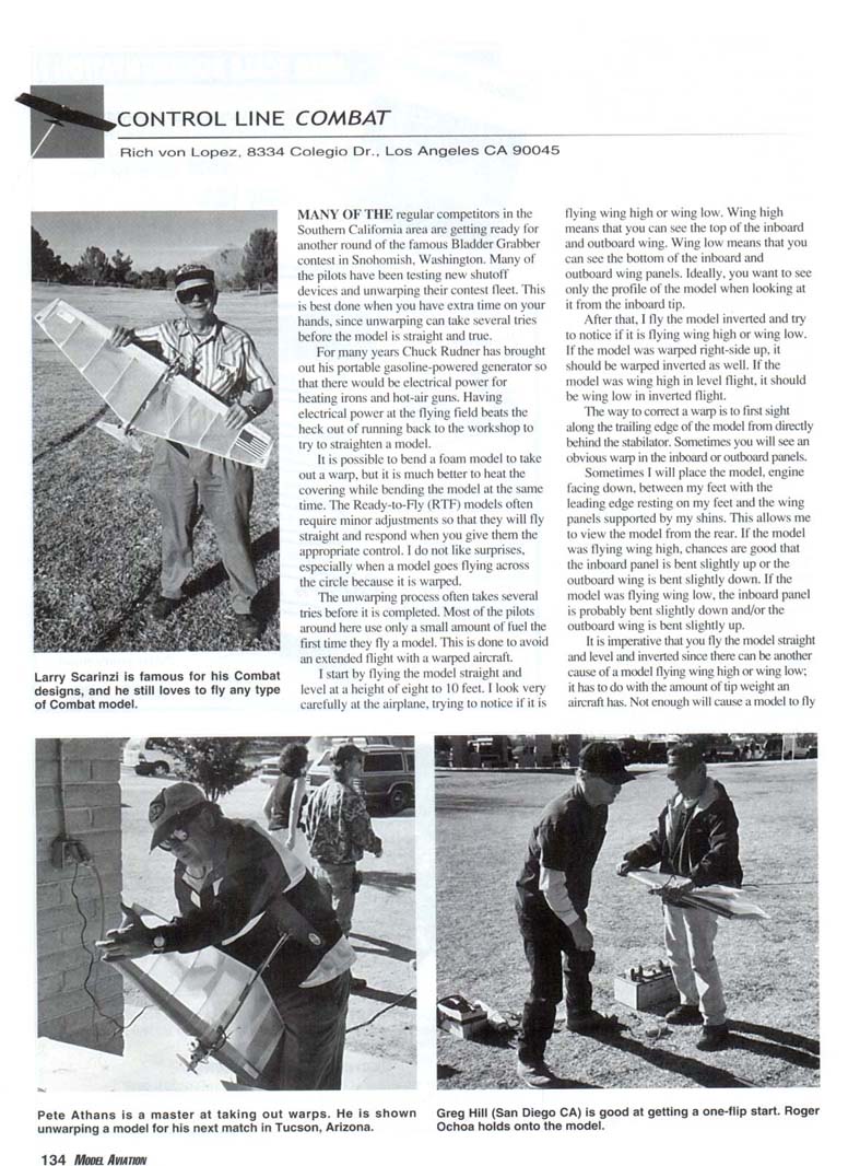 MANY OF THE regular competitors in the Southern California area are getting ready for another round of the famous Bladder Grabber contest in Snohomish. Washington. Many of the pilots have been testing new shutoff devices and unwarping their contest fleet. This is best done when you have extra time on your hands, since unwarping can take several tries before the model is straight and true. For many years Chuck Rudner has brought out his portable gasoline-powered generator so that there would be electrical power for heating irons and hot-air guns. Having electrical power at the flying field beats the heck out of running back to the workshop to try to straighten a model. It is possible to bend a foam model to take out a warp, but it is much better to heat the covering while bending the model at the same time. The Ready-to-Fly (RTF) models often require minor adjustments so that they will fly straight and respond when you give them the appropriate control. I do not like surprises, especially when a model goes flying across the circle because it is warped. The unwarping process often takes several tries before it is completed. Most of the pilots around here use only a small amount of fuel the first time they fly a model. This is done to avoid an extended flight with a warped aircraft. I start by flying the model straight and level at a height of eight to 10 feet. I look very carefully at the airplane, trying to notice if it is flying wing high or wing low. Wing high means that you can see the top of the inboard and outboard wing. Wing low means that you can see the bottom of the inboard and outboard wing panels. Ideally, you want to see only the profile of the model when looking at it from the inboard tip. After that, I fly the model inverted and try to notice if it is flying wing high or wing low. If the model was warped right-side up, it should be warped inverted as well. If the model was wing high in level flight, it should be wing low in inverted flight. The way to correct a warp is to first sight along the trailing edge of the model from directly behind the stabilator. Sometimes you will see an obvious warp in the inboard or outboard panels. Sometimes I will place the model, engine facing down, between my feet with the leading edge resting on my feet and the wing panels supported by my shins. This allows me to view the model from the rear. If the model was flying wing high, chances are good that the inboard panel is bent slightly up or the outboard wing is bent slightly down. If the model was flying wing low, the inboard panel is probably bent slightly down and/or the outboard wing is bent slightly up. It is imperative that you fly the model straight and level and inverted since there can be another cause of a model flying wing high or wing low; it has to do with the amount of tip weight an aircraft has. Not enough will cause a model to fly wing-high in level flight and in inverted flight. Too much tip weight will cause a wing-low condition in level and inverted flight. Many of the RTF models could stand a bit more tip weight. A model that is slightly wing high in both directions does not bother me. Wind conditions may require that additional weight be taped to the outboard wing. The top-of-the-line European pilots can be seen with an assortment of coins they use to trim models depending on the wind conditions. Experiment with various amounts of weight to see how a model will react. Make certain that you take good notes on how each model reacted with each amount of weight. The Coyote Valley Bellcrankcrs of Morgan Hill, California, had a triple-elimination 80 mph contest in late April that drew pilots from as far away as Washington and Texas in addition to all the Northern and Southern California regulars. Jeff Rein finished first. Greg Hill earned second place. Pat Willcox finished third, and Ken Burdick was fourth. This event is growing in popularity across the country. That's probably because the pilots can use whatever equipment they like as long as it does not go taster than 80 mph. We have seen everything from a. 15 to a .36 engine used at this contest, along with every type of model. This is the entry-level event of the future, and it's the event that will keep Combat alive and well. You may want to try it in your area as a club contest. We had a couple of local contests at Whittier Narrows in South EI Monte. California, in the past few months. The 80 mph contest in May as part of the Knights of the Round Circle Joust had 11 entrants and was flown as a triple-elimination event. Greg Hill of San Diego. California, was able to get the upper hand on the rest of the competition and finish on top. earning a beautiful trophy and a bit of cash with which to buy his pit crew a McDonald's® dinner. Mike Willcox resides in Southern California at the palatial Athans estate rent-free as long as he builds models for the landlord. He made his presence felt with a second-place finish. Chris Jensen is no longer that young kid you feel obligated to give a break: he finished third. I was fourth. A couple of guys are trying to slow their engines by rotating the cylinder liner in the crankcase. Pete Athans started this trend and seems to have gotten it to work. He is using an old and tired Fox for this experiment. Everyone used a fuel shutoff as per the current rules and in the interest of safety. Speaking of safety, the Los Angeles County Parks and Recreation Department just spent some $28,(XX) to build a chain-link cover over some 200 yards of bike path. The bike path is next to the Radio Control field runway and just northeast of the Control Line (CL) areas. This was done to protect bikers from a possible stray model. I am very happy to see the county spend a bit of money to make sure that the modelers are assured a place to fly. A long time ago, in a different decade, an organization came into being: it was called the Miniature Aircraft Combat Association (MACA). The purpose of this organization w