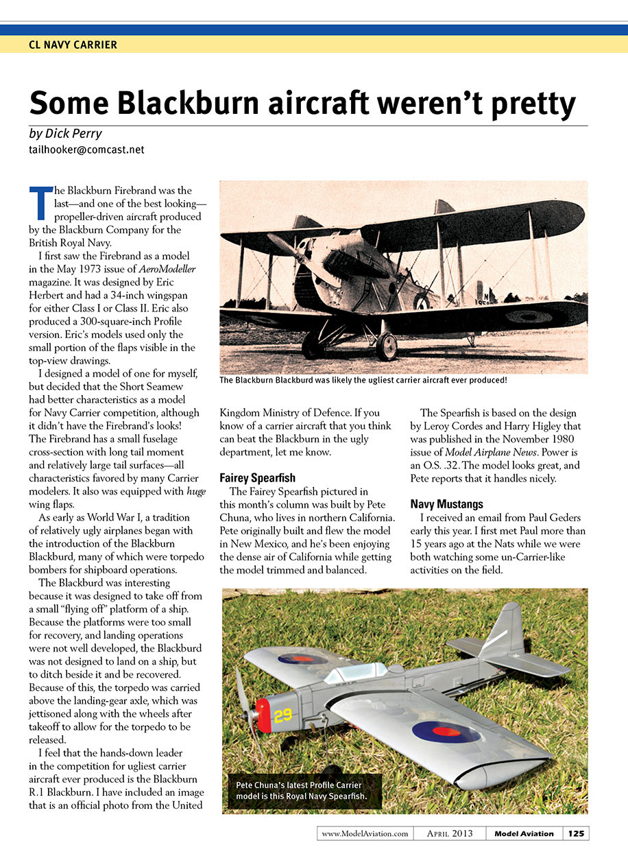 The Fairey Spearfish pictured in this month’s column was built by Pete Chuna, who lives in northern California. Pete originally built and flew the model in New Mexico, and he’s been enjoying the dense air of California while getting the model trimmed and balanced.