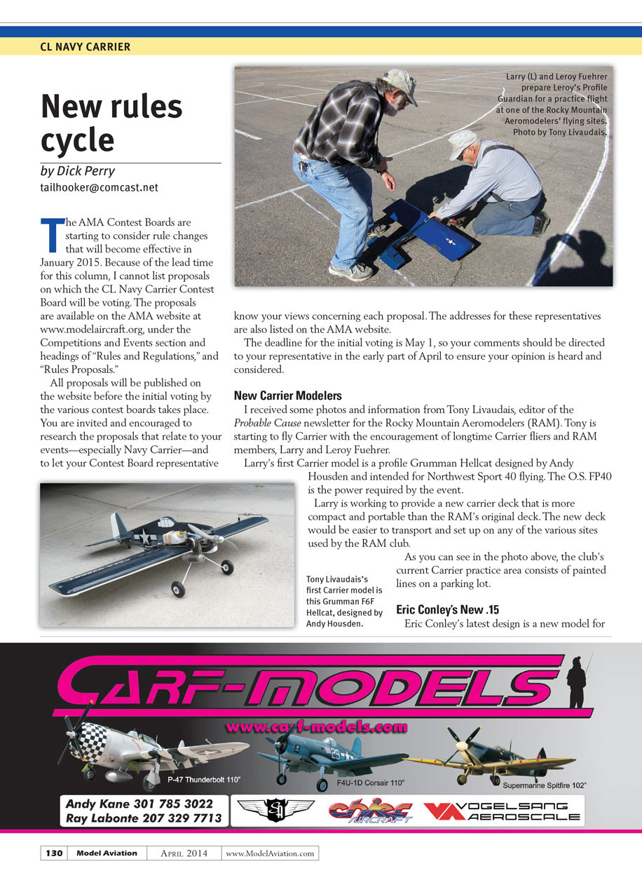 The AMA Contest Boards are starting to consider rule changes that will become effective in January 2015. Because of the lead time for this column, I cannot list proposals on which the CL Navy Carrier Contest Board will be voting. The proposals are available on the AMA website at www.modelaircraft.org, under the Competitions and Events section and headings of “Rules and Regulations,” and “Rules Proposals.”
