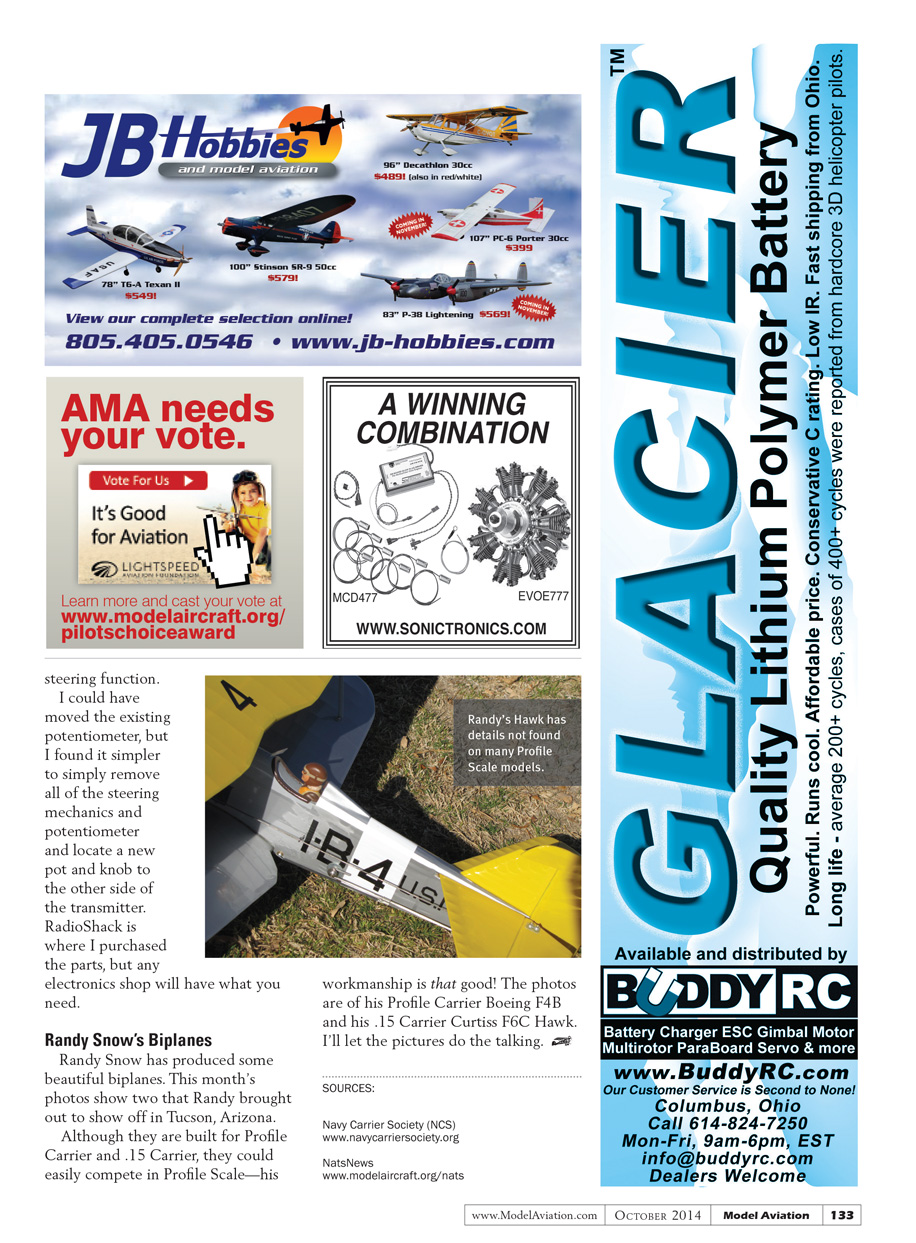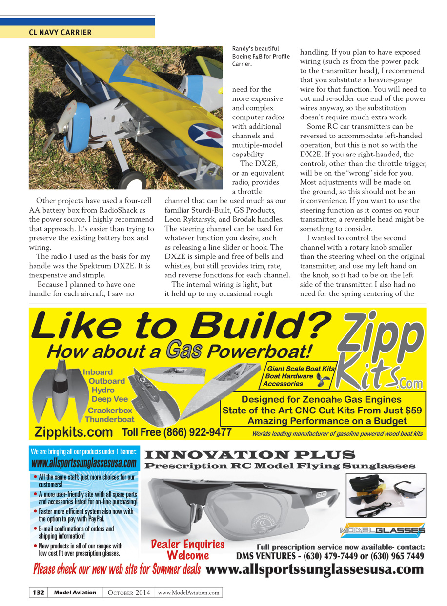 This month’s offerings include some comments about the 2014 Nats, my adventures in producing a control handle with 2.4 GHz radio capability for Carrier, and a couple of gorgeous profile biplanes by Randy Snow.