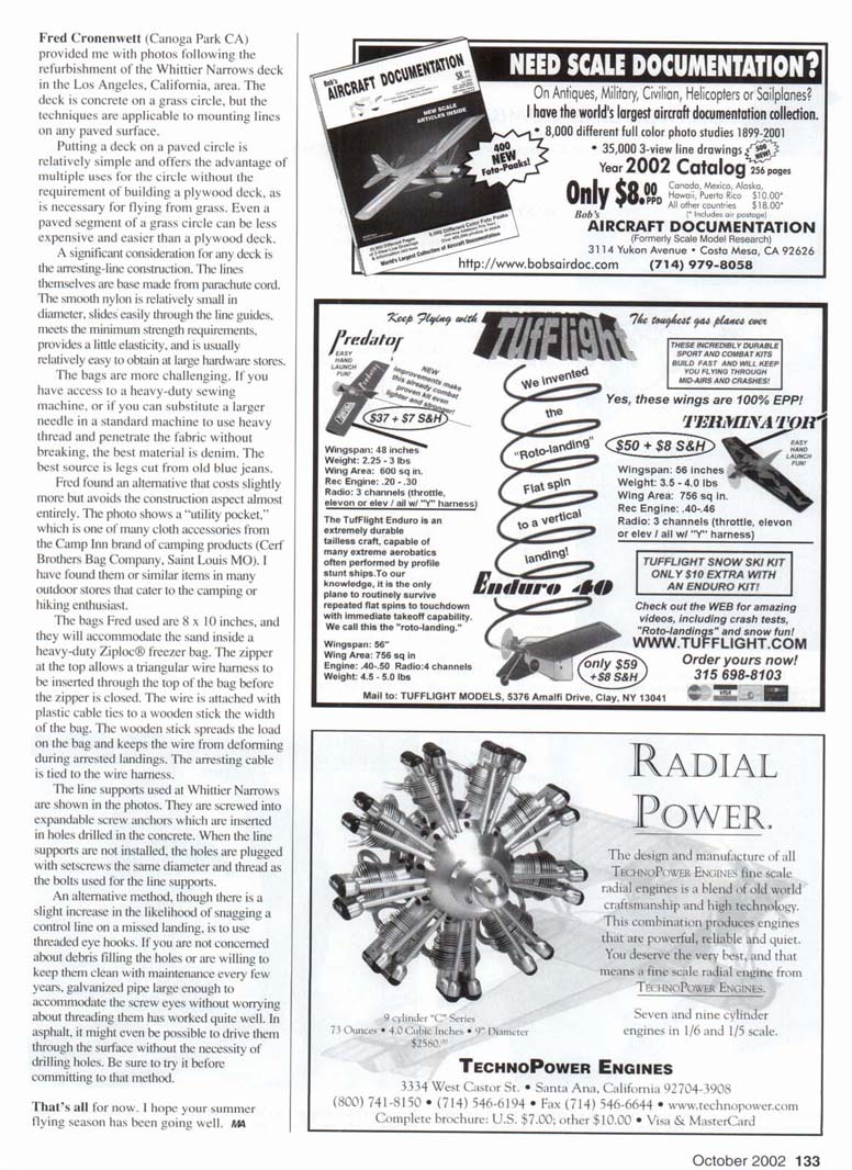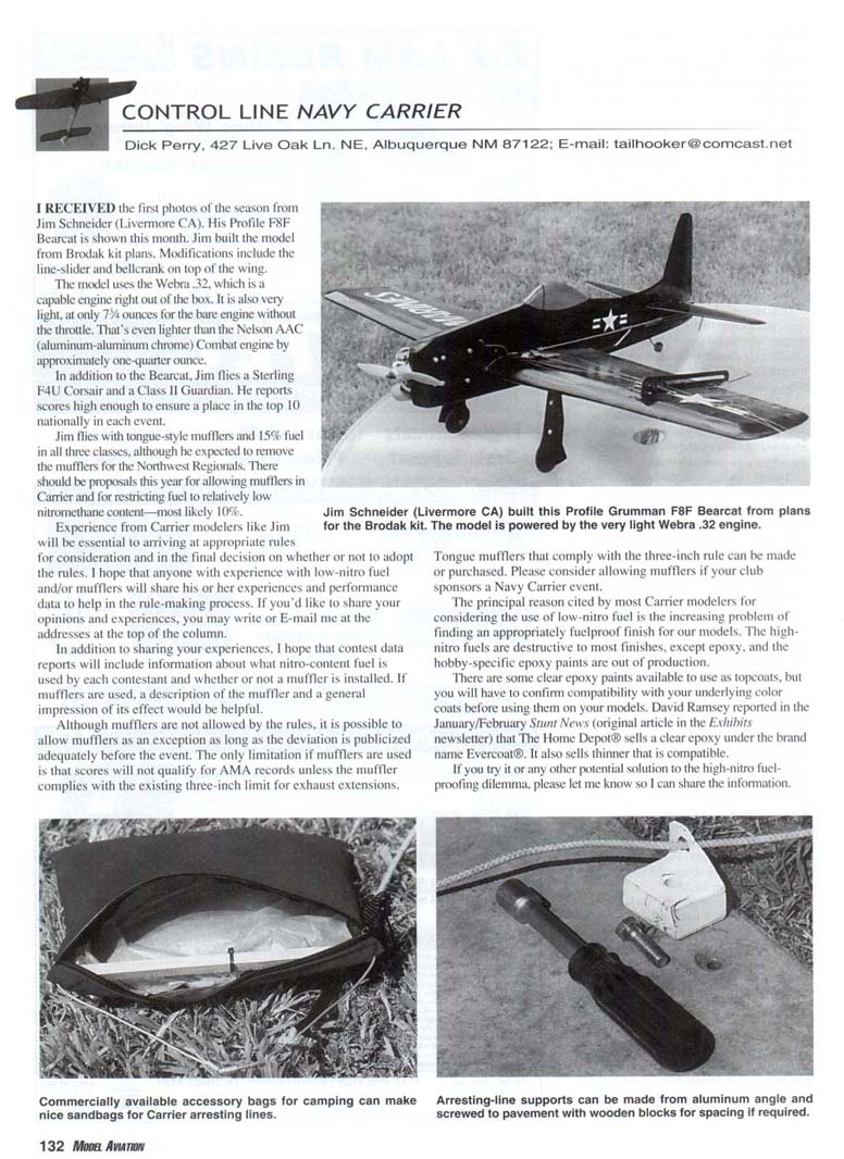 I RECEIVED the first photos of the season from Jim Schneider (Livermore CA). His Profile F8F Bearcat is shown this month. Jim built the model from Brodak kit plans. Modifications include the line-slider and bellcrank on top of the wing. The model uses the Webra 32, which is a capable engine right out of the box. It is also very light, at only 7 3/4 ounces for the bare engine without the throttle. That's even lighter than the Nelson AAC (aluminum-aluminum chrome) Combat engine by approximately one-quarter ounce. In addition to the Bearcat. Jim flies a Sterling F4U Corsair and a Class II Guardian. He reports scores high enough to ensure a place in the top 10 nationally in each event. Jim flies with tongue-style mufflers and 15% fuel in all three classes, although he expected to remove the mufflers for the Northwest Regionals. There should be proposals this year for allowing mufflers in Carrier and for restricting fuel to relatively low nitromethane content—most likely 10%. Experience from Carrier modelers like Jim will be essential to arriving at appropriate rules for consideration and in the final decision on whether or not to adopt the rules. I hope that anyone with experience with low-nitro fuel and/or mufflers will share his or her experiences and performance data to help in the rule-making process. If you'd like to share your opinions and experiences, you may write or E-mail me at the addresses at the top of the column. In addition to sharing your experiences, 1 hope that contest data reports will include information about what nitro-content fuel is used by each contestant and whether or not a muffler is installed. If mufflers are used, a description of the muffler and a general impression of its effect would be helpful. Although mufflers are not allowed by the rules, it is possible to allow mufflers as an exception as long as the deviation is publicized adequately before the event. The only limitation if mufflers are used is that scores will not qualify for AMA records unless the muffler complies with the existing three-inch limit for exhaust extensions. Tongue mufflers that comply with the three-inch rule can be made or purchased. Please consider allowing mufflers if your club sponsors a Navy Carrier event. The principal reason cited by most Carrier modelers for considering the use of low-nitro fuel is the increasing problem of finding an appropriately fuelproof finish for our models. The high-nitro fuels are destructive to most finishes, except epoxy, and the hobby-specific epoxy paints are out of production. There are some clear epoxy paints available to use as topcoats, but you will have to confirm compatibility with your underlying color coats before using them on your models. David Ramsey reported in the January/February Stunt News (original article in the Exhibits newsletter) that The Home Depot® sells a clear epoxy under the brand name Evercoat®. It also sells thinner that is compatible. If you try it or any other potential solution to the high-nitro fuel-proofing dilemma, please let me know so I can share the information. Fred Cronenwett (Canoga Park CA) provided me with photos following the refurbishment of the Whittier Narrows deck in the Los Angeles. California, area. The deck is concrete on a grass circle, but the techniques are applicable to mounting lines on any paved surface. Putting a deck on a paved circle is relatively simple and offers the advantage of multiple uses for the circle without the requirement of building a plywood deck, as is necessary for flying from grass. Even a paved segment of a grass circle can be less expensive and easier than a plywood deck. A significant consideration for any deck is the arresting-line construction. The lines themselves are base made from parachute cord. The smooth nylon is relatively small in diameter, slides easily through the line guides, meets the minimum strength requirements, provides a little elasticity, and is usually relatively easy to obtain at large hardware stores. The bags are more challenging. If you have access to a heavy-duty sewing machine, or if you can substitute a larger needle in a standard machine to use heavy thread and penetrate the fabric without breaking, the best material is denim. The best source is legs cut from old blue jeans. Fred found an alternative that costs slightly more but avoids the construction aspect almost entirely. The photo shows a "utility pocket." which is one of many cloth accessories from the Camp Inn brand of camping products (Cerf Brothers Bag Company, Saint Louis MO). I have found them or similar items in many outdoor stores that cater to the camping or hiking enthusiast. The bags Fred used are 8x10 inches, and they will accommodate the sand inside a heavy-duty Ziploc® freezer bag. The zipper at the top allows a triangular wire harness to be inserted through the top of the bag before the zipper is closed. The wire is attached with plastic cable tics to a wooden stick the width of the bag. The wooden stick spreads the load on the bag and keeps the wire from deforming during arrested landings. The arresting cable is tied to the wire harness. The line supports used at Whittier Narrows are shown in the photos. They are screwed into expandable screw anchors which are inserted in holes drilled in the concrete. When the line supports are not installed, the holes are plugged with setscrews the same diameter and thread as the bolts used for the line supports. An alternative method, though there is a slight increase in the likelihood of snagging a control line on a missed landing, is to use threaded eye hooks. If you are not concerned about debris filling the holes or are willing to keep them clean with maintenance every few years, galvanized pipe large enough to accommodate the screw eyes without worrying about threading them has worked quite well. In asphalt, it might even be possible to drive them through the surface without the necessity of drilling holes. Be sure to try it bef