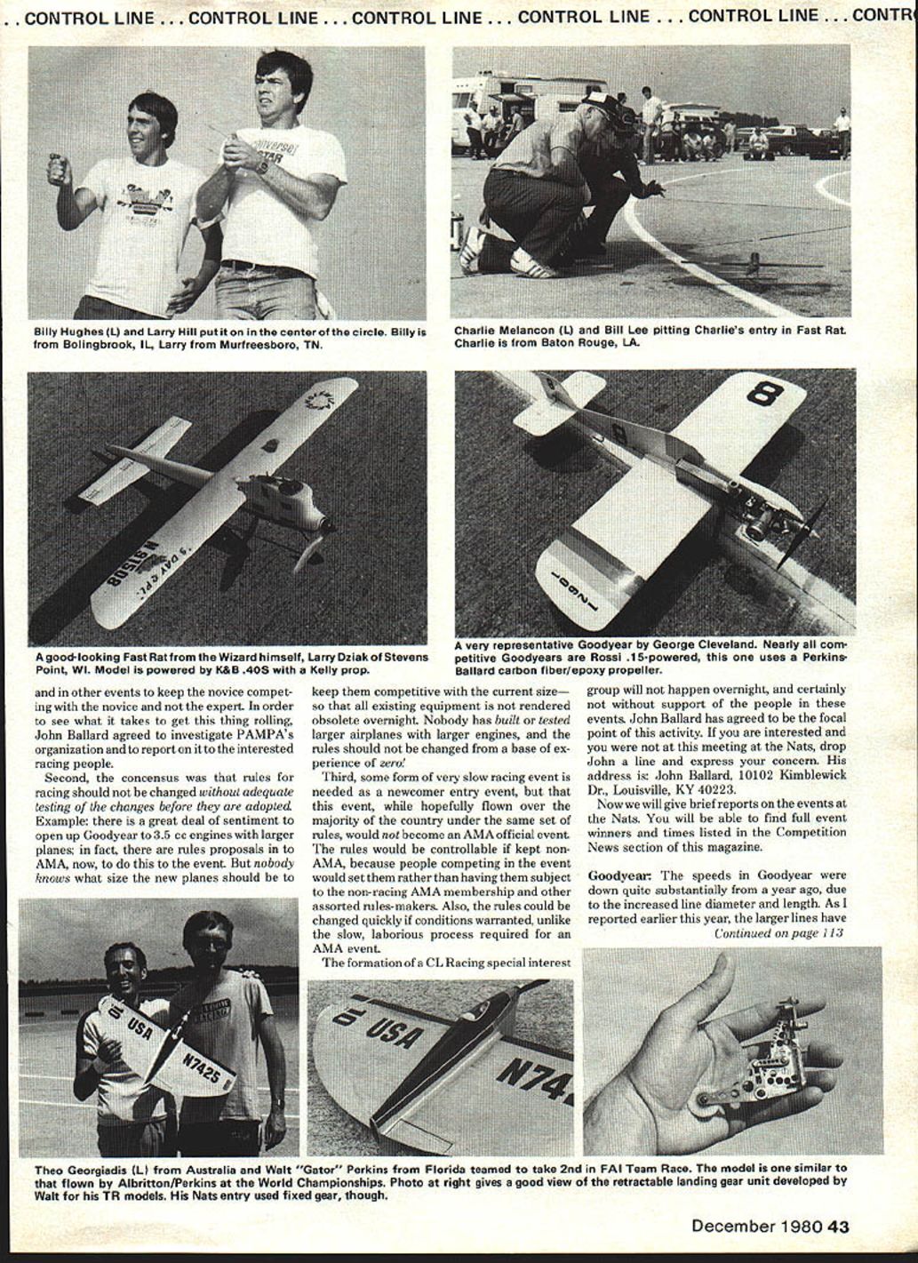 ONTROLLINE.CONTROLLINE.CONTROLLINE.CONTROLLINE..CON[v32][b2005273038520]]CONTROL ii Bill Lee THE real story Racing 1980 Nats must include some items other won what what equipment used First story Nats site itself airbase Wilmington OH active commercial field some old abandoned runways addition active portion Upon arriving Sunday racing competitors found circles laid out abandoned runways bad runways good condition site runway 148 ft wide must put 162-ft circle racing circle painted off edges runway grass side flying over corn side over soy beans other good real problem runway itself rough dirty possible fly circles damaging models concrete old badly broken up cracks between slabs large filled weeds adjacent slabs concrete quite uneven spot racing circle landing aircraft would hit 2-in curb due unevenness slabs Clearly unacceptable situation competi tors went Nats management ultimatum better circles no fliers Now about mile across field large ramp adjacent taxiway RC flight areas located ramp perfect concrete smooth glass clean ramp CL Aerobatics circles placed remaining 80% being allocated parking RC events CL Aerobatics After some discussion between Nats management racing competitors agreed circle could laid out adjacent Stunt circles fliers themselves would have lay out get painted So number us rounded up painting machinery 100ft tape proceeded paint what turned out best racing circle weve seen Nats quite some time circle no practice low entry level racing events turned out just barely adequate second story get-together happened after Rat Race over Thursday becomes apparent time Control Line Racing needs organize some form special interest group along lines PAMPA MACA NMPRA etc need kind organization has two major facets First crying need organization look after interests CL Racing flier dealing AMA its varied forms Example functioning racing organization could have prevented problems Wilmington regards circle layout Second needs some way encouraging increased participation CL Rac ing Example advent PAMPA saw beginning resurgence CL Aerobatics has made event popular CL flying today meeting occurred after Rat may have beginnings such organiza tion name fliers agreeing need Ill summarize some items came meeting First needs skill-level classification CL Racing replace outmoded Jr-Sr-Open age break down technique used PAMPA 42 Model Aviation CL Racing Nasa racing events airector Jim IlIckelts 14 LCS iardue Phil Shew winners PAl Team Race Nats iom i-iuKerI1J rrom uaineviiie iA ia PdbIIUU George Cleveland Ken ner LA Jim ung action auring toodyear bulge Jims left arm battery hot glove Richard Stubblefield looks ion photo .CONTROLLINE.CONTROLLINE.CQNTROLLINE.CONTROLLINE.CO[v32][b202703071530]] other events keep novice compet ing novice expert order see what takes get thing rolling John Ballard agreed investigate PAMPAs organization report interested racing people Second concensus rules racing should changed adequate testing changes before adopted Example great deal sentiment open up Goodyear 35 cc engines larger planes fact rules proposals AMA now to event nobody knows what size new planes should keep competitive current size existing equipment rendered obsolete overnight Nobody has built tested larger airplanes larger engines rules should changed base ex perience zero Third some form very slow racing event needed newcomer entry event event hopefully flown over majority country under same set rules would become AMA official event rules would controllable kept nonAMA because people competing event would set rather having subject non-racing AMA membership other assorted rules-makers Also rules could changed quickly conditions warranted unlike slow laborious process required AMA event formation CL Racing special interest group will happen overnight certainly support people events John Ballard has agreed focal point activity interested meeting Nats drop John line express concern address John Ballard 10102 Kimblewick Dr Louisville KY 40223 Now will give brief reports events Nats will able find full event winners times listed Competition News section magazine Goodyear speeds Goodyear down quite substantially year ago due increased line diameter length As reported earlier year larger lines have Continued page 113 Theo Georgiadis L Australia Walt Gator Perkins Florida teamed take 2nd FAI Team Race model similar flown Albritton/Perkins World Championships Photo right gives good view retractable landing gear unit developed Walt TR models Nats entry used fixed gear though December 1980 43 Billy Hughes L Larry Hill put center circle Billy Bolingbrook IL Larry Murfreesboro TN Charlie Melancon L Bill Lee pitting Charlies entry Fast Rat Charlie Baton Rouge LA guou-uoulung rest irom inc Wizard himself Larry Dziak Stevens Point WI Model powered K&B 40S Kelly prop very representative 2year bl orge Lleveiano Nearly com petitive Goodyears Hossi 15-powered uses Perkins Ballard carbon fiber/epoxy propeller McDonalds last flight down nine points 51300 Werwage score 52526 winbut got 50750 still having some trouble shapes So whole contest boiled down last flight day 78 World Champion Hunt needing big flight Bob put up best scored 50950 fall short over best two rounds 1525 points Les McDonald won first National Championship after being World Champion twice Saturday night banquet attended approximately 80 people short business meeting held Precision Aero batics Model Pilots Association PAMPA Officers elected new year Presi dentKeith Trostle Vice-PresidentArlie Preszler Secretary-TreasurerWynn Paul DirectorsDavid Hemstrought Bob Gieseke Ted Fancher food good speeches short lots awards given out Walker Cup presented new champion Les McDonald Nats CL Racing/Lee Continued page 43 slowed models about second half mile example model year ago reliably mid-14s year mid iSs race times reflect slower speeds Lamberts winning time being little over six minutes Basically event has reached stable position Rossi being competitive motor