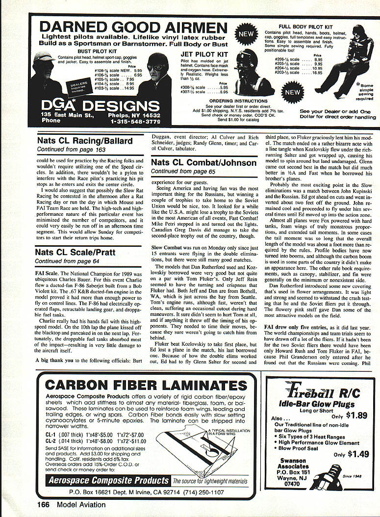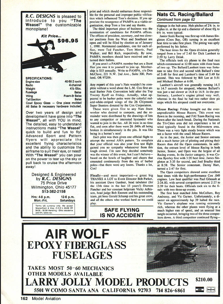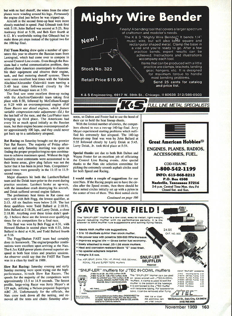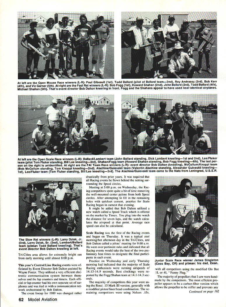 Jimmy has won total four Walker Cups place him second Bob Giesekes five Finally back-to-back victories past two years make him first since Gie seke did trick 1974/75 Stunt fliers hats around country off admiration Jimmys talents hard work perseverance Congratulations Victory did come easy year end Saturdays flyoff top five qualifiers 15 out nearly 1100 points separated first fifth place credentials finalists formid able Four finalists shared honor hav ing won Walker Cup total 10 times including cup since 1981 second-place finisher Bill Werwage third place Paul Walker fifth place Ted Fancher Casale Fourth-place finisher Windy Urtnowski takes back seat no ones record une qualled seven consecutive appearances fi nal five Finally Senior Champion Walker Cup flyoff Contender Nat Gifford brought credible record six consecutive Junior Sen ior National Championships Saturdays fray As historical aside fascinating re alize Bill Werwage came within whisker about five pointsof celebrating thirtieth niversary first Walker Cup victory 1959 winning fourth time himself extreme level competitiveness certainly didnt end top five Kaz Minato Continued page 160 CL Racing John Ballard ITS HISTORY 1989 AMA Nationals held Tn-Cities area Washington State over Nats will certainly go down memorable event competitors traveled East Coast area great Northwest pur sue national competition made drive son averaging approximately 700-800 miles per day across Midwest through semi-arid areas Wyoming Idaho Utah re gions definitely show change scenery typical Midwestern landscape Control Line site located small airport Richland WA provided excel lent surface CL events area selected somewhat remote restroom food facilities adequate Boy Scouts food drink booth featured low prices ran daily throughout competition Speed contestants officials used circles during first part week quite kind allowing Racing people practice circles Wednesday Unfortunately Racing pilots its just little unusual have foreign object such Speed pylon mounted center pilot circle weather remaining four days CL competition quite unusual Midwestern standards Mornings approximately 60O 65 0F very low relative humidity around 40% As sun rose temperature increased rapidly until around 100 pm max tem perature approximately 90 O95 0F made op eration asphalt runways very uncomfort able concerned lack air pollution cloud cover November 1989 61 Mike Rogers Mt Vernon NY finished 10th year former Rookie Year Plane Greenaway-designed Patternmaster power Greenaway-modified ST 60 No George its plane gets appearance points Lovely Svetlana Filipova troop nine Soviet modelers Leningrad attended 89 Nats unique colorful original-design craft flew very well until mysterious control failure caused crash second qualifying flight Sveta continued fly unofficially using Windy Urtnowskis backup model demonstrated Top Twenty calibre unfamiliar aircraft Race officials Wayne Foster L Bob Dal ton used short-range 2-way radios com Bob Fogg won Fast Rat excellent municate both between themselves time 431 Note use ear protectors lap-counters Net background plasticnot rubberrefueling bottle Speed events safety barrierRacing has automatic filler head its delivery events used circles after Speed over tube no protruding quick-fill fuel tank has mar models smooth surface Tn-Cities area allows extremely bright sun early morning until almost 800 pm years Control Line Racing events ficiated Event Director Bob Dalton assisted Wayne Foster utilized very efficient elec tronic communication system between selves lap counters timers offi cial lap counter own separate set ear phones tied communication net work orchestrated Bob Dalton event lineup 1989 changed rather drastically prior years required Racing events flown behind netting sur rounding Speed circles Meeting 500 pm Wednesday Rac ing competitors spent quite bit time removing well-mounted center pylons both Speed circles After attempting fill remaining holes quickset cement practice Scale Racing began earnest evening might added Bob Dalton utilized new watch called Speed Track offered market Timex plug watch distance seven laps watch calcu lates airspeed point Average race speed can also calculated Scale Racing first Racing events began Thursday typical cool morning/hot afternoon day Tn-Cities Bob Dalton called pilots meeting 900 am went over pertinent rules indicated Racing events would take best two pre liminary heat times designate final partici pants event Practice Wednesday early Thursday morning indicated majority Scale Racing enthusiasts running airspeeds 1415-149 seconds Best clockings re ported Fogg/Shahan team 141-143 sec onds majority competitors year us ing Rossi 15 Mark III version generally modified piston/liner/head combination re maining competitors using Nelson competitors using modified Gb Bee IL 4L Funny Plug majority propellers saw hand made competitors efficient pro peller appears carbon-fiber version allows propeller stiffer prevents Continued page 162 62 Model Aviation left Open Mouse Race winners L-R Paul Gibeault 1st Todd Ballard pilot Ballard team2nd Roy Andrassy 3rd Bob Kerr 4th end Vic Garner 5th right Fast Rat winners L-R Bob Fogg 1st Howard Shahan 2nd John Ballard 3rd Todd Ballard 4th Michael Shahan 5th Thats event director Bob Dalton kneeling front Fogg Shahans appear have used near-identical airplanes left Open Scale Race winners L-R Ballard/Lambert team John Ballard standing Dick Lambert kneelingist 2nd Lee/Fluker team pilot Tom Fluker standing Bill Lee kneeling3rd Shahan/Fogg team Howard Shahan standing Bob Fogg kneeling4th last per son right unidentified right FAI Team Race winners L-R event director Bob Dalton kneeling McCollum/Knoppi team Bob McCollum standing Tom Knoppi kneeling2nd Alachine/Guievskii team Valentin Alachine standing Alexander Guiveskii kneeling 1st LeelFluker team Tom Fluker standing Bill Lee kneeling3rd Alachine/Guievskii team came Nats Leningrad USSR Slow Rat winners L-R Larry Dziak Jr 3rd Lar