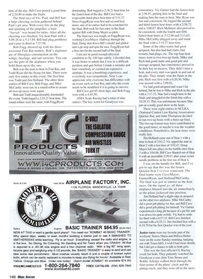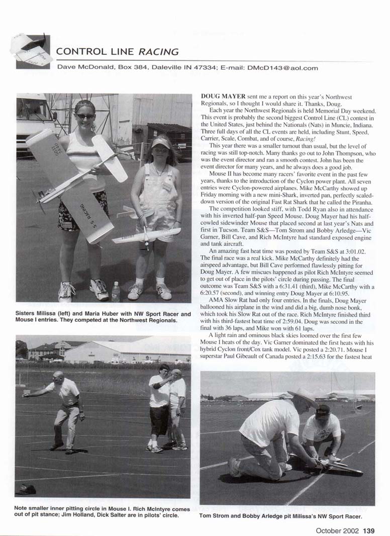 DOUG MAYER sent me a report on this year's Northwest Regionals. so I thought I would share it. Thanks, Doug. Each year the Northwest Regionals is held Memorial Day weekend. This event is probably the second biggest Control Line (CL) contest in the United States, just behind the Nationals (Nats) in Muncie. Indiana. Three full days of all the CL events are held, including Stunt. Speed, Carrier. Scale, Combat, and of course. Racing! This year there was a smaller turnout than usual, but the level of racing was still top-notch. Many thanks go out to John Thompson, who was the event director and ran a smooth contest. John has been the event director for many years, and he always does a good job. Mouse II has become many racers' favorite event in the past few years, thanks to the introduction of the Cyclon power plant. All seven entries were Cyclon-powered airplanes. Mike McCarthy showed up Friday morning with a new mini-Shark, inverted pan, perfectly scaled-down version of the original Fast Rat Shark that he called the Piranha. The competition looked stiff, with Todd Ryan also in attendance with his inverted half-pan Speed Mouse. Doug Mayer had his half-cowled sidewinder Mouse that placed second at last year's Nats and first in Tucson. Team S&S—Tom Strom and Bobby Arledge—Vic Garner. Bill Cave, and Rich Mclntyre had standard exposed engine and tank aircraft. An amazing fast heat time was posted by Team S&S at 3:01.02. The final race was a real kick. Mike McCarthy definitely had the airspeed advantage, but Bill Cave performed flawlessly pitting for Doug Mayer. A few miscues happened as pilot Rich Mclntyre seemed to get out of place in the pilots' circle during passing. The final outcome was Team S&S with a 6:31.41 (third), Mike McCarthy with a 6:20.57 (second), and winning entry Doug Mayer at 6:10.95. AMA Slow Rat had only four entries. In the finals, Doug Mayer ballooned his airplane in the wind and did a big. dumb nose bonk, which took his Slow Rat out of the race. Rich Mclntyre finished third with his third-fastest heat time of 2:59.04. Doug was second in the final with 36 laps, and Mike won with 61 laps. A light rain and ominous black skies loomed over the first few Mouse I heats of the day. Vic Garner dominated the first heats with his hybrid Cyclon front/Cox tank model. Vic posted a 2:20.71. Mouse I superstar Paul Gibeault of Canada posted a 2:15.63 for the fastest heat time of the day. Bill Cave posted a good time of 2:24.80 to make the finals. The final race of Vic. Paul, and Bill had a large cheering section gathered behind Paul's pit area. With every fire on the plug and spinning of the propeller, a loud "hurrah" was heard for miles. After all the cheering was finished, Vic beat Paul with a 5:09.26 to a 5:17.89. Bill had plug problems and came in third at 7:37.96. Bob Fogg showed up with his three awesome Fast Rat models. Bob's airplanes are of fiberglass construction on the wings, fuselage, and tail sections. You can see the guts of the airplanes when you hold them up to the sun. Bob was the man to beat in Fast Rat, and Todd Ryan did the flying for him. There were only five entries in this event. The first heat was Todd and Jim Holland. The other three entries of Bill Cave, Bob Fogg, and Mike McCarthy were run in a round-robin to assure all two-up races were equal. Bob and Todd unquestionably dominated the event. Todd logged a 2:24.21 heat time. The round-robins were the same, with Fogg/Ryan dominating. Bob logged a 2:18.21 heat time for the fastest heat of the day. Bill Cave had a respectable third-place heat time of 2:31.27. Since Fogg/Ryan won first and second heat times, one of its entries had to be scratched for the final. Bob took his fast entry to the final against Bill with Doug Mayer as pilot. The final race was tough, as Fogg/Ryan was working Cave/Mayer. Halfway through the final. Doug shut down Bill's model and glided into a pit stop and quit the race. Fogg/Ryan had a free run for the second half of the final. I am not in good enough physical condition to fly 140 laps safely. I decided that it was better to admit that I was in a difficult position and quit before I made a mistake and hurt somebody or crashed an expensive airplane. It was a humbling experience, and everybody was sympathetic. Now I can appreciate why everyone has difficulties with an event such as Fast Rat, and why the event needs to be modified if it is going to survive. Bill Cave got 65 short laps, and Bob Fogg won with a 4:45.50. AMA Scale Racing had a total of nine entries. The key word for Goodyear was consistency. Vic Garner had the fastest heat at 2:56.91. putting him in the final and making him the man to beat. Mac Ryan was fast and consistent. He logged the second and third fastest heat times with a 2:58.72 and a 3:00.87. Rich Mclntyrc also proved to be consistent, with the fourth and fifth fastest heat times at 3:12.66 and 3:11.63. Mike McCarthy plugged away and made the final with a 3:19.27 heat time. Some of the other teams had great airspeed, but also had bad starts, bad restarts, bad plugs, etc. The top four heat times went to two two-up finals. Mike and Rich had good starts and good pits and average airspeed, but consistency proved to be their key to success. They didn't miss a beat, and every start was quick in and out of the pits. They simply won the finals in the pits. Rich was first with a 6:26.56. Mike was second with a 7:09.02. Vic had good airspeed and wasn't far behind, but he lost to Mike and Rich in the pits with a 7:17.32. Mac had a tough time in the finals and struggled to the finish line with a 10:29.37. This was unfortunate because Mac put on a really good show in the heats. There were eight entries in NCLRA (National Control Line Racing Association) Quickie Rat, and John Thompson decided to run two-up heats with a three-up final. The two-up format may have contributed to the good times, or maybe it was the weather conditions. Nonetheless, the heat times were really fast. Jim