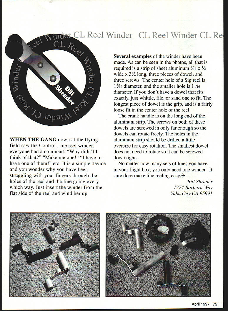t$ THE GANG down flying field saw Control Line reel winder everyone comment didnt think Make have have etc simple device wonder have struggling fingers through holes reel line going way Just insert winder flat side reel wind up Several examples winder have made As can seen photos required strip sheet aluminum A6 X 1/2 wide x 3 long three pieces dowel three screws center hole Sig reel 13A6 diameter smaller hole 1 /i6 diameter dont have dowel fits exactly just whittle file sand fit longest piece dowel grip fairly loose fit center hole reel crank handle long end aluminum strip screws both dowels screwed far enough dowels can rotate freely holes aluminum strip should drilled little oversize easy rotation smallest dowel does need rotate can screwed down tight No matter sets lines have flight box need winder sure does make line reeling easy Bill Shrader 1274 Barbara Way Yuba City CA 9599] April 1997 75