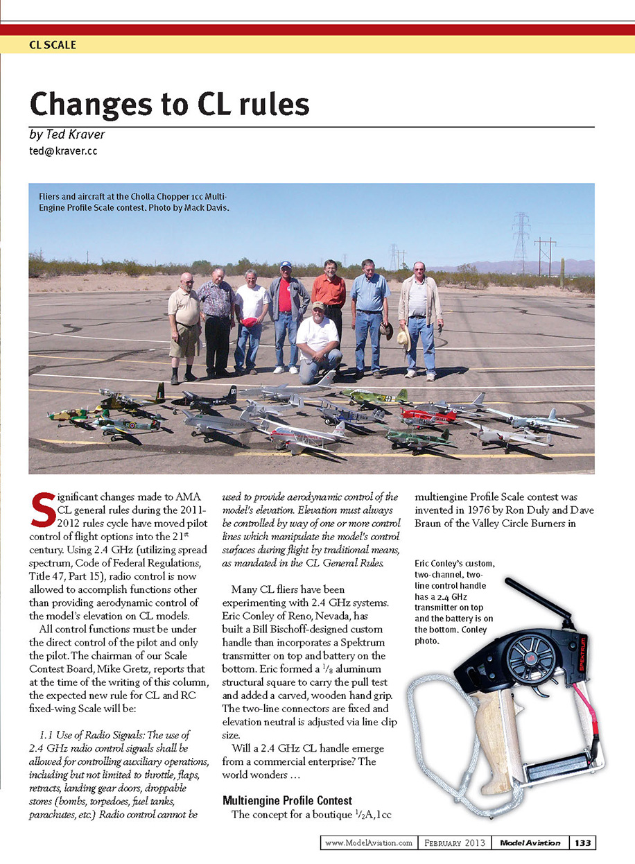 Signifi cant changes made to AMA CL general rules during the 2011-2012 rules cycle have moved pilot control of fl ight options into the 21st century. Using 2.4 GHz (utilizing spread spectrum, Code of Federal Regulations, Title 47, Part 15), radio control is now allowed to accomplish functions other than providing aerodynamic control of the model’s elevation on CL models. All control functions must be under the direct control of the pilot and only the pilot. The chairman of our Scale Contest Board, Mike Gretz, reports that at the time of the writing of this column, the expected new rule for CL and RC fi xed-wing Scale will be:1.1 Use of Radio Signals: The use of 2.4 GHz radio control signals shall be allowed for controlling auxiliary operations, including but not limited to throttle, aps, retracts, landing gear doors, droppable stores (bombs, torpedoes, fuel tanks, parachutes, etc.) Radio control cannot be used to provide aerodynamic control of the model’s elevation. Elevation must always be controlled by way of one or more control lines which manipulate the model’s control surfaces during ight by traditional means, as mandated in the CL General Rules. Many CL fl iers have been experimenting with 2.4 GHz systems. Eric Conley of Reno, Nevada, has built a Bill Bischoff-designed custom handle than incorporates a Spektrum transmitter on top and battery on the bottom. Eric formed a 1/8 aluminum structural square to carry the pull test and added a carved, wooden hand grip. The two-line connectors are fi xed and elevation neutral is adjusted via line clip size. Will a 2.4 GHz CL handle emerge from a commercial enterprise? The world wonders …Multiengine Profi le Contest The concept for a boutique 1/2A,1cc Changes to CL rulesby Ted Kraverted@kraver.ccexperimenting Eric Conley’s custom, two-channel, two-line control handle has a 2.4 GHz transmitter on top and the battery is on the bottom. Conley photo.Fliers and aircra at the Cholla Chopper 1cc Multi-Engine Pro le Scale contest. Photo by Mack Davis.multiengine Profi le Scale contest was invented in 1976 by Ron Duly and Dave Braun of the Valley Circle Burners in 133Model Aviation FEBRUARY 2013www.ModelAviation.comCL SCALE133