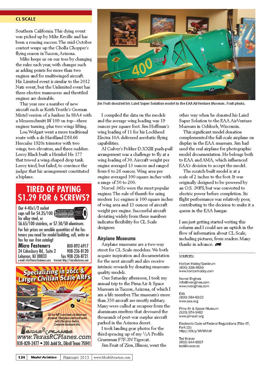Southern California. This dying event was picked up by Mike Keville and has been a rousing success. The mid-October contest wraps up the Cholla Chopper’s flying season in Tucson, Arizona. Mike keeps us on our toes by changing the rules each year, with changes such as adding points for more than two engines and for multiwinged aircraft. His Limited event is similar to the 2012 Nats event, but the Unlimited event has three elective maneuvers and throttled engines are desirable. This year saw a number of new aircraft such as Keith Trostle’s German Mistel version of a Junkers Ju 88A4 with a Messerschmitt Bf 109 on top—three engines turning, plus two wings lifting. Lou Wolgast went a more traditional route with a de Havilland DH.66 Hercules 1920s trimotor with two wings, two elevators, and three rudders. Leroy Black built a Heinkel He 177 that towed a wing-shaped drop tank. Leroy tried, but failed, to convince the judges that his arrangement constituted a biplane. Jim Fruit donated his Laird Super Solution model to the EAA AirVenture Museum. Fruit photo. I compiled the data on the models and the average wing loading was 19 ounces per square foot. Jim Hoffman’s wing loading of 11 for his Lockheed Electra 10A delivered aerobatic flying capabilities. Al Culver’s Fokker D.XXIII push-pull arrangement was a challenge to fly at a wing loading of 30. Aircraft weight per engine averaged 13 ounces and ranged from 6 to 26 ounces. Wing area per engine averaged 100 square inches with a range of 50 to 200. Norvel .061s were the most popular engines. The rule of thumb for using modern 1cc engines is 100 square inches of wing area and 13 ounces of aircraft weight per engine. Successful aircraft deviating widely from these numbers indicates flexibility for CL Scale designers. Airplane Museums Airplane museums are a two-way street for CL Scale modelers. We both acquire inspiration and documentation for the next aircraft and also receive intrinsic rewards by donating museum-quality models. One Saturday afternoon, I took my annual trip to the Pima Air & Space Museum in Tucson, Arizona, of which I am a life member. The museum’s more than 350 aircraft are mostly military. Many were culled as escapees from the aluminum smelters that devoured the thousands of post-war surplus aircraft parked in the Arizona desert. I took landing gear photos for the third sprucing up of my 1/2A Profile Grumman F7F-3N Tigercat. Jim Fruit of Zion, Illinois, went the other way when he donated his Laird Super Solution to the EAA AirVenture Museum in Oshkosh, Wisconsin. This significant model donation complemented the full-scale airplane on display in the EAA museum. Jim had used the real airplane for photographic model documentation. He belongs both to EAA and AMA, which influenced EAA’s decision to accept the model. The scratch-built model is at a scale of 2 inches to the foot. It was originally designed to be powered by an O.S. .90FS, but was converted to electric power before completion. Its flight performance was relatively poor, contributing to the decision to make it a queen in the EAA hangar. I am just getting started writing this column and I could use an uptick in the flow of information about CL Scale, including pictures, from readers. Many thanks in advance. SOURCES: Horizon Hobby/Spektrum (800) 338-4639www.horizonhobby.com Norvel Engines info@nvengines.comwww.nvengines.com EAA(800) 564-6322www.eaa.org Pima Air & Space Museum (520) 574-0462www.pimaair.org Electronic Code of Federal Regulations (Title 47, Part 15)http://bit.ly/WVWVkW Ted Kraver(602) 944-8557ted@kraver.cc 134Model Aviation February 2013www.ModelAviation.comCL SCALE133