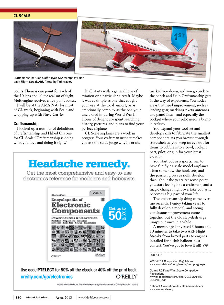 The CL Scale Task Force (CLSFT) was formed at the July 2012 AMA Nats during a meeting attended by most of the CL Scale contestants. The task force has been hard at work in the past months studying the entire body of rules that address CL Scale: General, CL General, and CL Scale. The current 2013-2014 rules can be found at the AMA website, listed in “Sources.” CL Scale rules are currently within the PDF document titled, 2013-2014 RC - CL Scale.