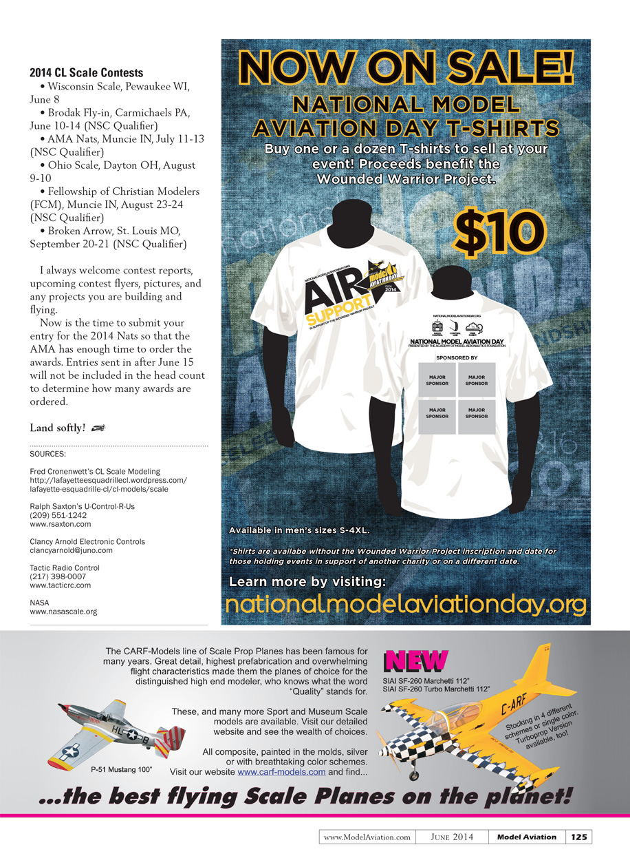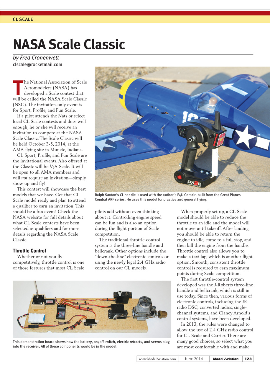 If a pilot attends the Nats or select local CL Scale contests and does well enough, he or she will receive an invitation to compete at the NASA Scale Classic. The Scale Classic will be held October 3-5, 2014, at the AMA flying site in Muncie, Indiana.