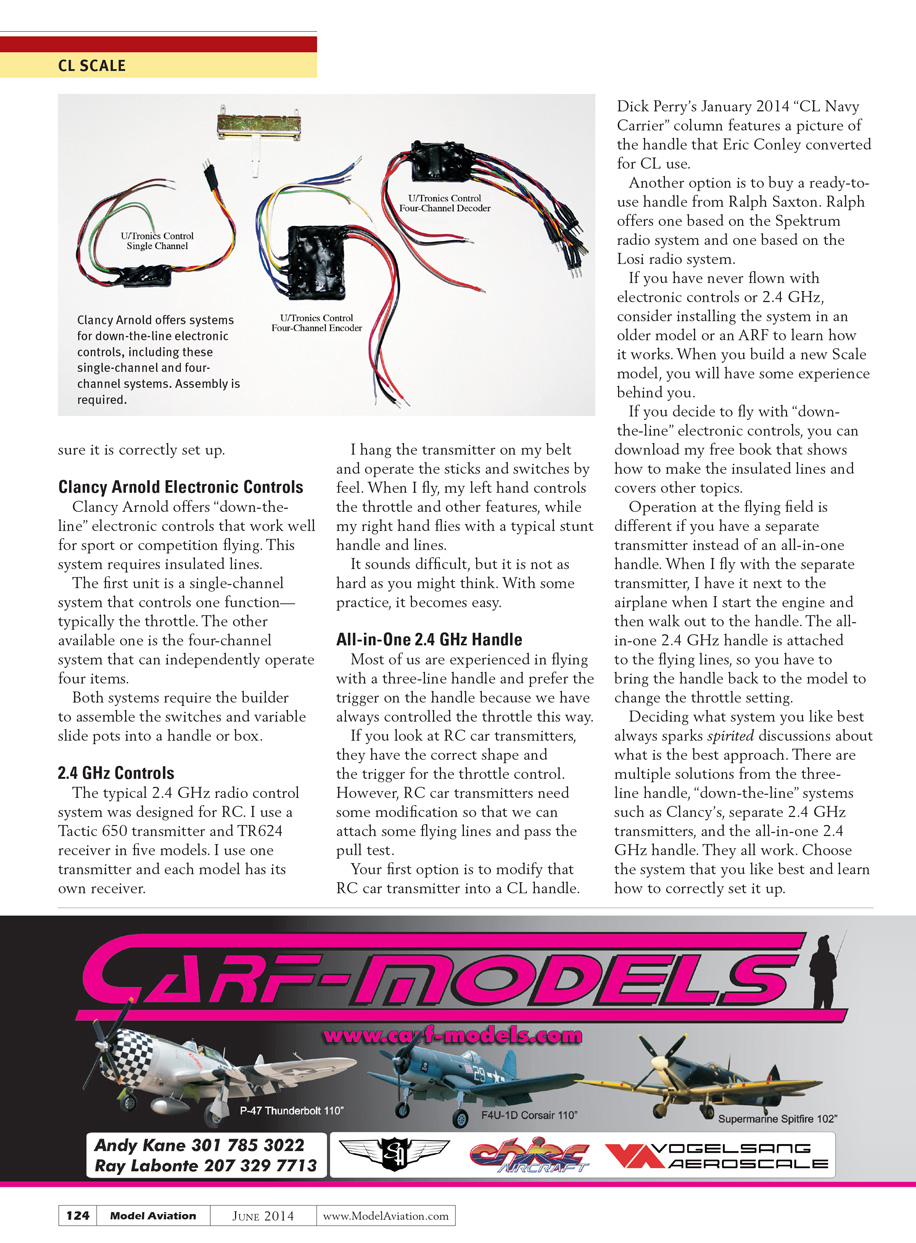 Clancy Arnold offers “down-the-line” electronic controls that work well for sport or competition flying. This system requires insulated lines.