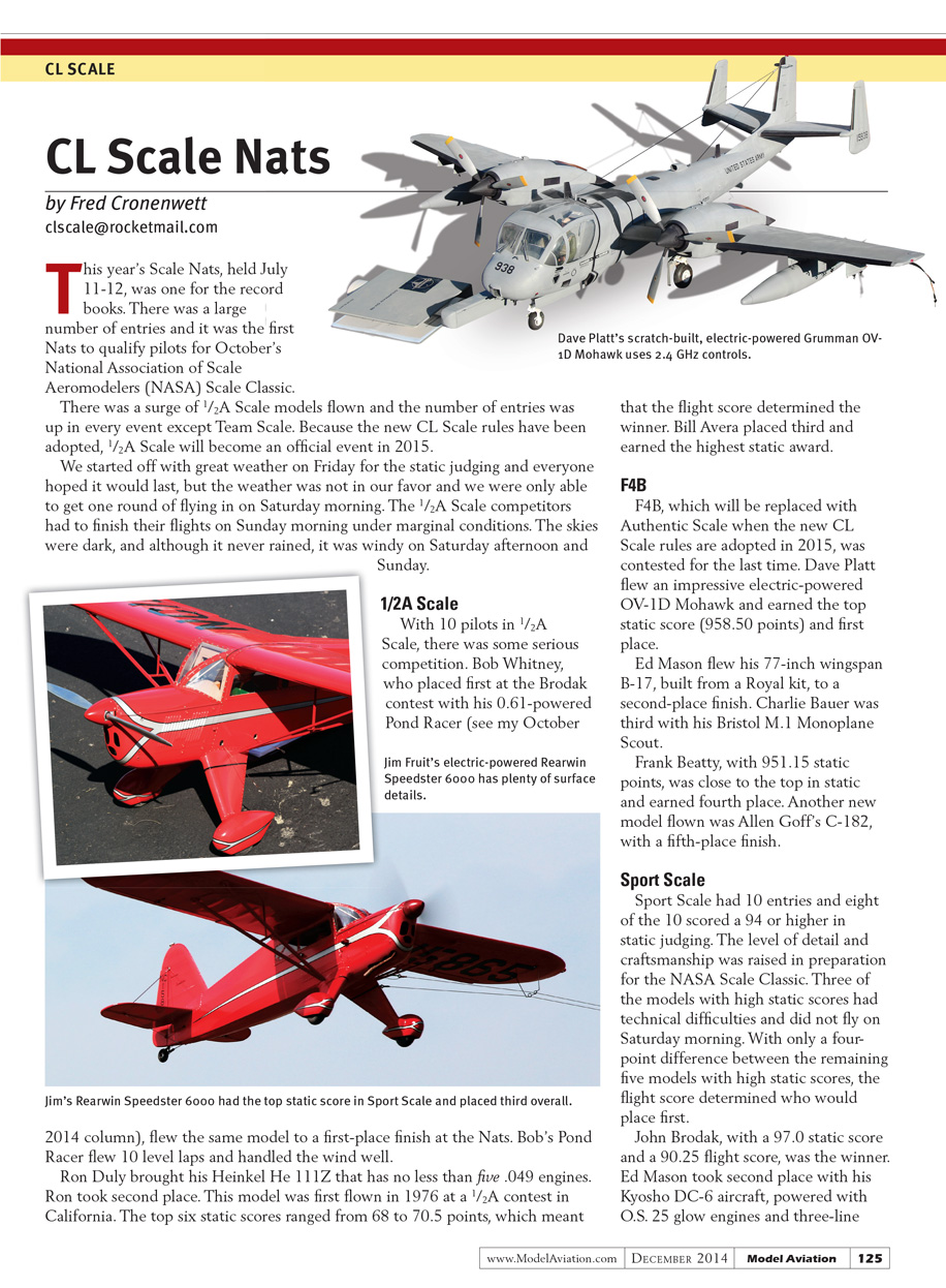 F4B, which will be replaced with Authentic Scale when the new CL Scale rules are adopted in 2015, was contested for the last time. Dave Platt flew an impressive electric-powered OV-1D Mohawk and earned the top static score (958.50 points) and first place.