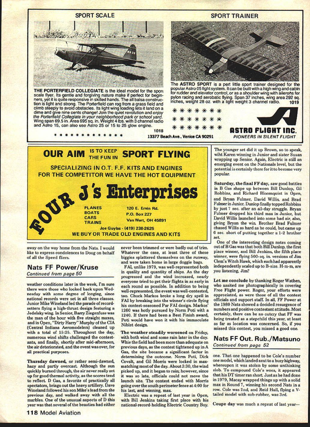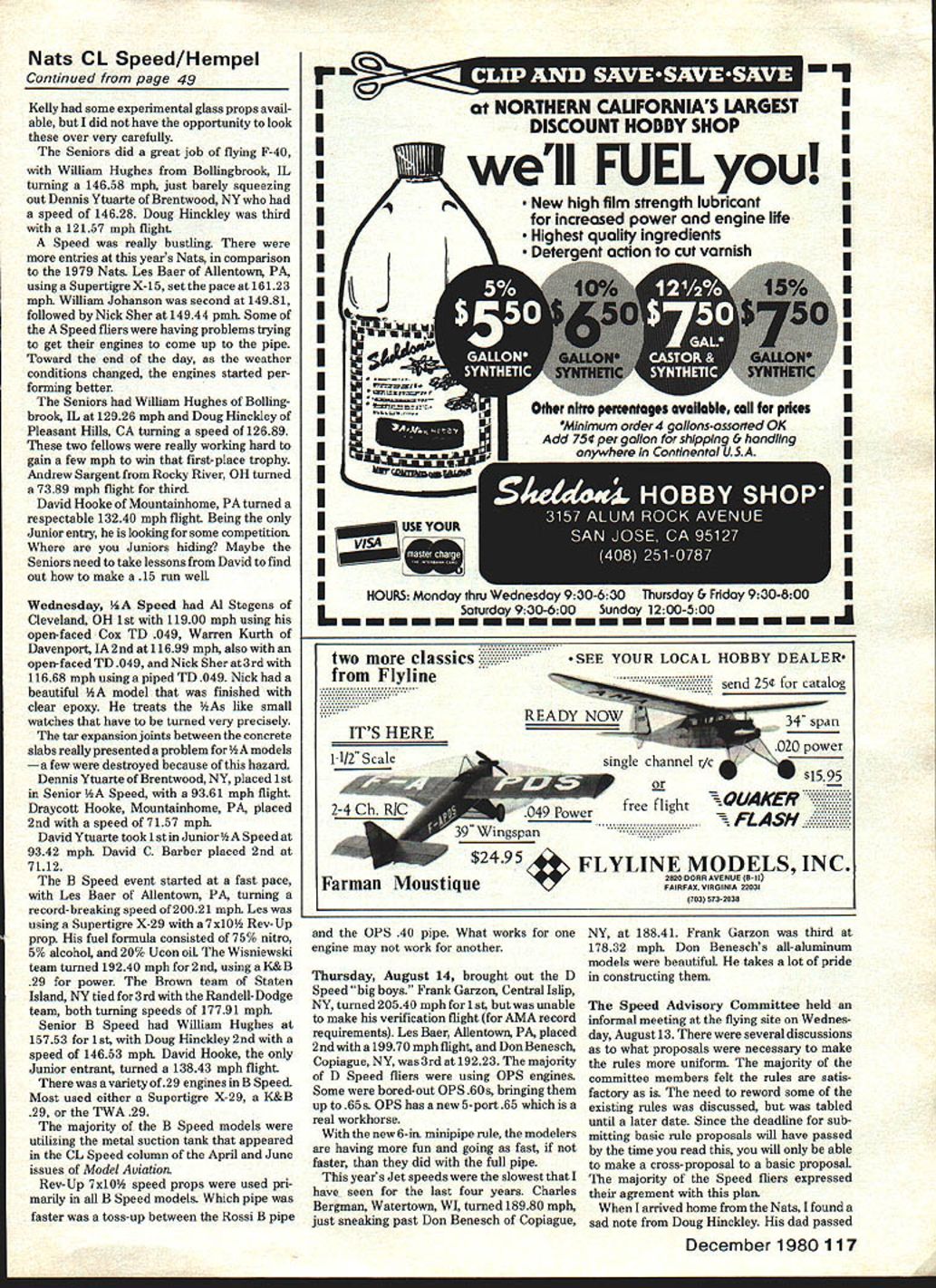 CONTROLLINE.CONTROLLINE.CONTROLLINE.CONTROL LINE. CONTROL LINE.CONTR CL Speed Gene Hem pet SOMETIMES forget express appre ciation thanks helped execute administer Speed events wasnt Nats volunteers run things would no Nats Speed event director year Bob Voislavek Bob Sargent assistant years Nats site Speed poor due conditions flying circles Before flying could begin tar strips chipped away expansion joints large cracks filled plaster make surface acceptable flying everyone working hard clear flying circles certain amount joking griping going wonderful opportunity everyone assemble together swap ideas war stories Lets move bustling activity Tuesday August 12 FAI Formula 40 Speed FAI Speed Charles Lieber Morristown NJ member American FM team turned record-breaking speed 16221 mph 1st Sam Burke Ontario CN member Canadian FM team 14746 team Randell-Dodge close behind speed 13877 mph would like congratulate Charles Lieber Sam Burke fine job have done supporting FAI Speed really takes dedi cated modeler fly event Senior flew FM Speed Doug Hiockley Pleasant Hills CA clocked 13451 mph Since Dougs last year Senior really worked hard break Senior FAI record Maybe can still before year over majority FAd Speed modelers used Rossi 15 Carl Dodge used homebuilt 15 photo shows bis workman ship beautifuL Since Rossi factory supplying 15s present future FM fliers may have use either Cox 15s homebuilt really presents problem Speed fliers certainly hope engine manufacturers will come aid supply some good 15s years Formula 40 event used new fuel restriction 40% nitro 40% alcohol 20% oiL beginning everyone thought would slow speeds down somewhat worked hard make engines run appears speeds obtained fuel restriction presented little hardship Glenn Lee Batavia IL proved turning screaming 15762 mph 1st unable make verification flight AMA record burned up three engines trying Wisniewski team Bellflower CA came close withal5339 mphflight Nick Sher Langhorne PA third 15025 speeds F-40 relatively close K&B 65 engine dominating event majority F-40 fliers using different types glass props few home made glass props use contestants used Kelly 8x8 8x7 props Continued page 117 December 1980 49 Don Beneschs all-aluminum Jet model read ied launch Dons flight 18840 mph took 2nd Open Copiague NY Charles Uergman Watertown WI processes Jet Speed model before winning Open speed 18980 mph Al Stegens Cleveland OH latin open hA Speed model 11900 mph powered open-faced Cox TD 049 Les Baer Allentown PA placed 2nd 0 Speed 19970 mph Don Benesch assists battery leads Les prepares launch Frank Garzon Central Islip NY tweaks needle D Speed-winner prior making 20540 mph flight Randell/Dodge team flew FlASpeed Carl Dodges homebuilt 15s placed 3rd Open ati 3877 mph model appearsto very conventional design event Nats CL Speed/Hempel Continued page 49 Kelly some experimental glass props avail able did have opportunity look over very carefully Seniors did great job flying F-40 William Hughes Bollingbrook IL turning 14658 mph just barely squeezing out Dennis Ytuarte Brentwood NY speed 14628 Doug Hinckley third 12157 mph flight Speed really bustling entries years Nats comparison 1979 Nats Les Baer Allentown PA using Supertigre X-15 set pace 16123 mph William Johanson second 14981 followed Nick Sher 14944 pmh Some Speed fliers having problems trying get engines come up pipe Toward end day weather conditions changed engines started per forming better Seniors William Hughes Ballingbrook IL 12926 mph Doug Hinckley Pleasant Hills CA turning speed 12689 two fellows really working hard gain few mph win first-place trophy Andrew Sargent Rocky River OH turned 7389 mph flight third David Hooke Mountainhome PA turned respectable 13240 mph flight Being Junior entry looking some competition Juniors hiding Maybe Seniors need take lessons David find out make 15 run welL Wednesday d Al Stegens Cleveland OH 1st 11900 mph using open-faced Cox TD 049 Warren Kurth Davenport IA2ndat1l699 mph also open-faced TD 049 Nick Sher at3rd 11668 mph using piped TD 049 Nick beautiful l finished clear epoxy treats As like small watches have turned very precisely tar expansion joints between concrete slabs really presented problem models few destroyed because hazard Dennis Ytuarte Brentwood NY placed 1st Senior Speed 9361 mph flight Draycott Hooke Mountainhome PA placed 2nd speed 7157 mph David Ytuarte took 1st JuniorA Speed 9342 mph David C Barber placed 2nd 7112 B Speed event started fast pace Les Baer Allentown PA turning record-breaking speed 20021 mph Les using Supertigre X-29 7x10 Rev-Up prop fuel formula consisted 75% nitro 5% alcohol 20% Ucon oil Wisniewski team turned 19240 mph for2nd using aK&B 29 power Brown team Staten Island NY tied for3rd Randell-Dodge team both turning speeds 17791 mph Senior B Speed William Hughes 15753 1st Doug Hinckiey 2nd speed 14653 mph David Hooke Junior entrant turned 13843 mph flight variety of29 engines B Speed Most used either Supettigre X-29 K&B 29 TWA 29 majority B Speed models utilizing metal suction tank appeared CL Speed column April June issues Model Aviation Rev-Up 7x10 speed props used pri marily B Speed models Which pipe faster toss-up between Rossi B pipe NORTHERN CALIFORNIAS LARGESTU DISCOUNT HOBBY SHOPI I V well FUELyou New high film strength lubricantU increased power engine lifeI Highest edientsI u Deteiction cut varnish I II II II II II II II II II IHOURS Monday thru Wednesday 930-630 Thursday & Friday 930-800 L inin Saturday 930-600 Sunday 1200-500 two classics Flyline Farman Moustique SEE YOUR LOCAL HOBBY DEALER send 25t catalog _____________34 span power SiS 95 Powerfree flight 4OUAKER FLASH 39 Wingspan $2495 FLYLINE MODELS INC 2820 DORR AVENUE B ii FAIRFAX VIRGINIA 22031 703 573-2038 OPS 40 pipe What works engine may work another Thursday August 14 brought out D Speed big boys Frank Garzon Central islip NY turned 20540 mph 1 butwas unable make verification flight AMA record requirements Lea Baer Allentown PA placed 2nd 19
